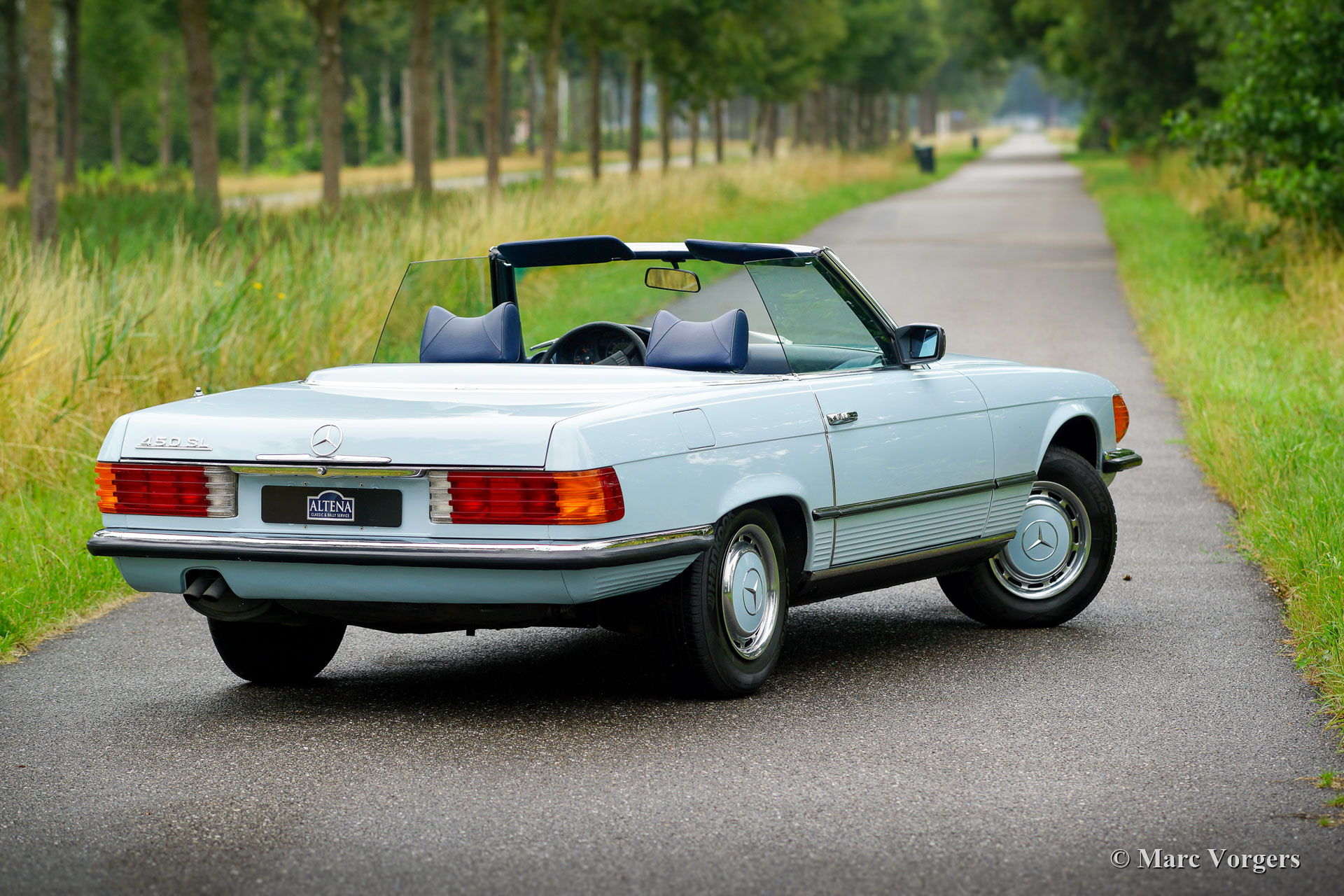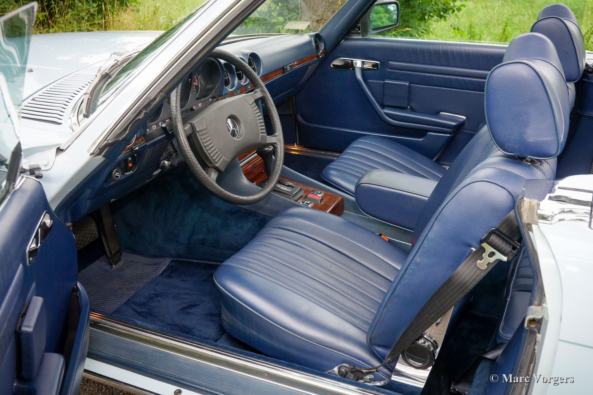 Mercedes-Benz 450 SL (R107 series), year 1979. Matching numbers and colours, the car is exactly as it left the factory. Colour Pastel Blue combined with a dark blue interior. Dark blue soft-top and hard top! This fantastic Mercedes 450 SL was sold new in California, USA. The car was purchased from the daughter of the first owner recently, and then shipped to the Netherlands. From new this fine 450 SL has driven only 77.000 miles. The Mercedes was perfectly serviced over the years, this beauty is in superb original condition (concours)! Wherever you look, the car is perfectly original into the smallest detail. The car is currently fitted with the beautiful slim chrome European bumpers. The dark blue soft-top is in like new condition as is the original dark blue hard top! All the original factory decals are still present, and the spare wheel is still unused. This 450 SL comes complete with the original toolset, crick and the very rare (child) seats in the back. Furthermore, the car features power steering and air-conditioning. This fine automobile can be imported in any European country. A superb specimen!
