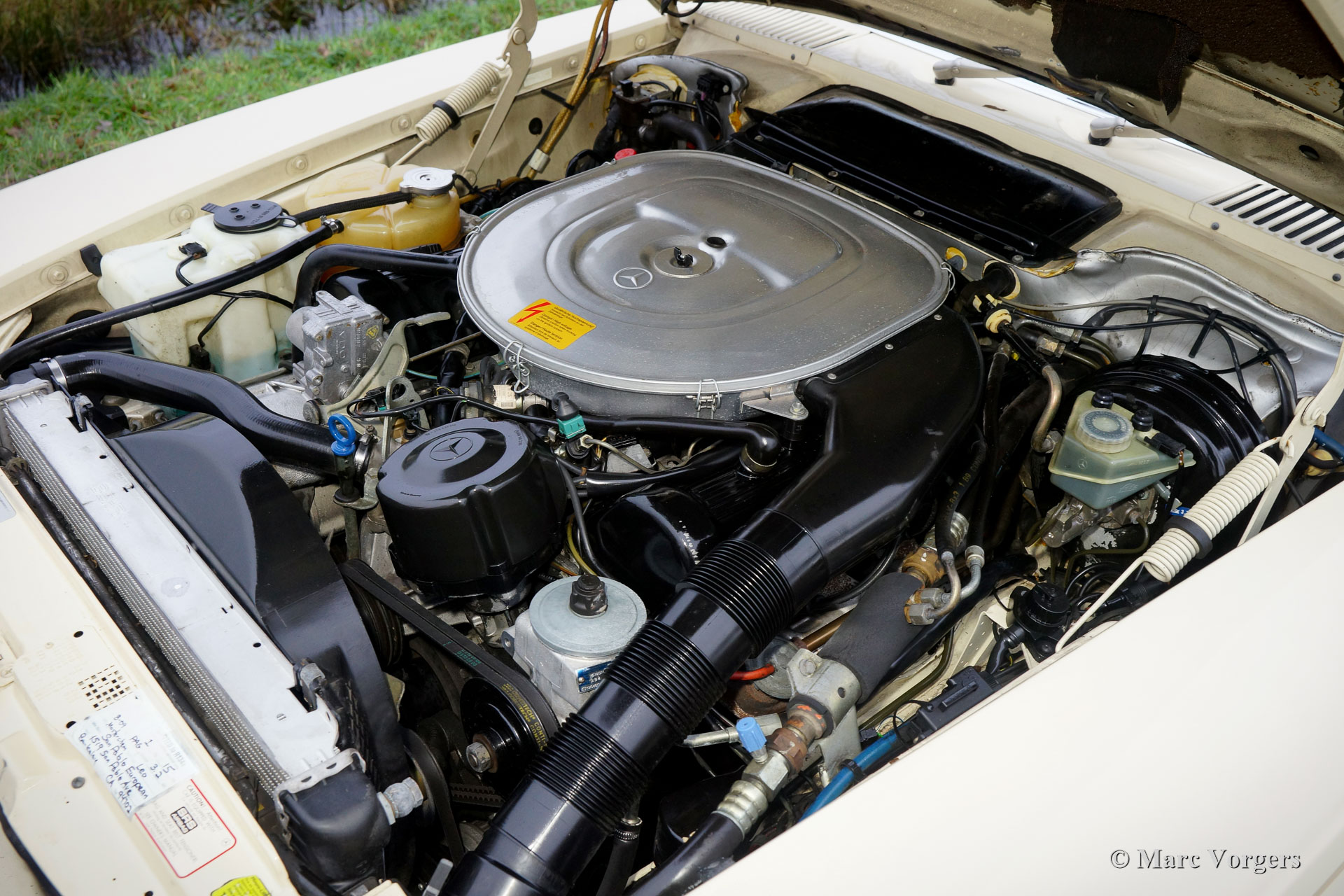 The Mercedes 280 SL, 350 SL, 450 SL and 560 SL (the latter for the US market only) are the successors of the 230 SL, 250 SL and 280 SL as we know under the nickname "Pagoda". The "Pagoda was built from the year 1963 until the year 1971, the year the new SL generation was presented to the market. Again Mercedes-Benz achieved to create a timeless design with slick, proper lines. In this shape the SL was sold for over twenty years. The "new" generation Mercedes SL is bigger, wider and heavier than its predecessor but again it was a perfect car considering construction, road holding and driving-comfort. The Mercedes-Benz SL was built with several engines. the buyer had to choose between a V8 with 3.5 or 4.5 liter cylinder capacity or a six cylinder engine with a cylinder capacity of 2.8 liter. The SL was standard equipped with a soft-top which could neatly be stowed away under a lid fully integrated in the car. Optionally the SL could be fitted with a hard-top. The hardtop can easily be fitted to the car, in a couple of minutes, with the soft-top down in place.