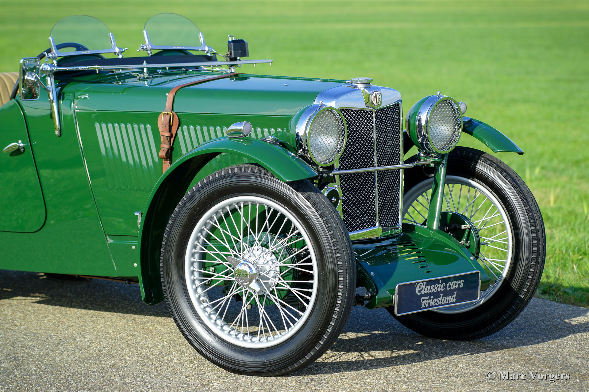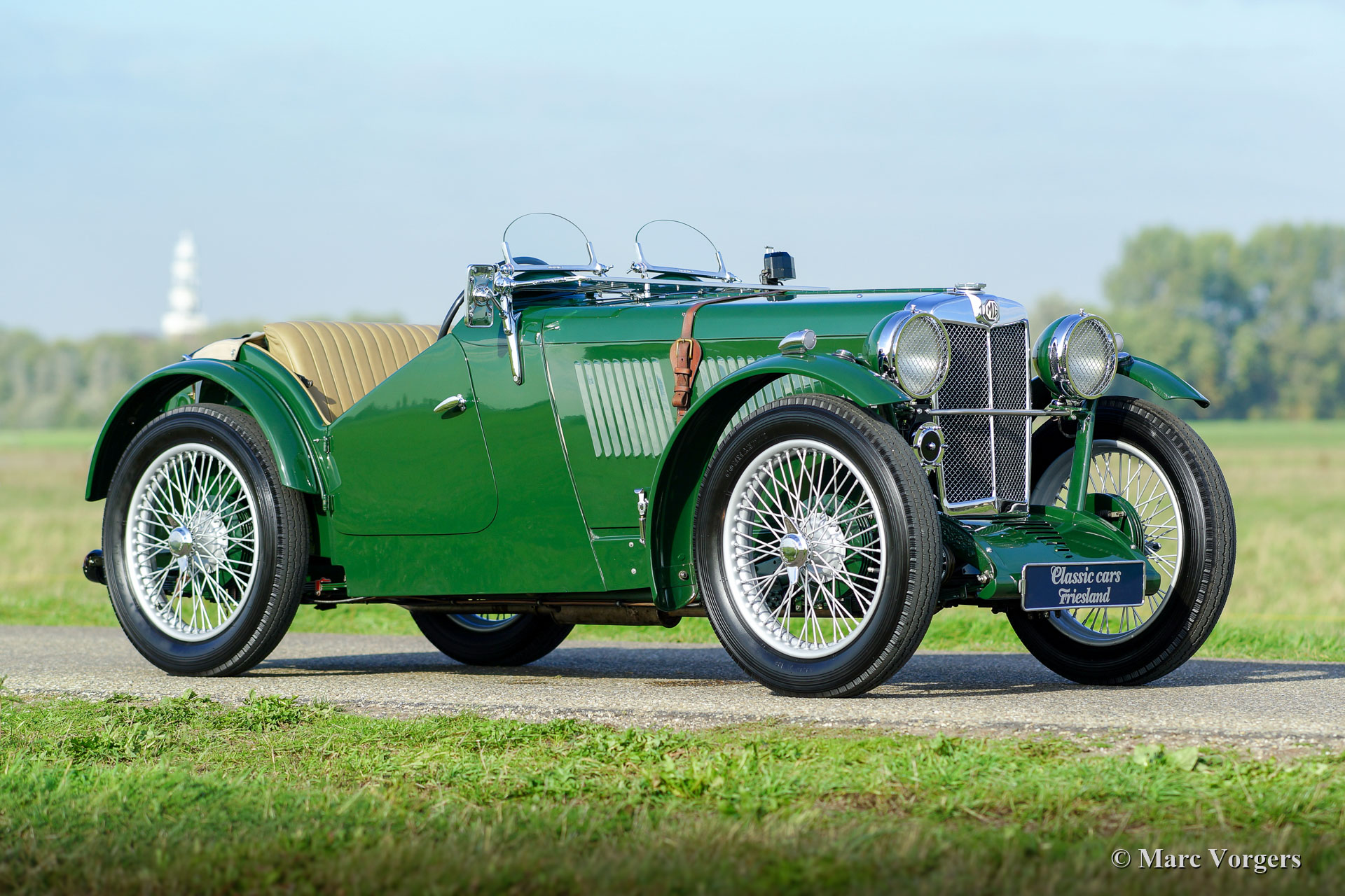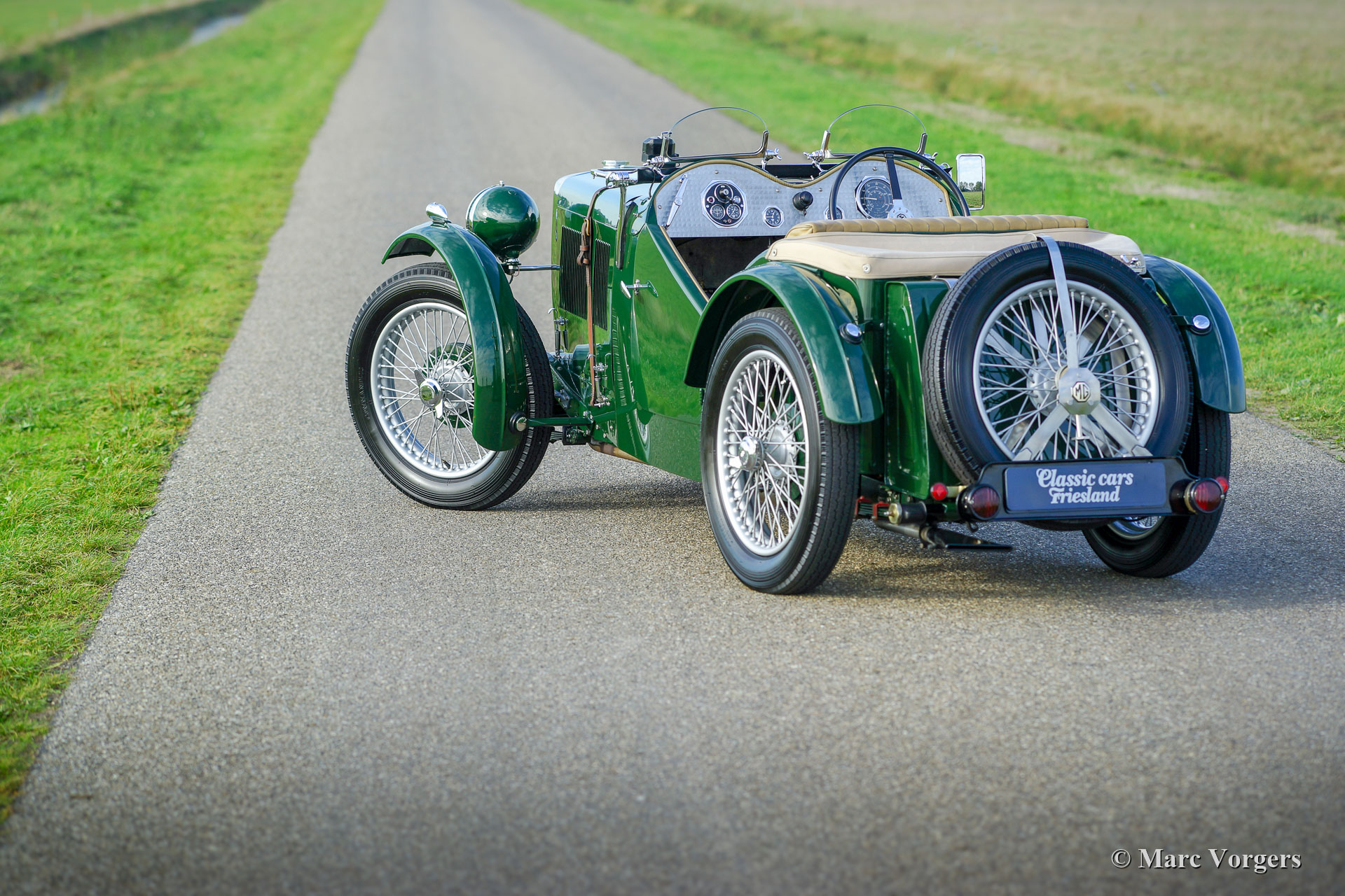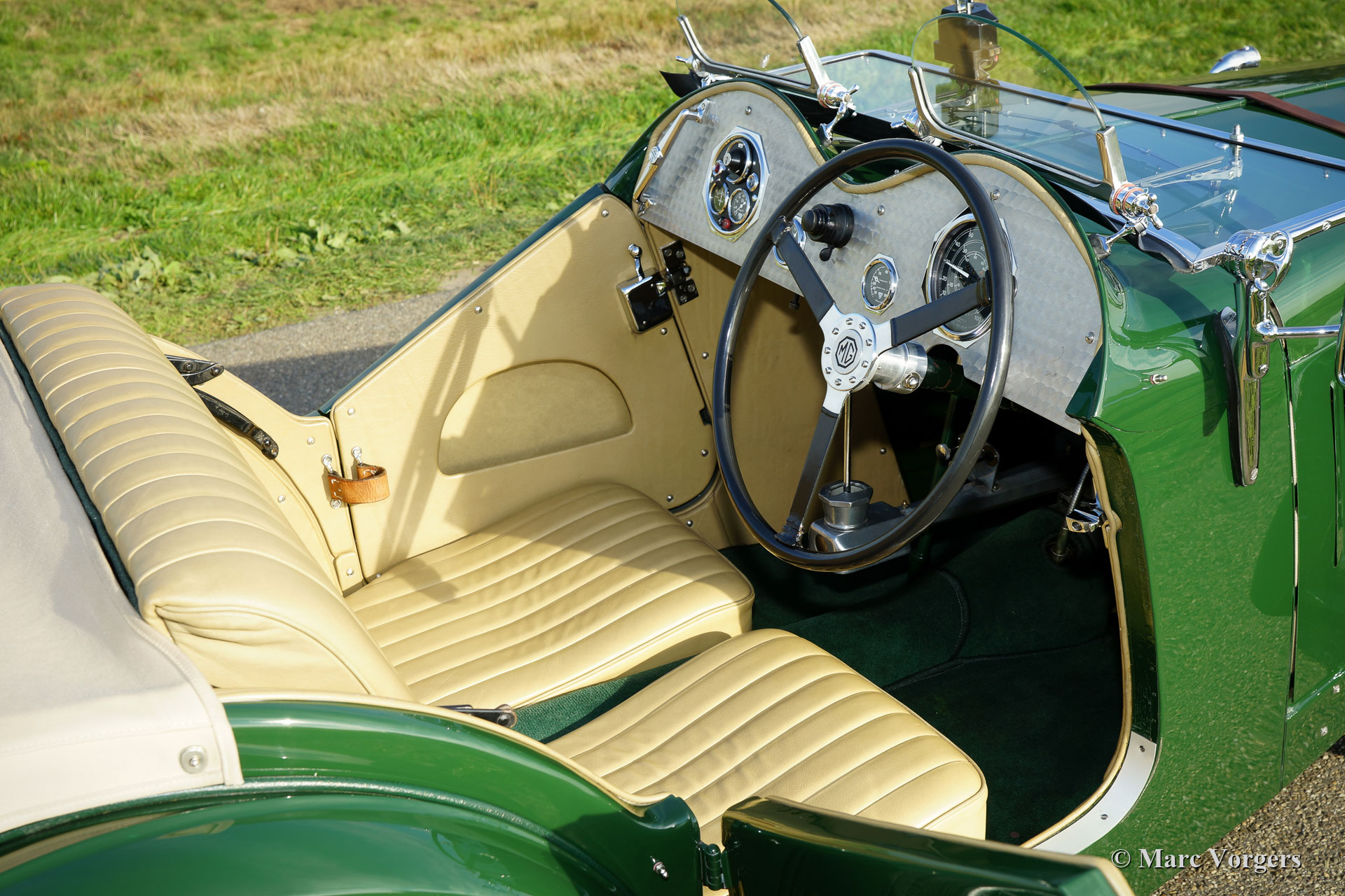 MG J2 ‘Midget’, year 1933. Colour British Racing Green combined with a beige leather interior and green carpet. Beige mohair hood-cover. This gorgeous MG J2 was extensively body-off restored by an MG specialist. This MG J2 ’Midget’ is in top condition; concours! In the process the engine and the gearbox were overhauled, the engine was given a new steel crankshaft. The wiring loom was renewed, brakes overhauled, and all the dashboard gauges were overhauled. The body was given a brand-new ash frame which was hand-made by a specialist. The bodyworks shows a perfect panel fit. A photo report of the restoration is present. This beautiful MG J2 features Brooklands ‘aero’ / racing screens, the original steering-wheel, 19-inch wire wheels, shod with Dunlop tyres, and a steel exhaust which produces a wonderful exhaust-note. A top-quality MG J2 ‘midget’!