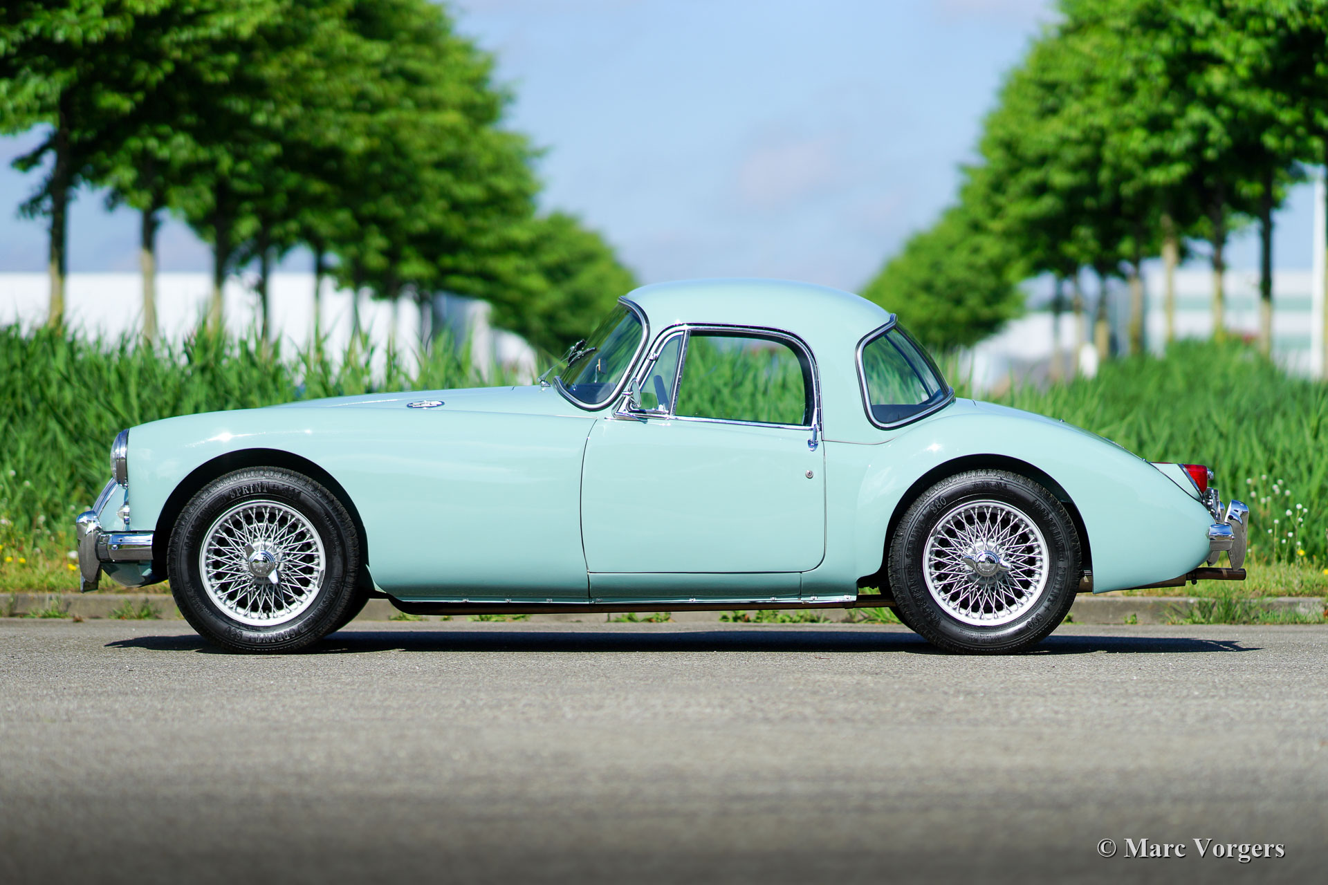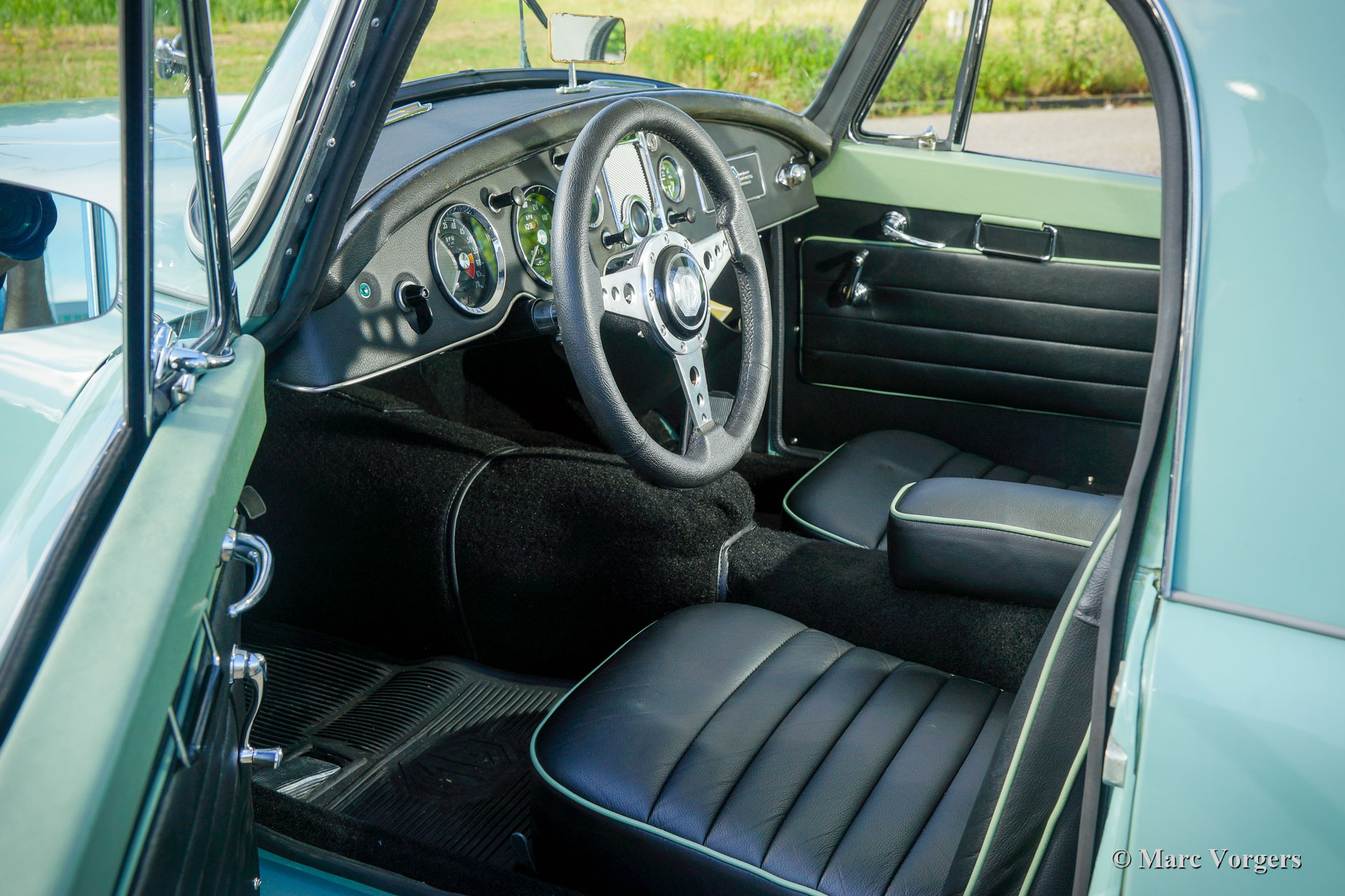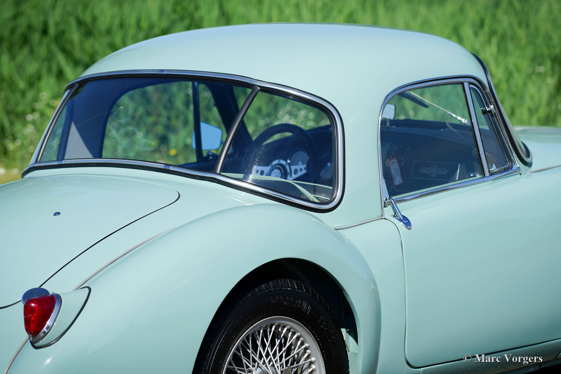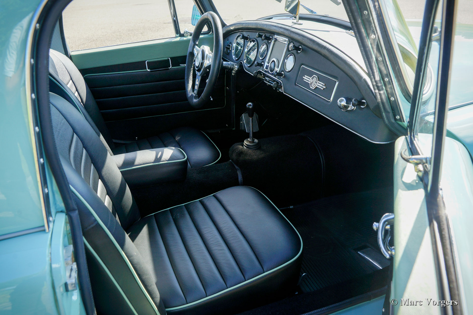 MG MGA 1500 coupe, year 1958. Colour ‘Island Green’ combined with a black leather interior, trimmed with light green piping, and black carpet. This gorgeous MGA 1500 coupe was beautifully restored in the past. The MG is in superb top condition and the car drives delightfully. The MGA coupe is a rare sight compared to the roadster model; only about 5000 coupes were built and over 43.000 roadsters! To ease the entry in the driver’s seat, the car is fitted with a smaller sports steering wheel. This fine MGA roadster shows all the original details and the car sports silver painted wire wheels. This is a very desirable example in superb condition!