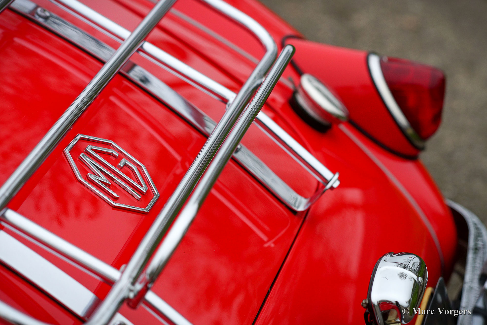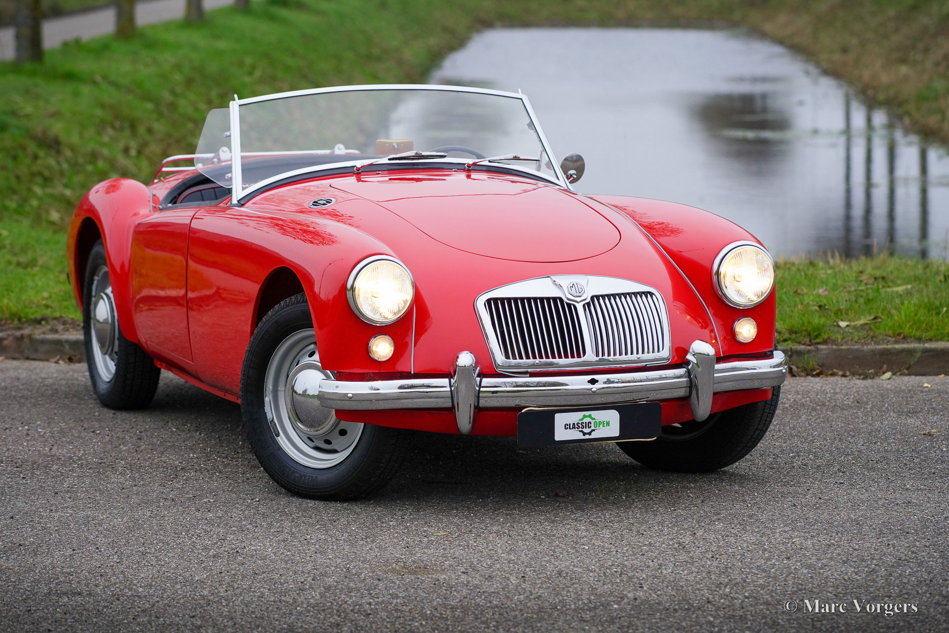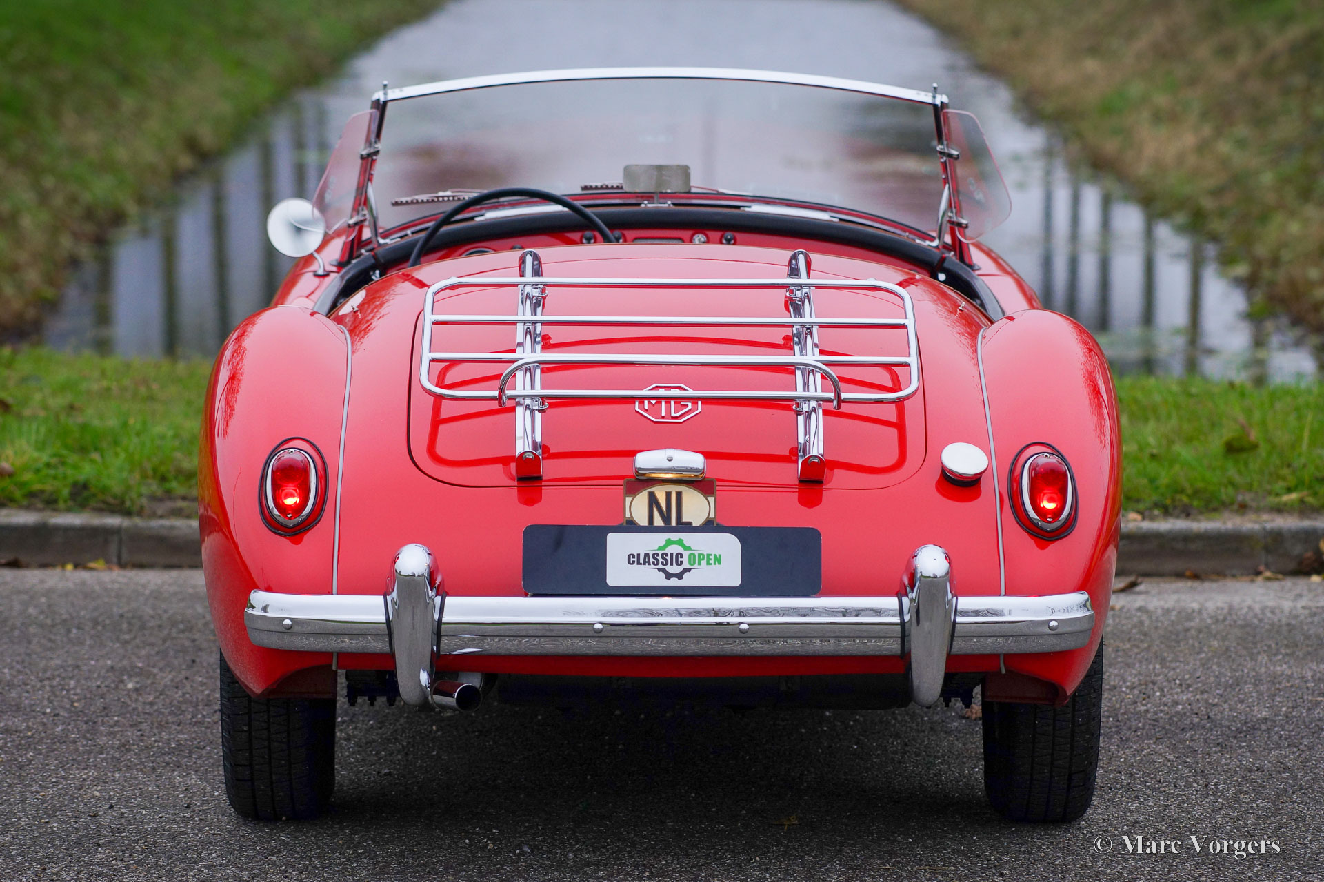 MG MGA 1500 roadster, year 1957. Colour red (Orient red) combined with a black interior trimmed with red piping and black carpet. Black vinyl hood, aluminium side screens and a black tonneau cover. This wonderful MGA 1500 roadster was sold new in the Netherlands, the car still carries its old Dutch registration number. The last owner has cherished this beautiful roadster since 1987! Costs nor effort were spared to keep the car in superb condition! The car was extensively restored and punctually serviced. A photo report of the restoration is present. The history is known and documented. This wonderful MGA roadster shows all the original details, and the car is in a superb top condition! You will be hard pressed to find a more beautiful and better driving example. Here ever you look, it is obvious that this MGA was maintained with love and care. This Fine MGA features the original disc wheels with chrome hub caps, the original steering wheel and a chrome baggage rack. This MGA is a true gem for the MG enthusiast!