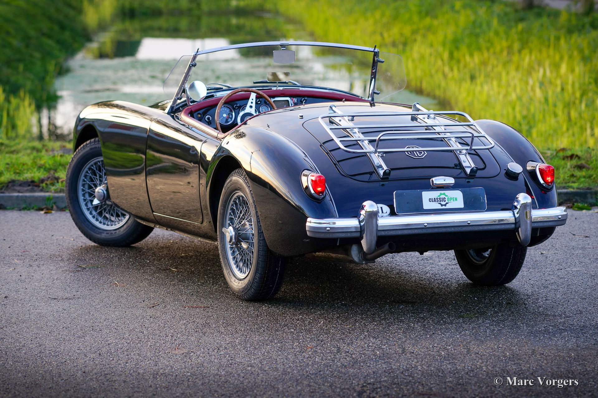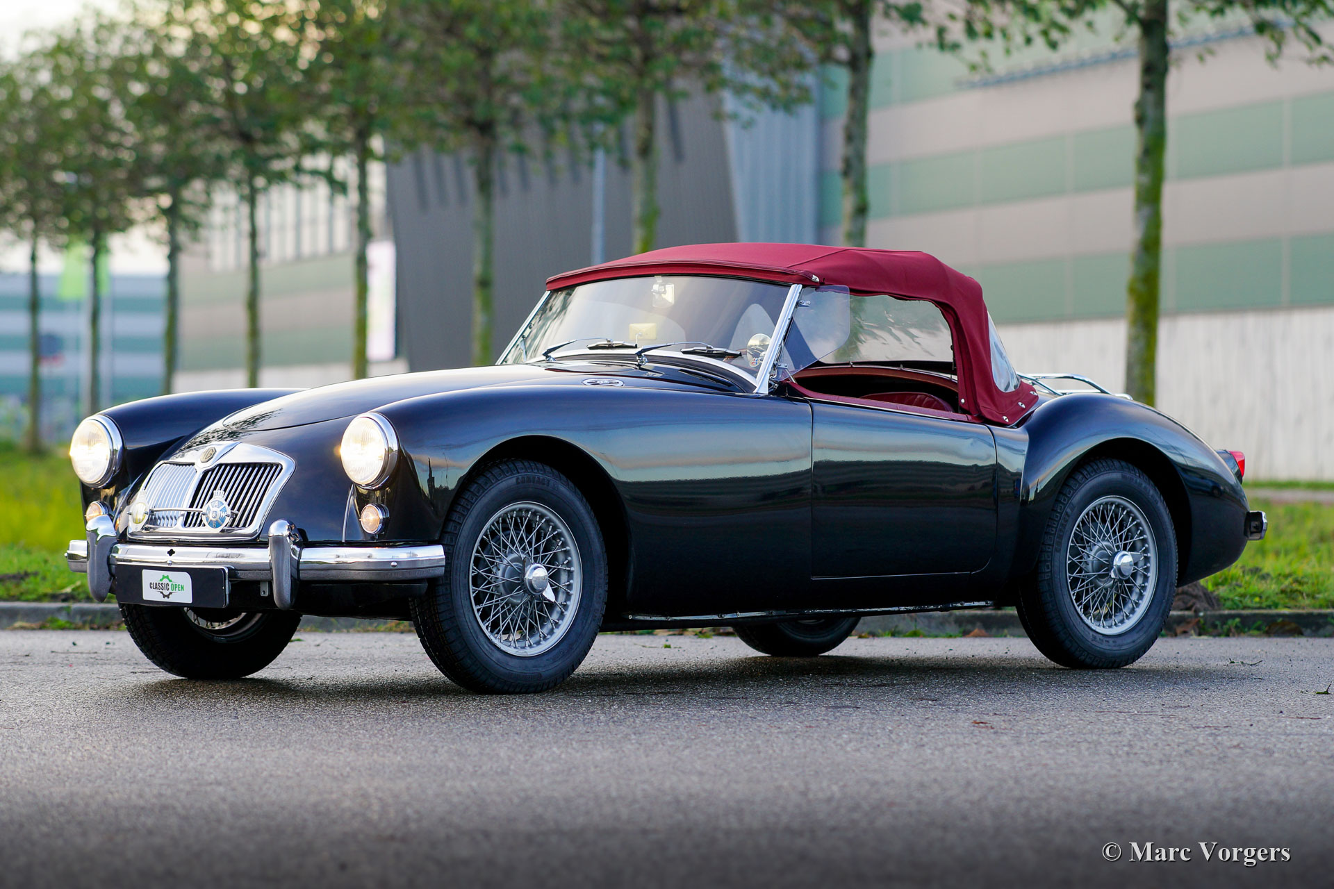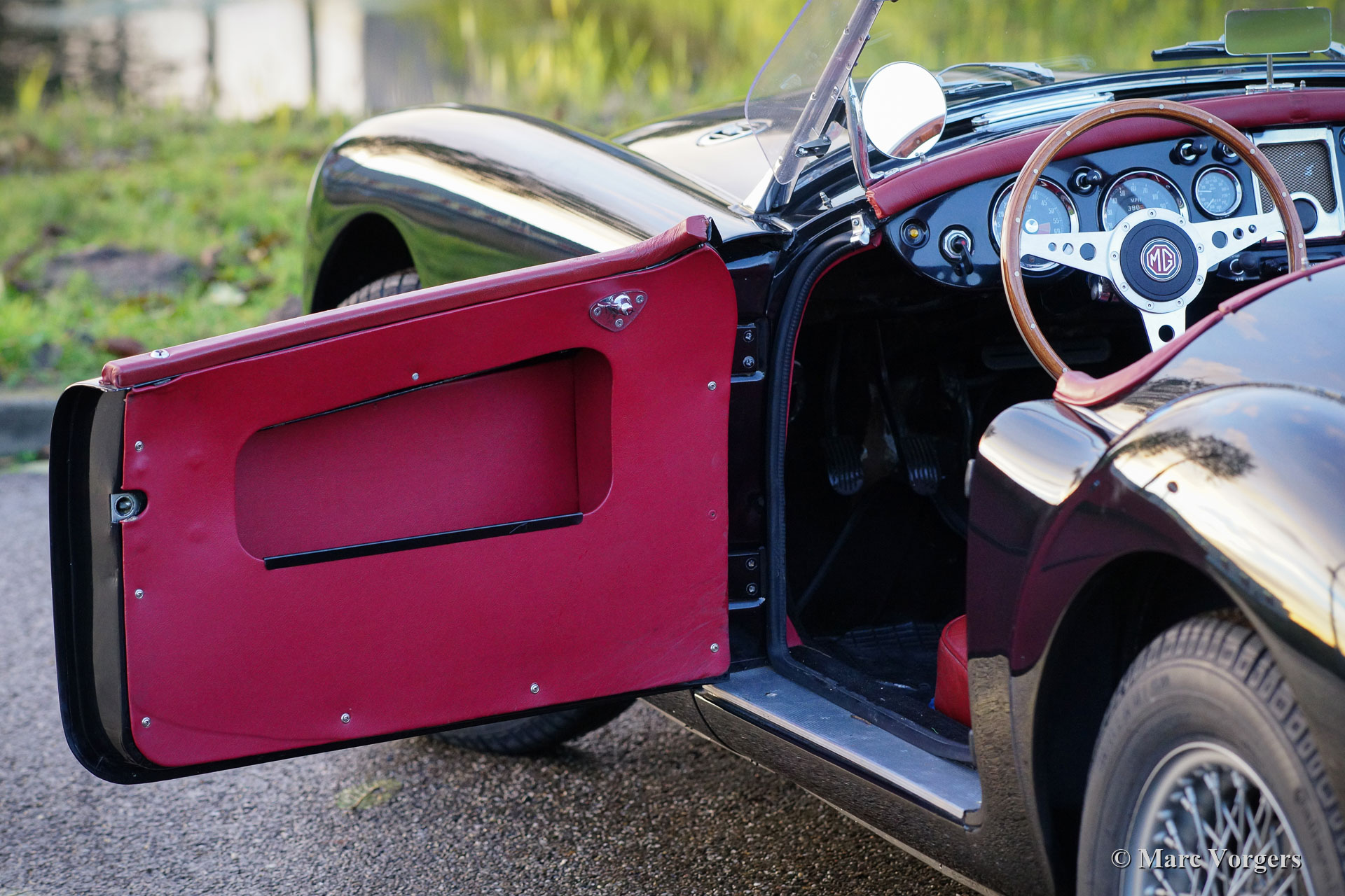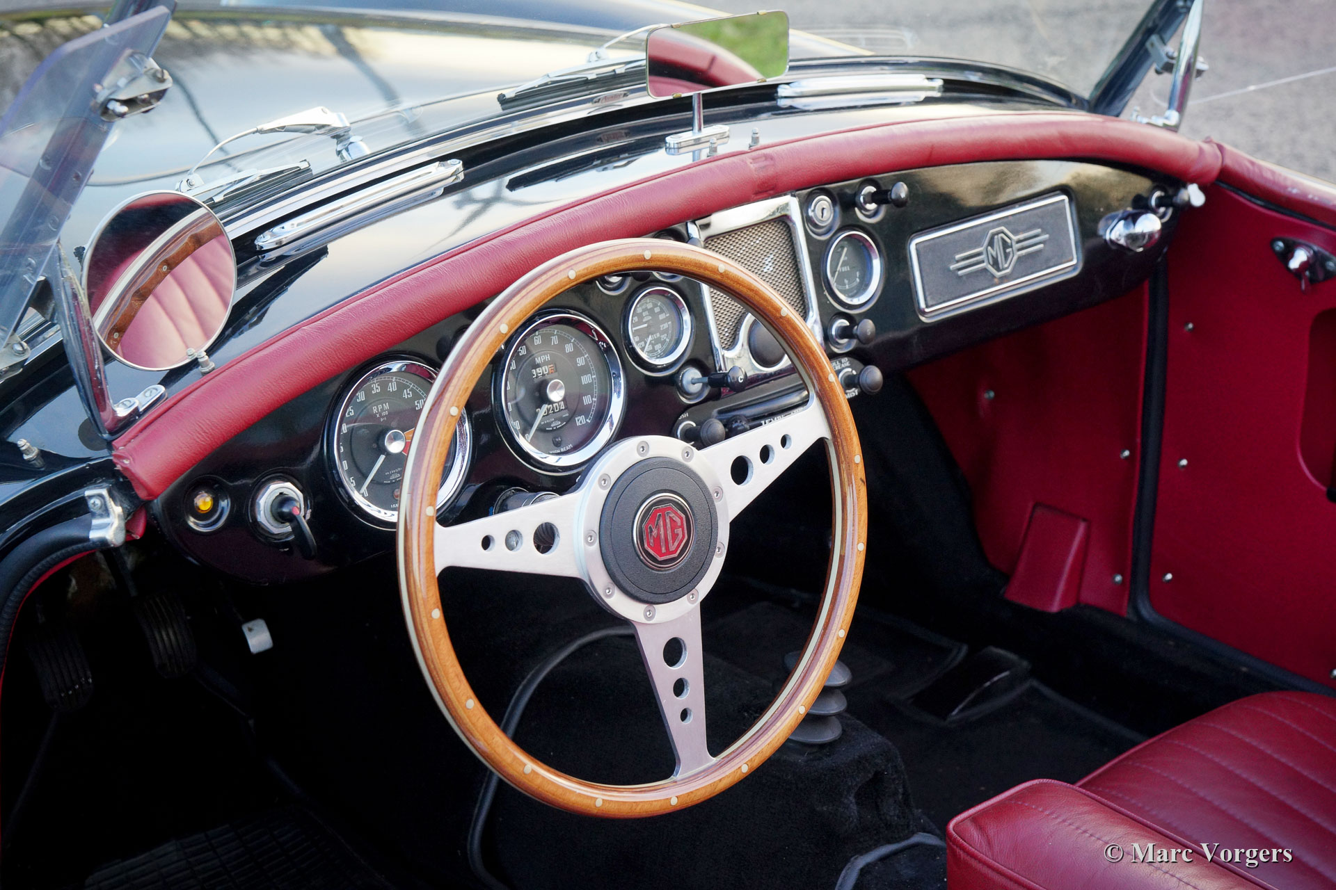 MG MGA 1500 Roadster, year 1959. Colour black combined with a red leather interior and black carpet. Red vinyl soft top, black vinyl tonneau cover and side screens with aluminium frames. This gorgeous MGA 1500 roadster was restored in the past, the car is in a very good condition and the car drives delightfully. This very handsome MGA roadster was very well serviced and maintained over the years, the car shows light to normal signs of previous use. The black / red colour combination is possibly the most beautiful colour scheme for the MGA roadster, sporty and stylish! This wonderful MGA 1500 roadster is fitted with silver painted wire wheels, a MotoLita sports steering wheel with wood rim, a badge bar with 1960s Dutch ANWB and WW (Wegenwacht – like the British AA) badges and a chrome baggage rack. This MGA 1500 roadster is a desirable driver car which will bring much fun and joy to the MG enthusiast!