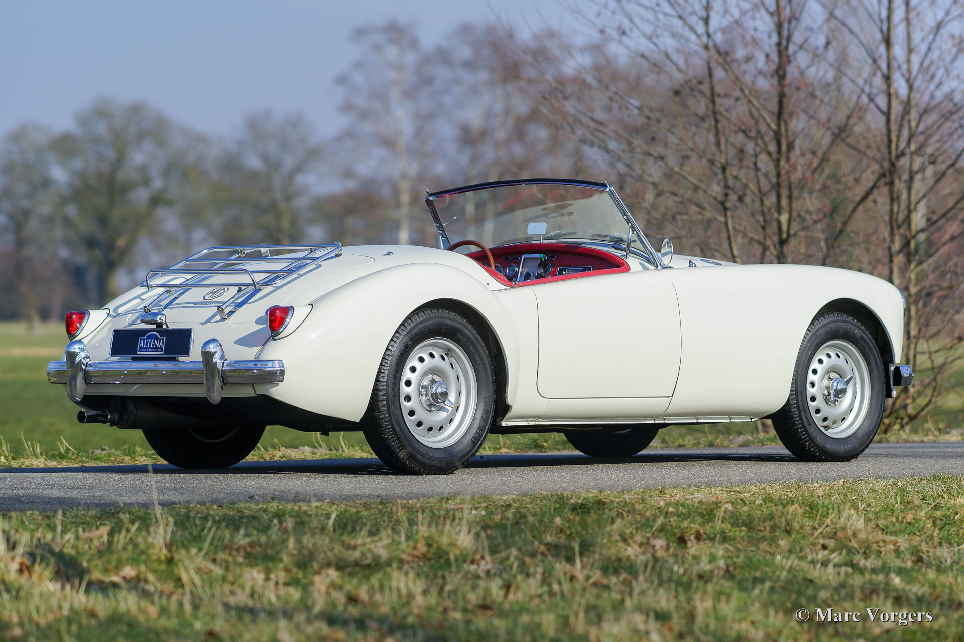 The year 1955 saw the introduction of the MGA. With this design the MG broke new grounds. After its predecessors MG TD and MG TF, which were largely based on the pre-war MG TB, it was a roadster with a very modern sporty design. Like its predecessors, the MGA was a great success and, like before, the greater part was sold in America. Until 1959, the MGA was equipped with a 1459 cc four-cylinder engine. From that year, the car was fitted with a 1588 cc four-cylinder. A 1622 cc four-cylinder engine replaced the 1588 cc. engine in 1961. The early MGA versions had very good drum brakes until 1959, but after that year, the MG A was equipped with disc brakes on the front wheels. April 1958 saw the introduction of a very special MGA; the Twin Cam. This MGA featured a special twin cam engine fitted with double overhead camshafts. The Twin Cam engine was based upon the standard 1500 B-series engine but extensively up rated and engineered. The engine block was fabricated of cast iron and the cylinder head was made of aluminium. The high revving Twin Cam engine delivered a power output of 108 bhp., 40 bhp more than the standard 1500 engine which delivered 68 bhp. Not only the engine was special, the car was also fitted with disc brakes all round and special Twin Cam disk wheels with central locking eared wheel nuts. Between 1958 and 1960 1788 MGA Twin Cam roadster models were build. The coupe is scarcer; only 323 units left the factory. The last MGA, a 1600 Mk II left the factory gate in May 1962. The MGA was succeeded by the MGB.