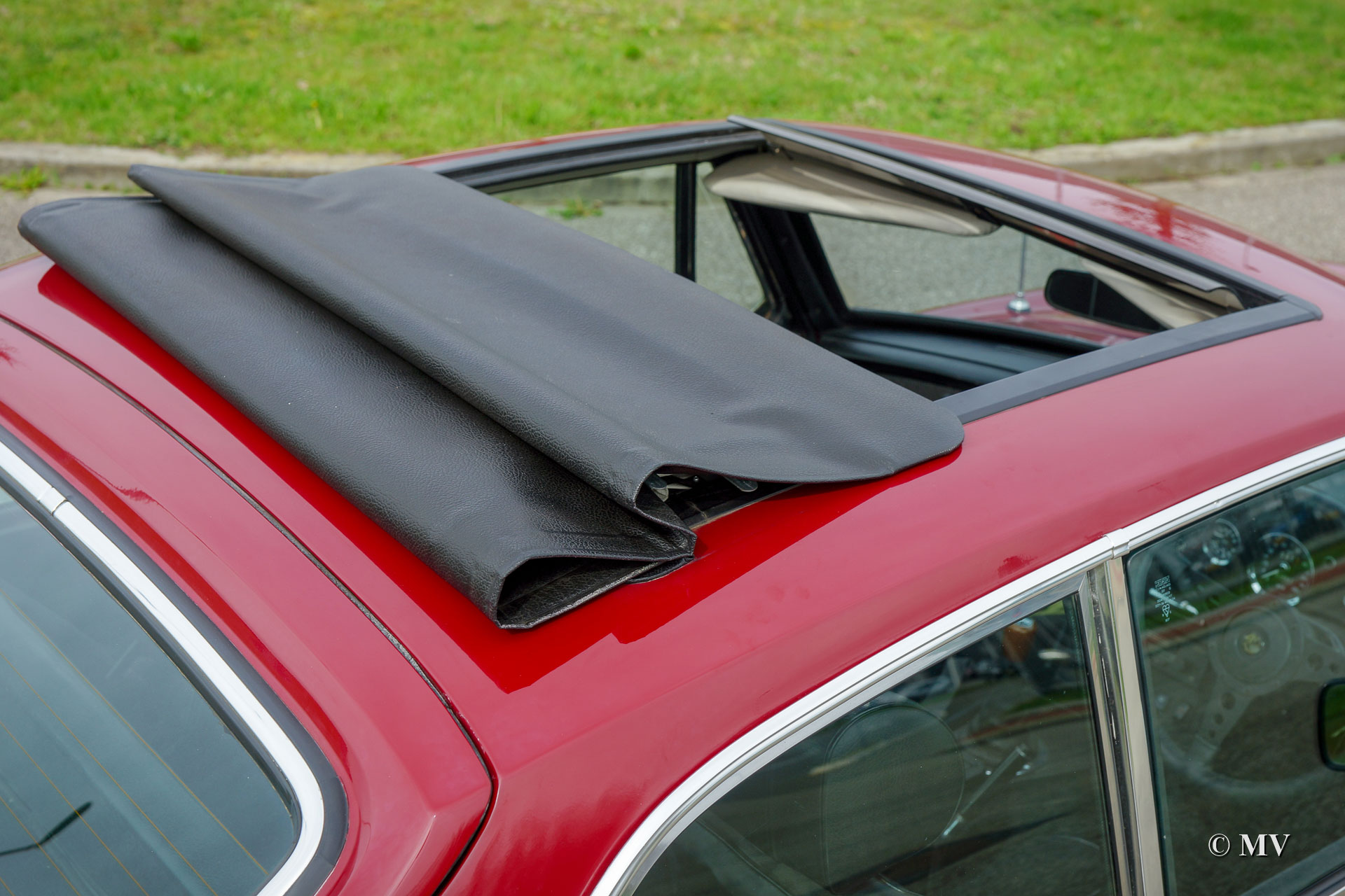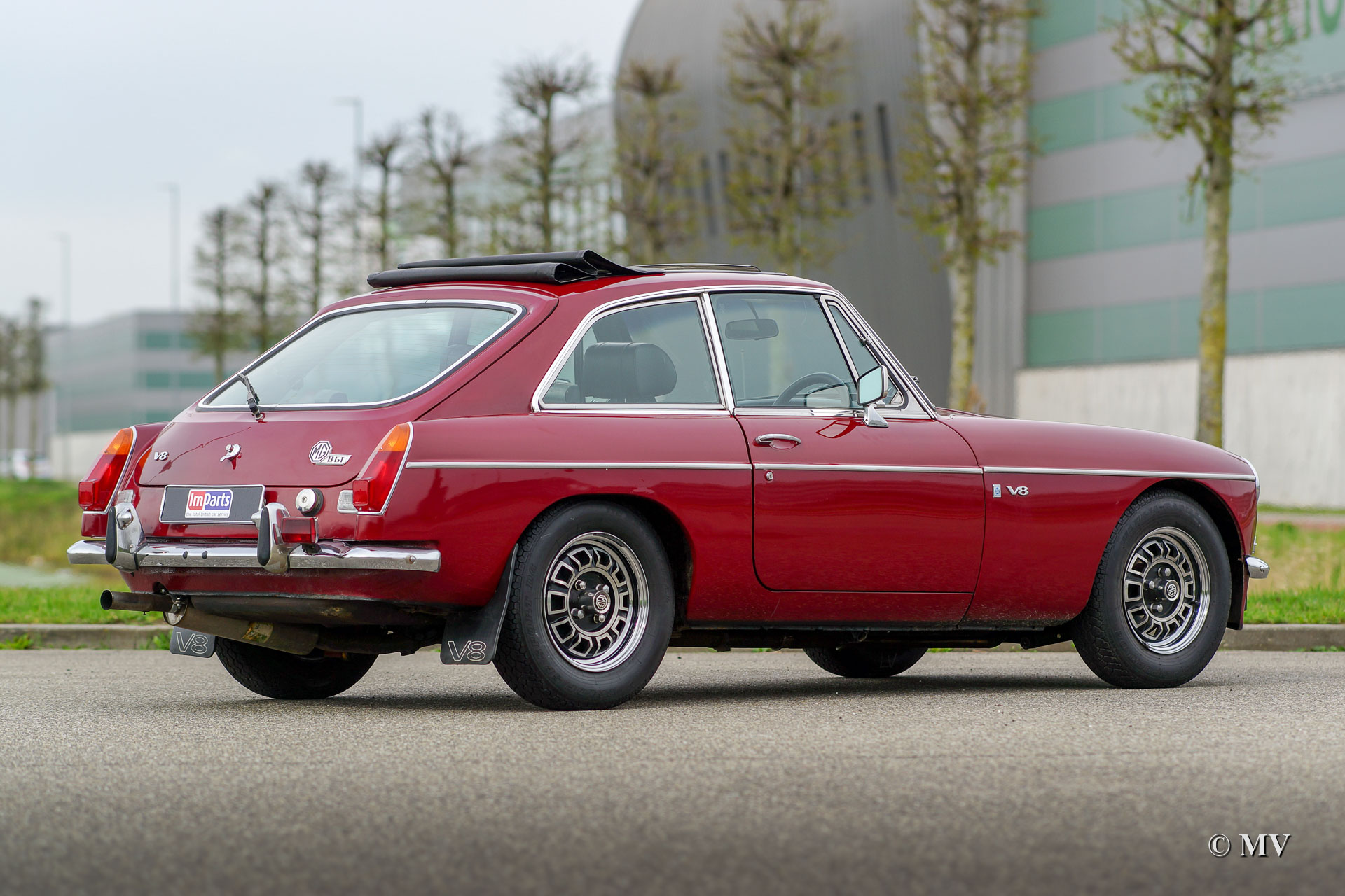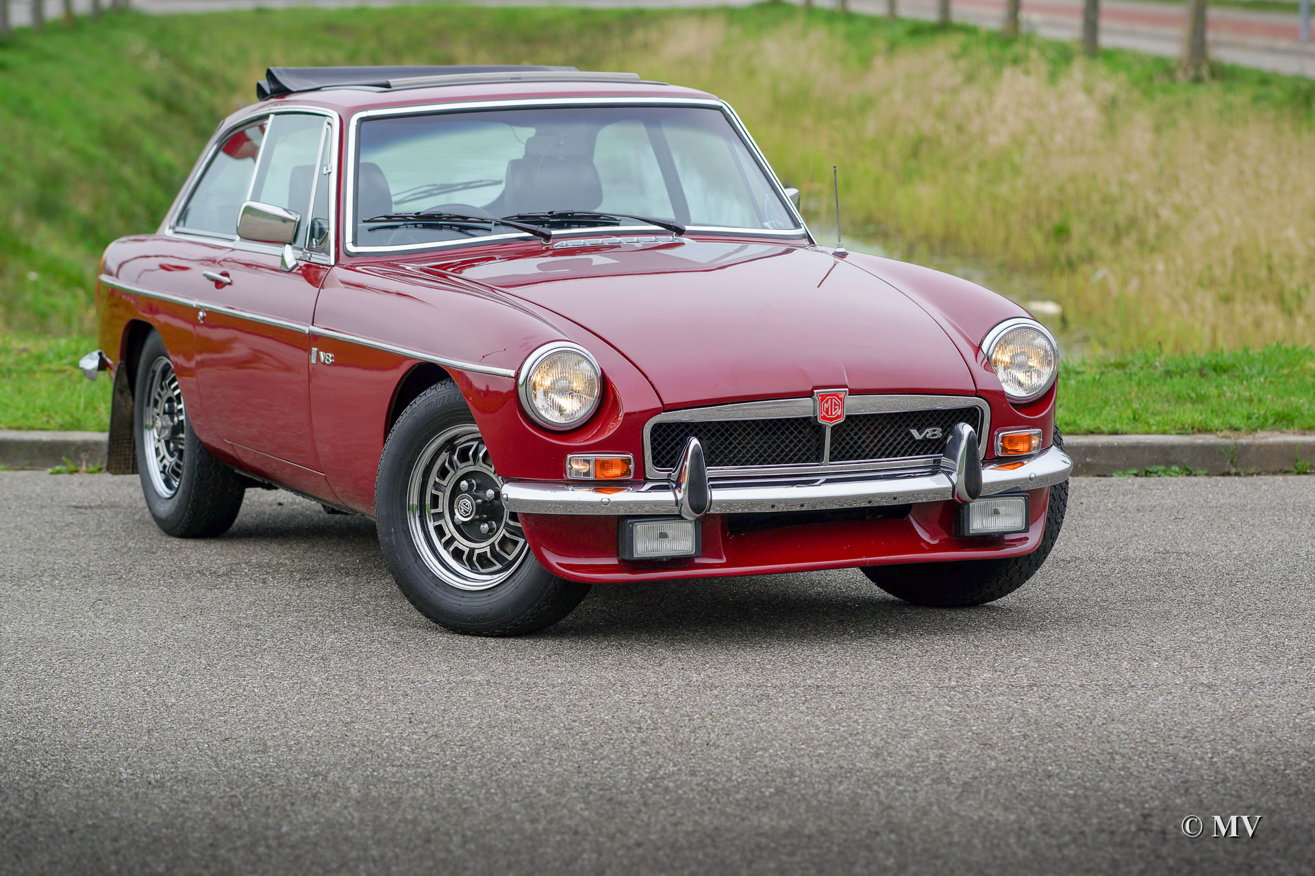 MG MGB GT V8, year 1973. Colour Damask red with a black cloth interior. This fabulous MGB GT V8 is in very good condition and the car drives and sounds impressively! The paintwork shows signs of use and age. The 3.5 litre Rover V8 is a real power-house and it makes the MGB GT a true sports car! The gearbox is a 4-speed manually operated unit which is fitted with overdrive. Like all the original GT V8’s the car is right hand driven (RHD). The automobile is fitted with a delightful Webasto sunshine roof, additional cornering / fog lamps, a Blaupunkt radio and the original alloy wheels. The car is fitted with a special exhaust and exhaust manifolds which increase the power-output, and which make the exhaust-note even more impressive. Also present is a Heritage certificate which states that Damask red is the cars original colour. The car is currently registered in Belgium.