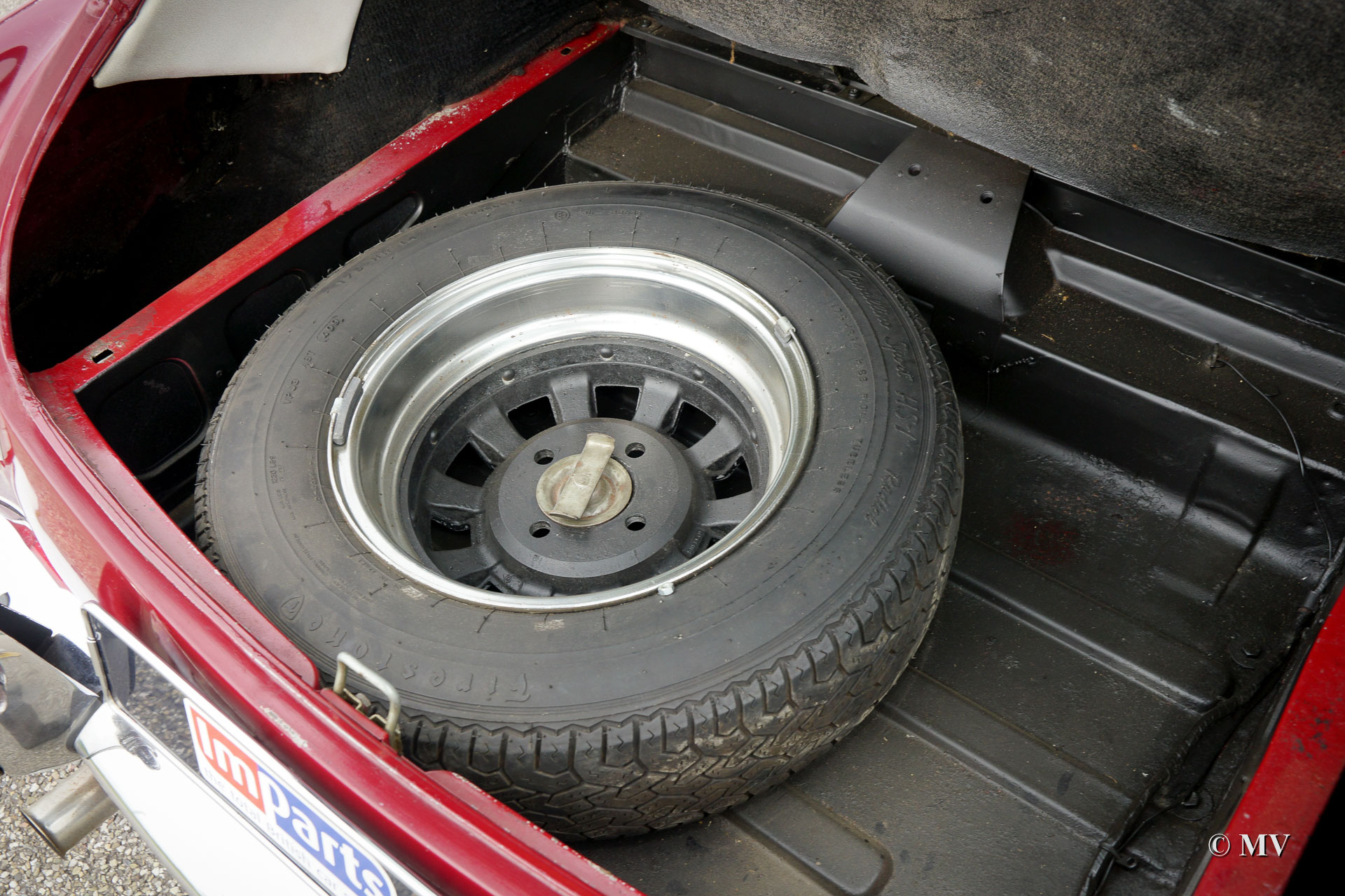 The MG B was the first MG (Morris Garage) built of unitary construction bodywork. The MG B GT V8 was built between 1973 and 1976. In 1970, Ken Costello, a garage owner, installed a Rover 3500 V8 engine in an MG B. MG took over the idea, though engine capacity of the Rover V8 in the MG did not produce 180 hp. at 5500 rpm. but 140 hp. at 5000 rpm. Influenced by the American rules on safety, later models were equipped with synthetic rubber bumpers. Many of the later, built from 1974 until 1976, "rubber-bumper" models are now converted into "chrome-bumper" models. The car shown in these pictures is a original chrome bumper car fitted with the original MG B GT V8 rims.