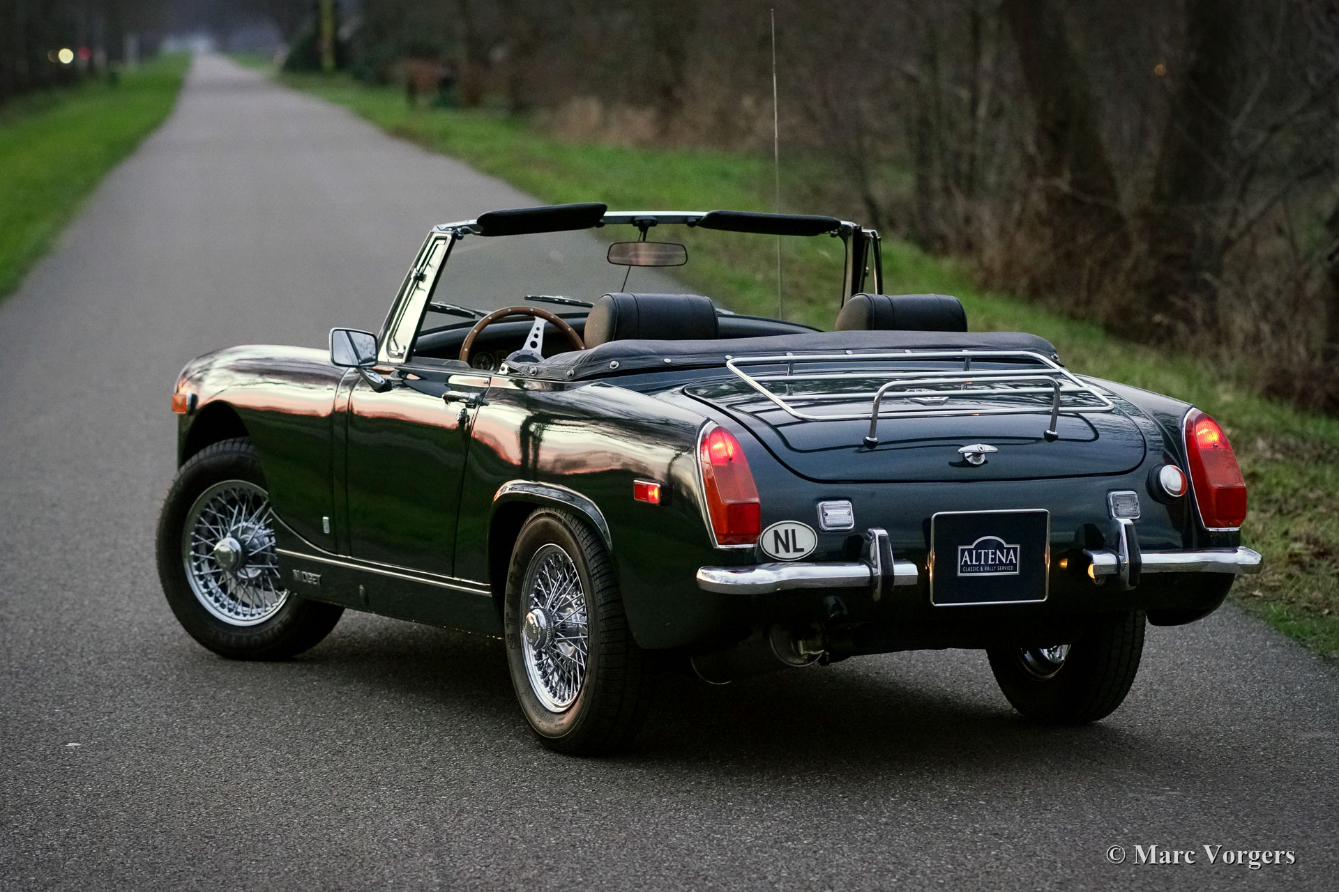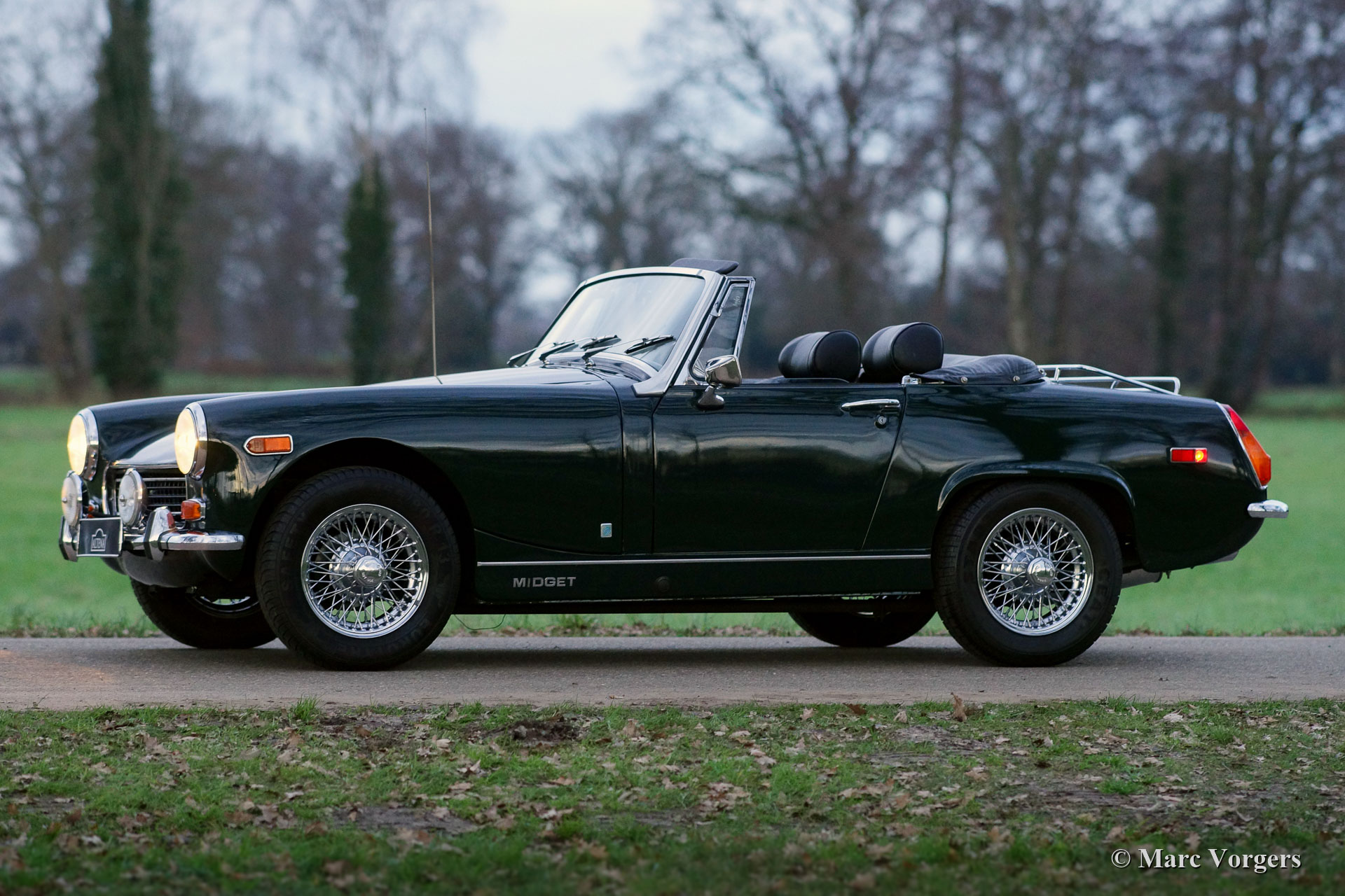 MG Midget 1275 Mk III, year 1970. Colour dark British Racing Green combined with a black leathercloth interior and black carpet. Black vinyl soft-top. This very nice MG Midget was sold new in Canada. In the year 1999 the car was imported to the Netherlands. Since 1999 the car has known only one Dutch owner who has truly cherished the car. In 2000, the car was given beautiful new paint, and over the period 1999-2021 the car was perfectly serviced and kept up to date. Many parts were renewed, all the invoices are present. The history file also contains documents from the Canadian period. This delightful MG Midget 1275 is in a very good and wonderful condition inside and out, and the car drives, shifts, brakes and handles very well. The car is fitted with chrome wire wheels, a chrome baggage rack, a wonderful MotoLita steering wheel with a wood rim, Lucas fog lamps at the front, a period correct AM radio and a new vinyl soft-top. This MG can be imported to any country. A delightful Midget with the desirable 1275 cc engine!