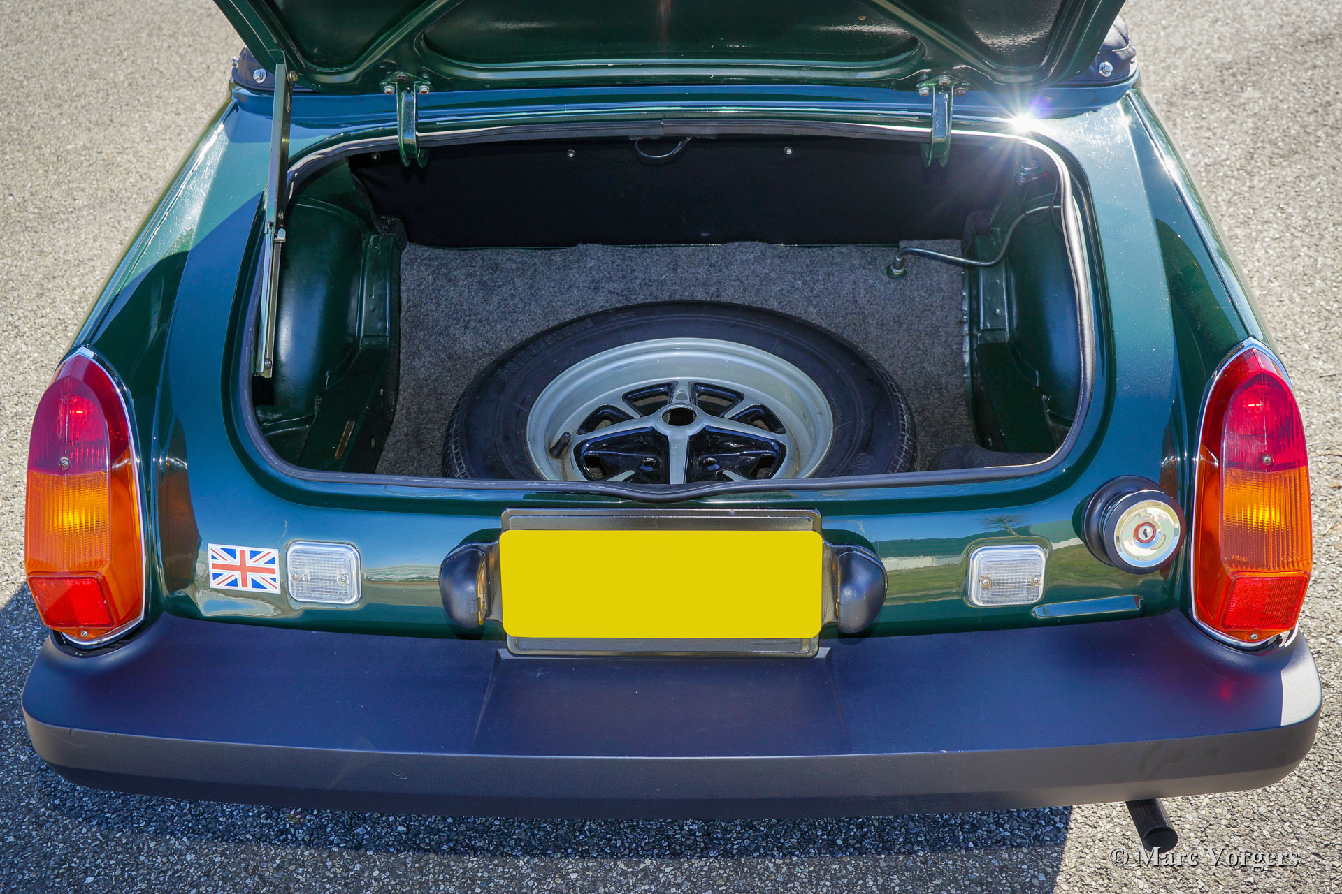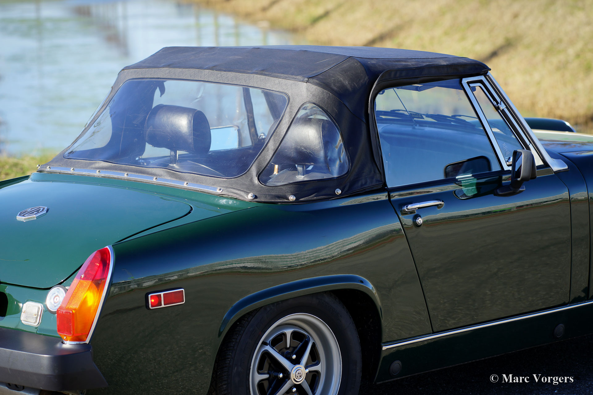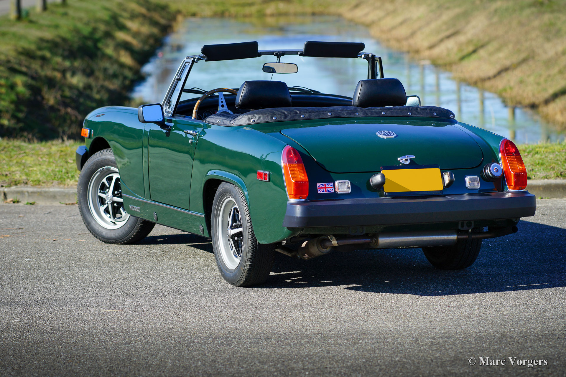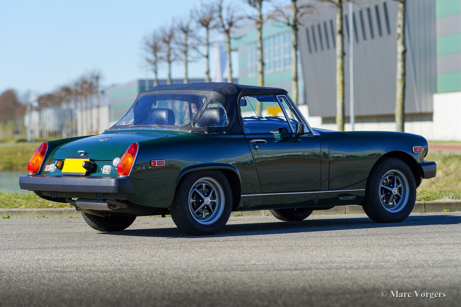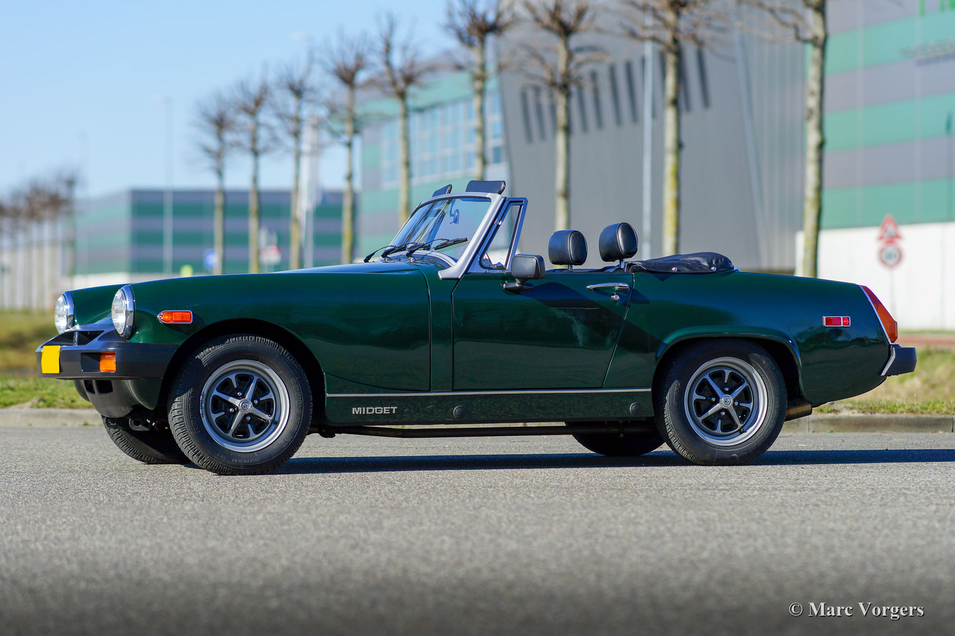 MG Midget 1500, year 1977. Colour dark British Racing Green combined with a black leatherette interior and black carpet. Black vinyl soft-top and hood cover. This MG Midget was sold new in the USA, the car was imported from California. This compact open-top MG is in excellent condition and the car drives perfectly. Previous owner(s) have invested love and care in service and upkeep of this lovely car. The bodywork is free of corrosion and shows excellent paintwork, the interior is in excellent condition with only very slight signs of use, and the engine compartment is clean. The open top driving experience is very in this lovely MG Midget! The car features the powerful and reliable 1500 cc four-cylinder engine, comfortable seats with headrests, a sports steering wheel with wood rim and the original Rostyle wheels.