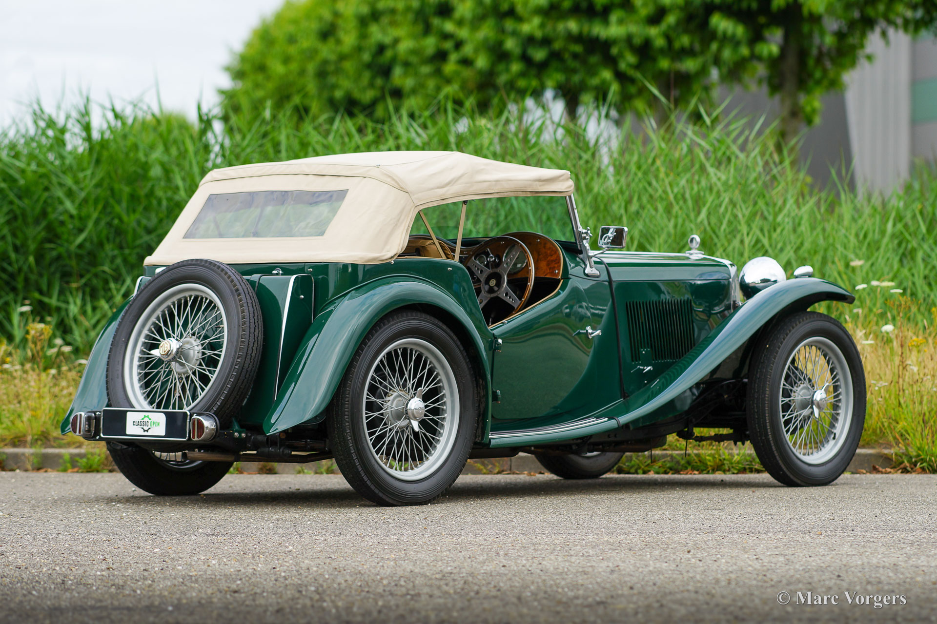 The MG TC was the first new post-war MG. The TC was introduced in 1945, and based on the pre-war TB, it was very similar. A major improvement to the TC was the larger interior, which was increased by 10 cm. The design was similar to the pre-war TB, with swept separate wings, large 19-inch wire wheels and a folding windshield. The MG TB/TC series were much admired by the American soldiers who were on the point of returning to America; this type of small sports car with its smooth handling, was not yet known in America. As a result, many TBs and TCs were shipped to America, and also the MG TC was in great demand at the other side of the pond. All TCs had right-hand steering, leaf springs all around and a 54 bhp four-cylinder engine. In 1950, the MG TC was succeeded by the MG TD.