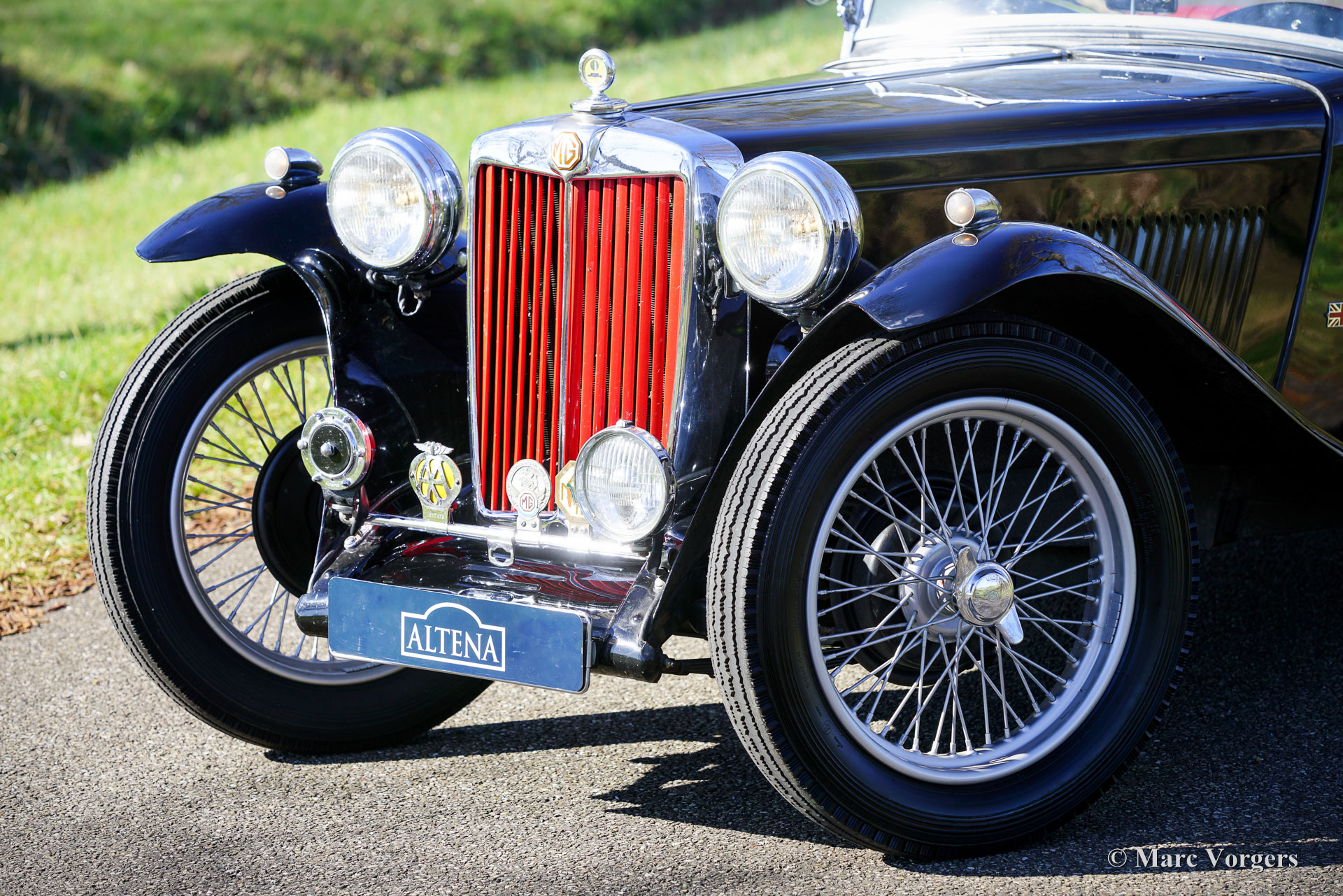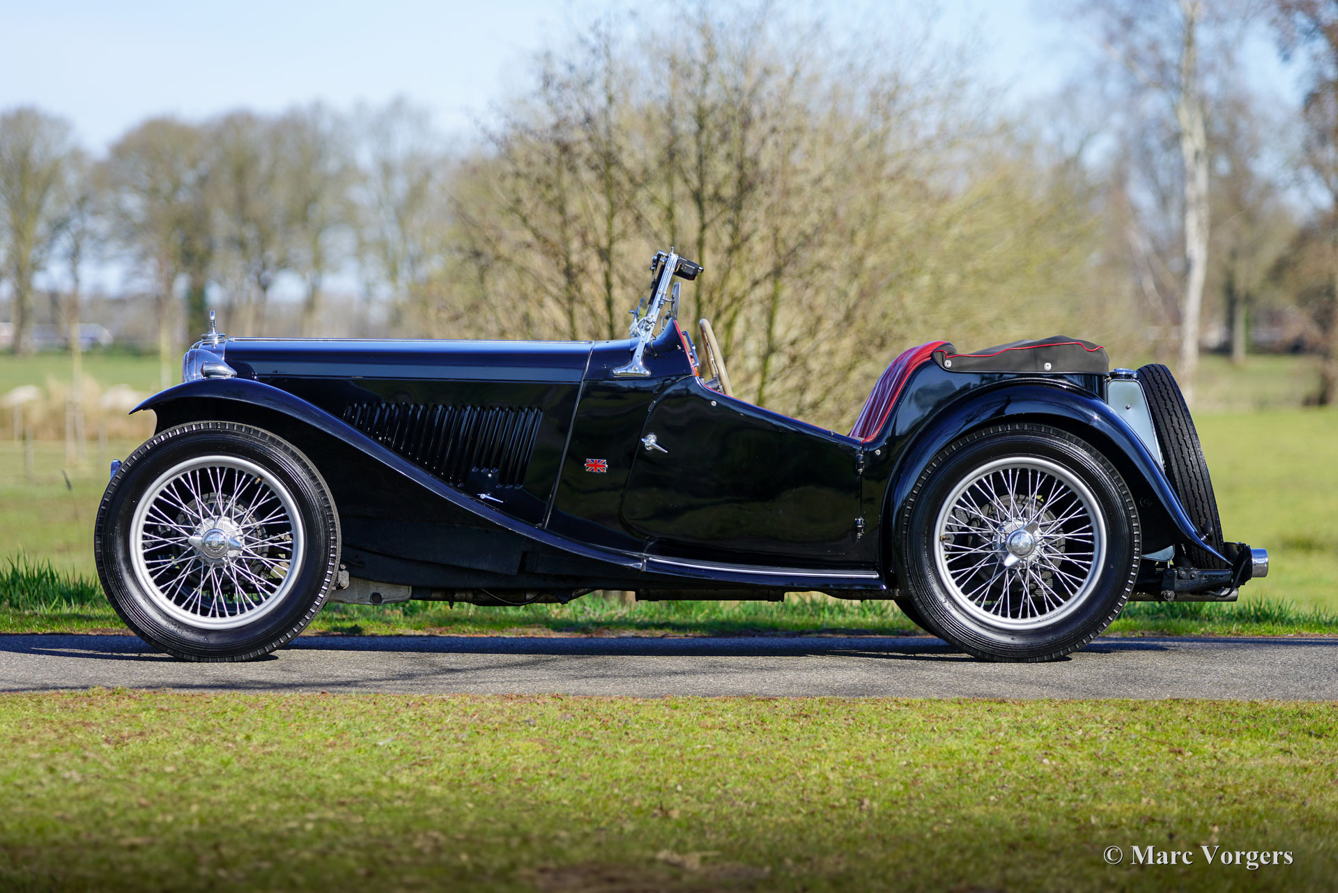 The MG TC was the first new post-war MG. The TC was introduced in 1945, and based on the pre-war TB, it was very similar. A major improvement to the TC was the larger interior, which was increased by 10 cm. The design was similar to the pre-war TB, with swept separate wings, large 19-inch wire wheels and a folding windshield. The MG TB/TC series were much admired by the American soldiers who were on the point of returning to America; this type of small sports car with its smooth handling, was not yet known in America. As a result, many TBs and TCs were shipped to America, and also the MG TC was in great demand at the other side of the pond. All TCs had right-hand steering, leaf springs all around and a 54 bhp four-cylinder engine. In 1950, the MG TC was succeeded by the MG TD.