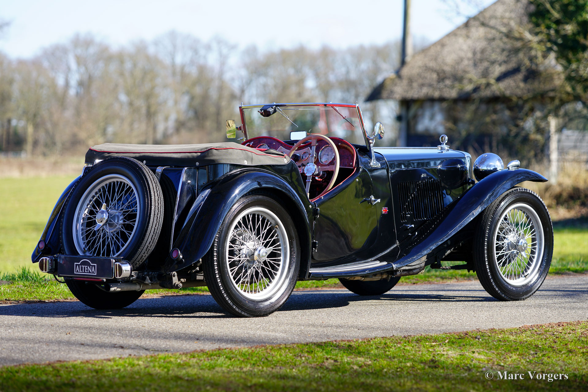 MG TC, year 1949. Black exterior colour combined with a red leather interior trimmed with black carpet. Black mohair hood, side screen frames, and hood cover. This MC TC was sold new in the USA and is currently registered in the Netherlands. According to the title of a book about the MG T-series, they were “The sports cars the world loved first”. American WW2 soldiers were totally smitten by the light, compact, and agile MG T series cars and many were shipped to the USA after the war. Starting with the post war MG TC the British sports car became a bestseller in the United States. This wonderful example was restored in the past, and the engine was overhauled. The car is in a very good condition, and it drives delightfully! This MG TC shows wonderful original details and some slight traces of previous use. The mechanicals have received some proper upgrades with the fitment of a more powerful modern starter motor, modified (lighter and more precise) steering gear, and a free flow exhaust manifold to improve engine performance. The car is fitted with new 19-inch wire wheels shod with Dunlop 4.50 x 19 tyres. This MG TC brings a fantastic vintage open top driving experience. The sight on the wood dashboard with its array of chrome bezel gauges, and the look over the bonnet take you back to the golden years of motoring!