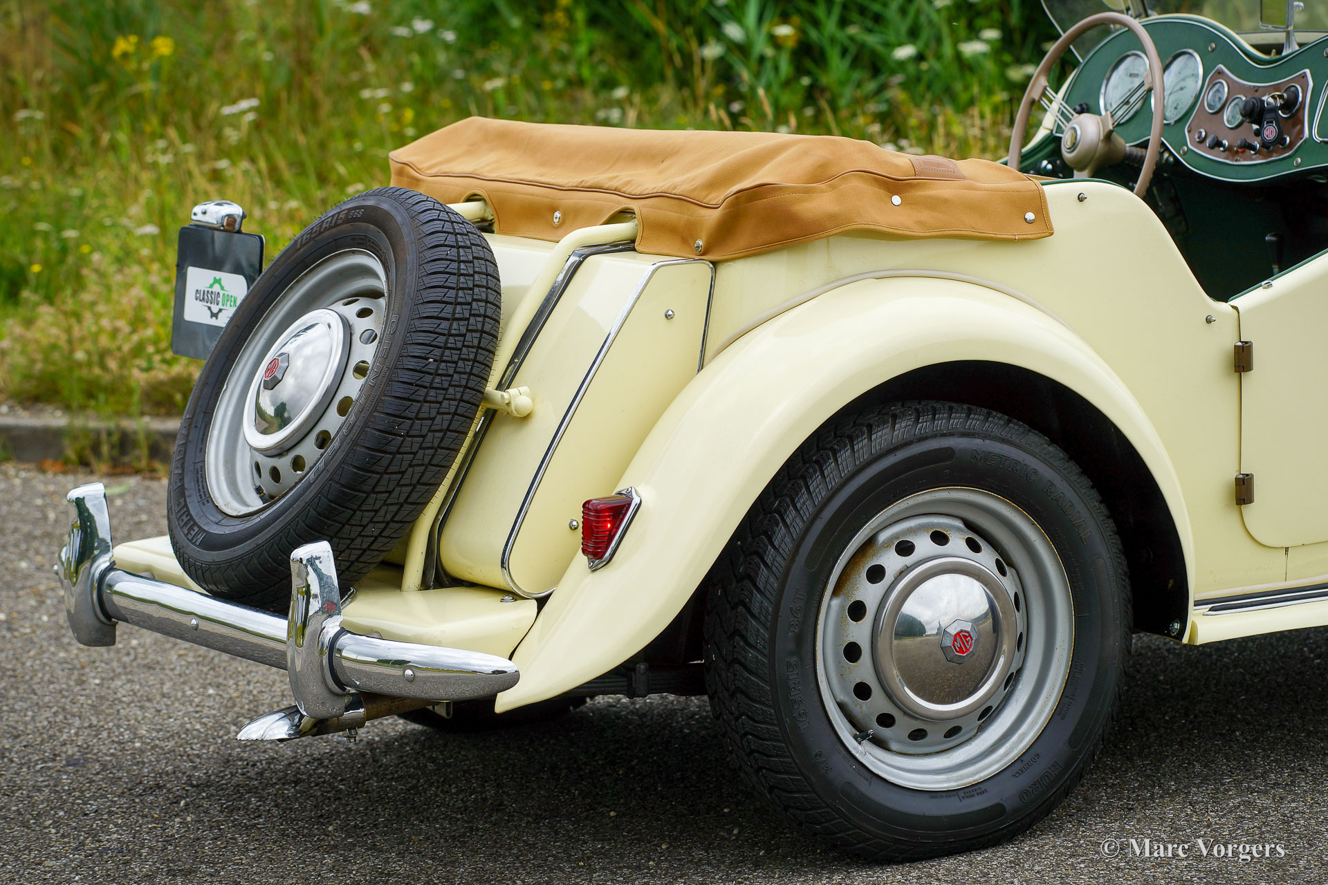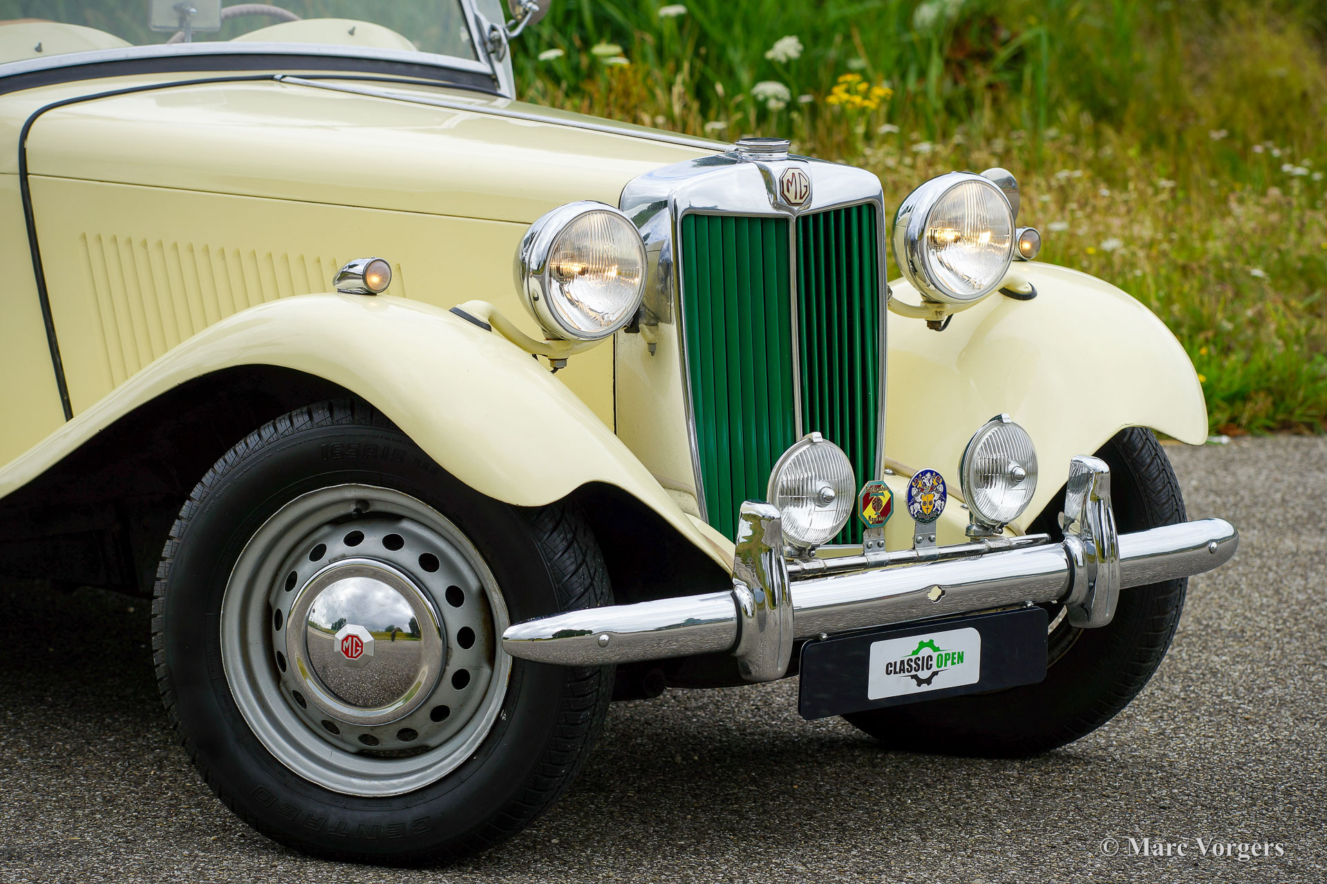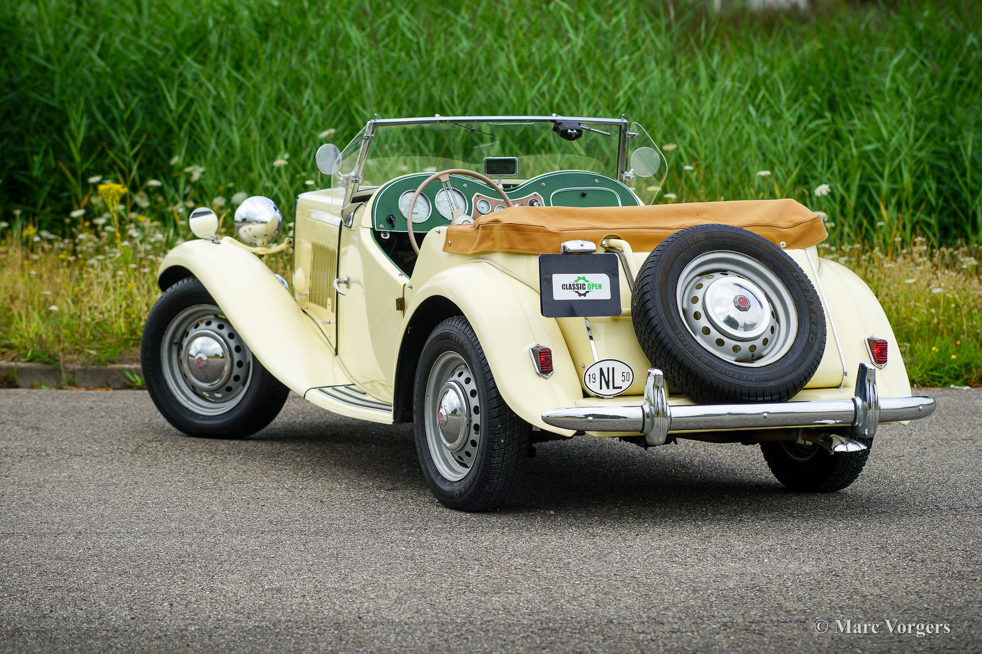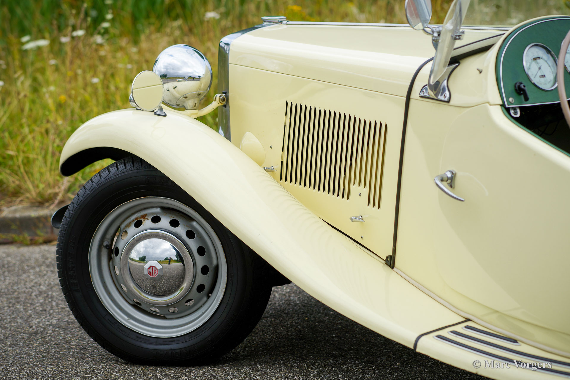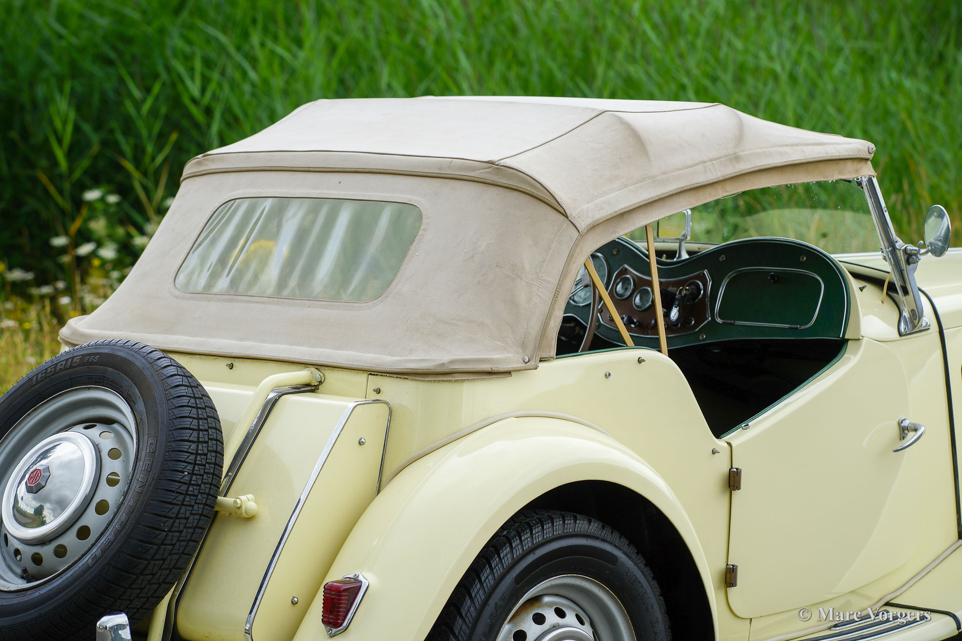 MG TD, year 1950. Colour Primrose yellow combined with an apple green leather interior and black carpet. Light beige hood and side screens, beige hood-cover. This delightful MG TD is in a good driver condition and the car shows all the original details. This MG TD is a fantastic car to enjoy on beautiful summer days, the driving experience is wonderful!