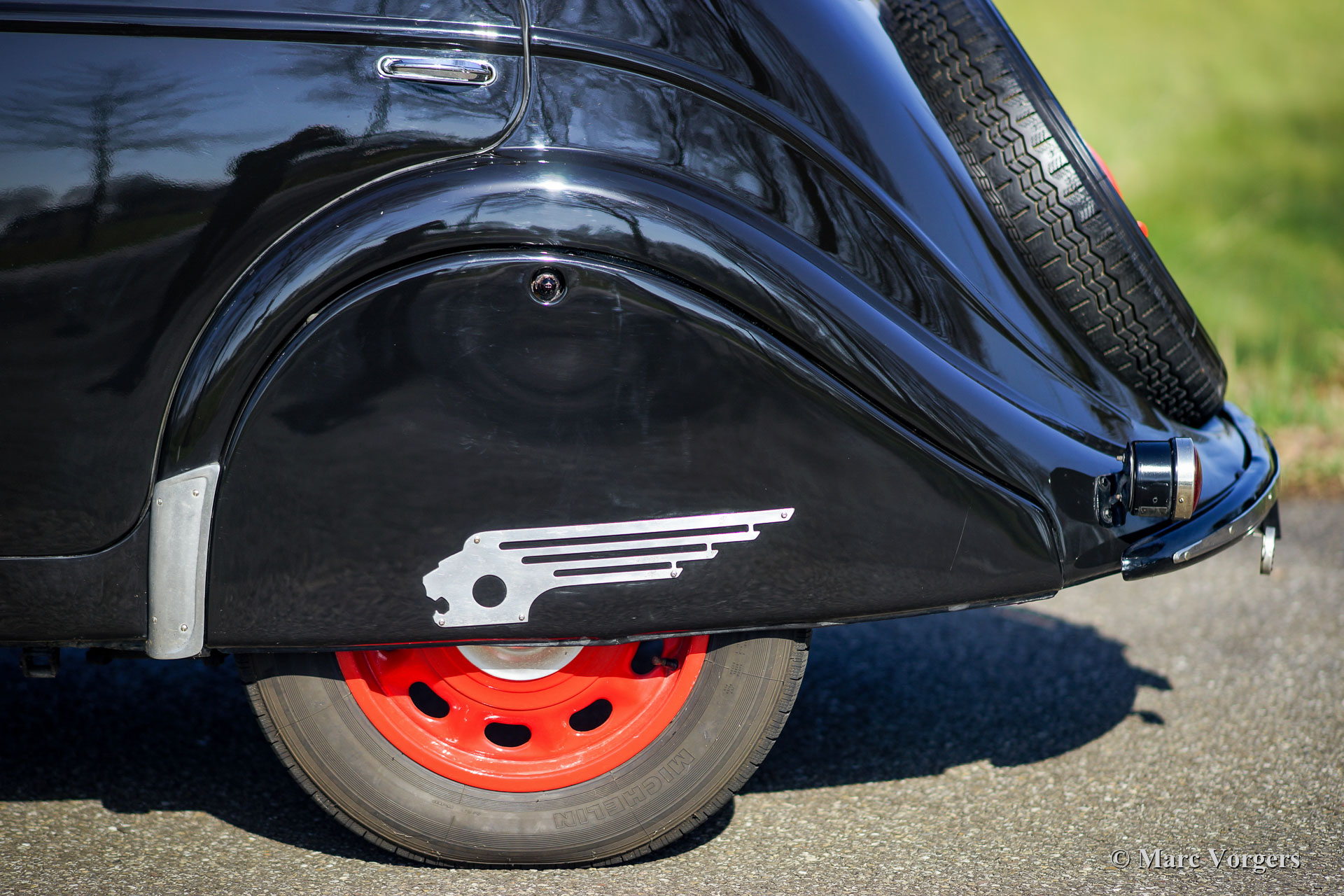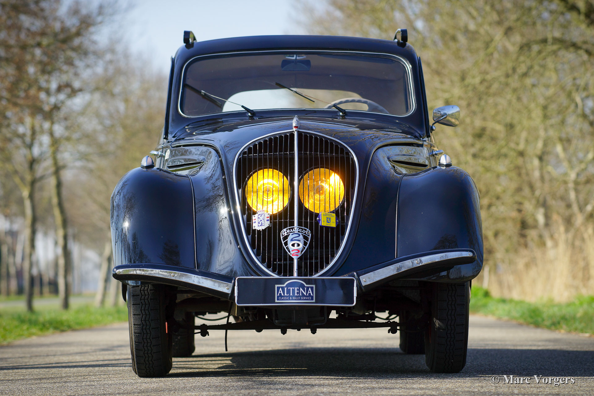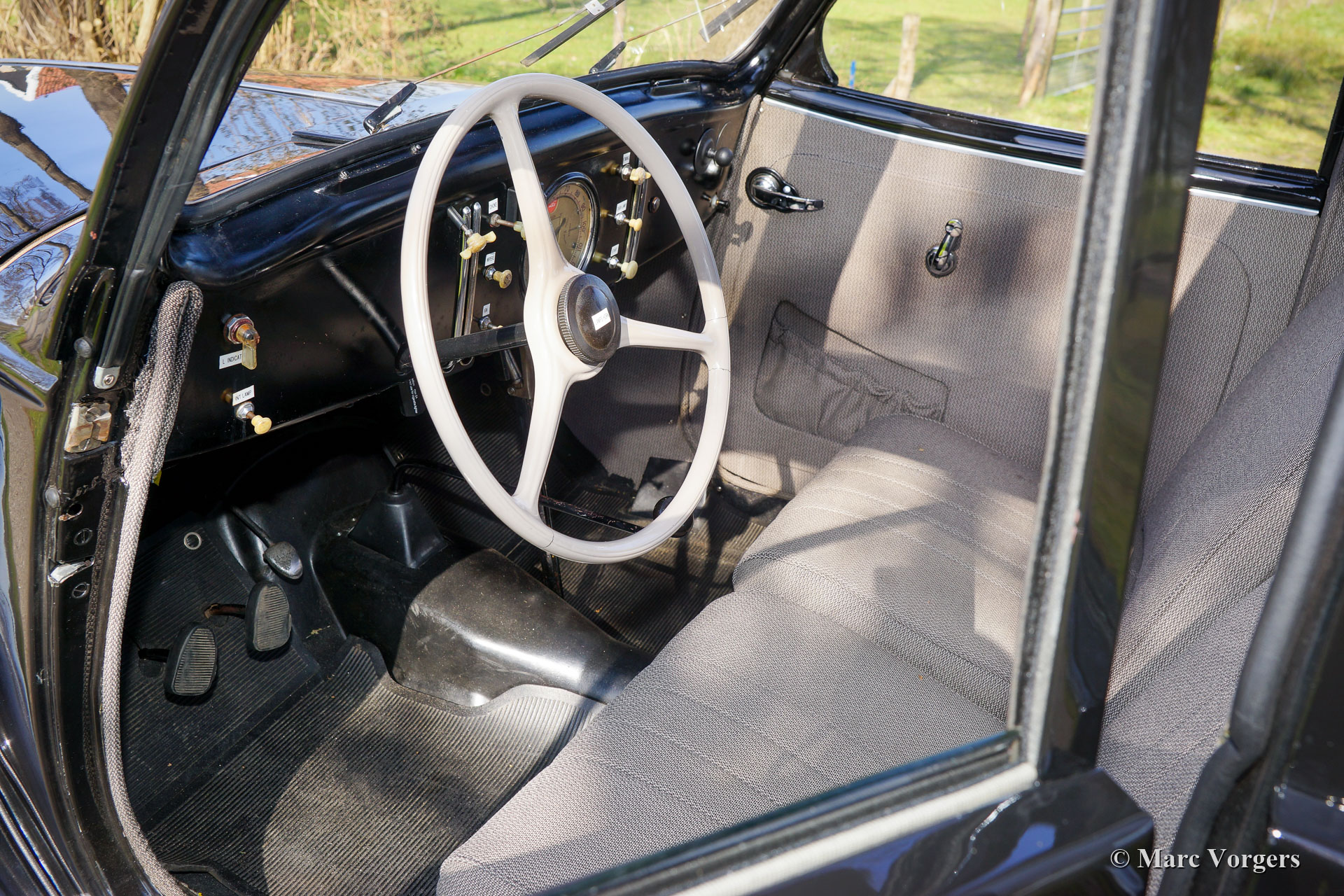 Peugeot 202 saloon, year 1940. Exterior colour black with wheels painted red. Grey melange interior upholstery and black rubber protective mats. The Peugeot 202 is a compact version of the 402, both models were presented in 1939 and featured a wonderful aerodynamic design. The 202 was available as four-door saloon (Berline), four-door cabriolet (decapotabe) and two-door drophead Coupé. The 202 is fitted with a four-cylinder 1133 cc engine and a three-speed synchronised gearbox with column change. The presented Peugeot 202 is in a very good condition, the bodywork is in wonderful condition, the interior was newly upholstered in the past, the very nice original dashboard gauges are working. The car shows beautiful original details, and it features an original sliding sunroof and a roof rack. The car is fully up-to-date and was serviced by Altena Classic Service. In the hands of the last owner the Peugeot 202 participated in historic pre-war car events like the 2019 Paris-Amsterdam. This splendid Peugeot 202 is a delightful driver car and a fantastic find for the pre-war car enthusiast.