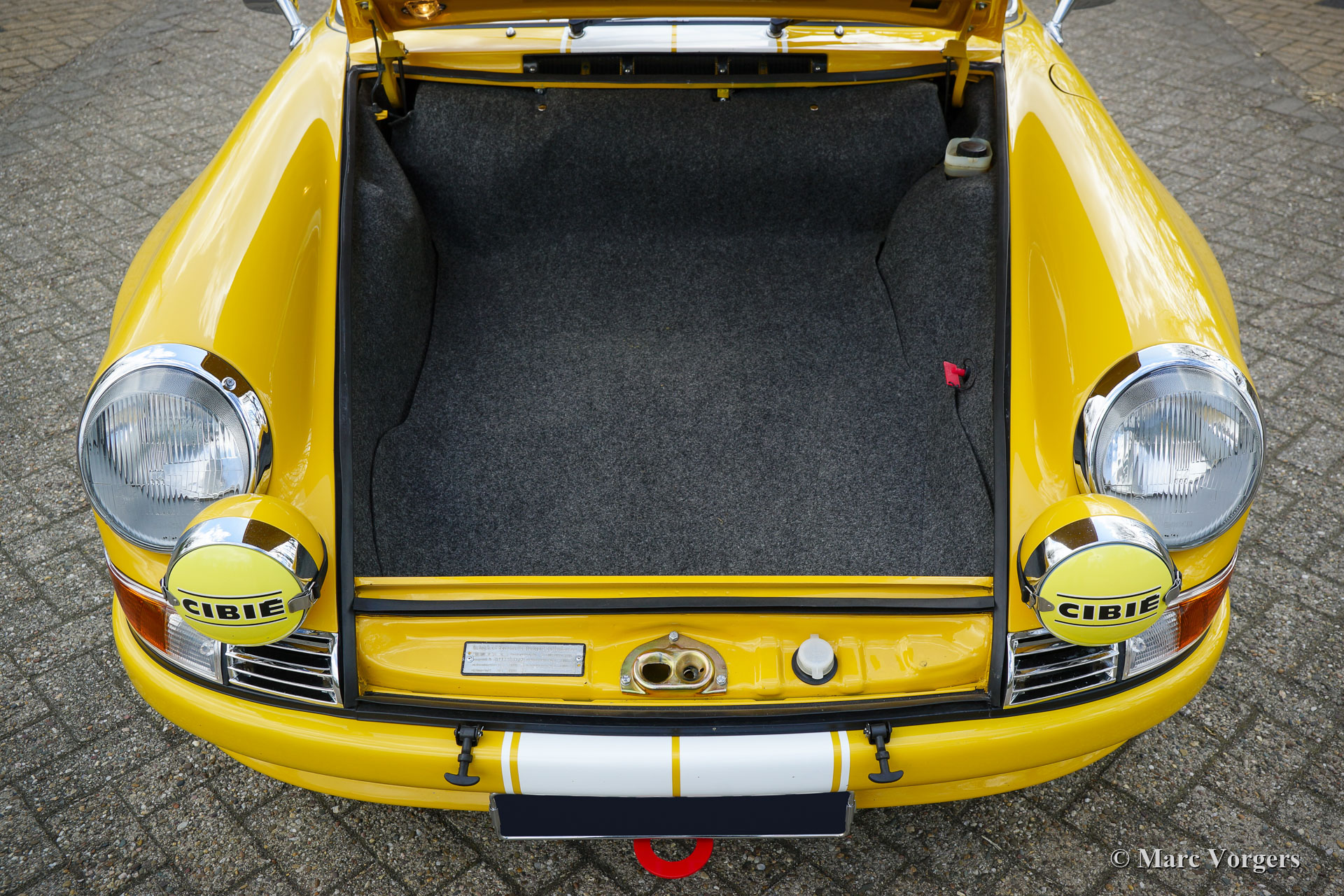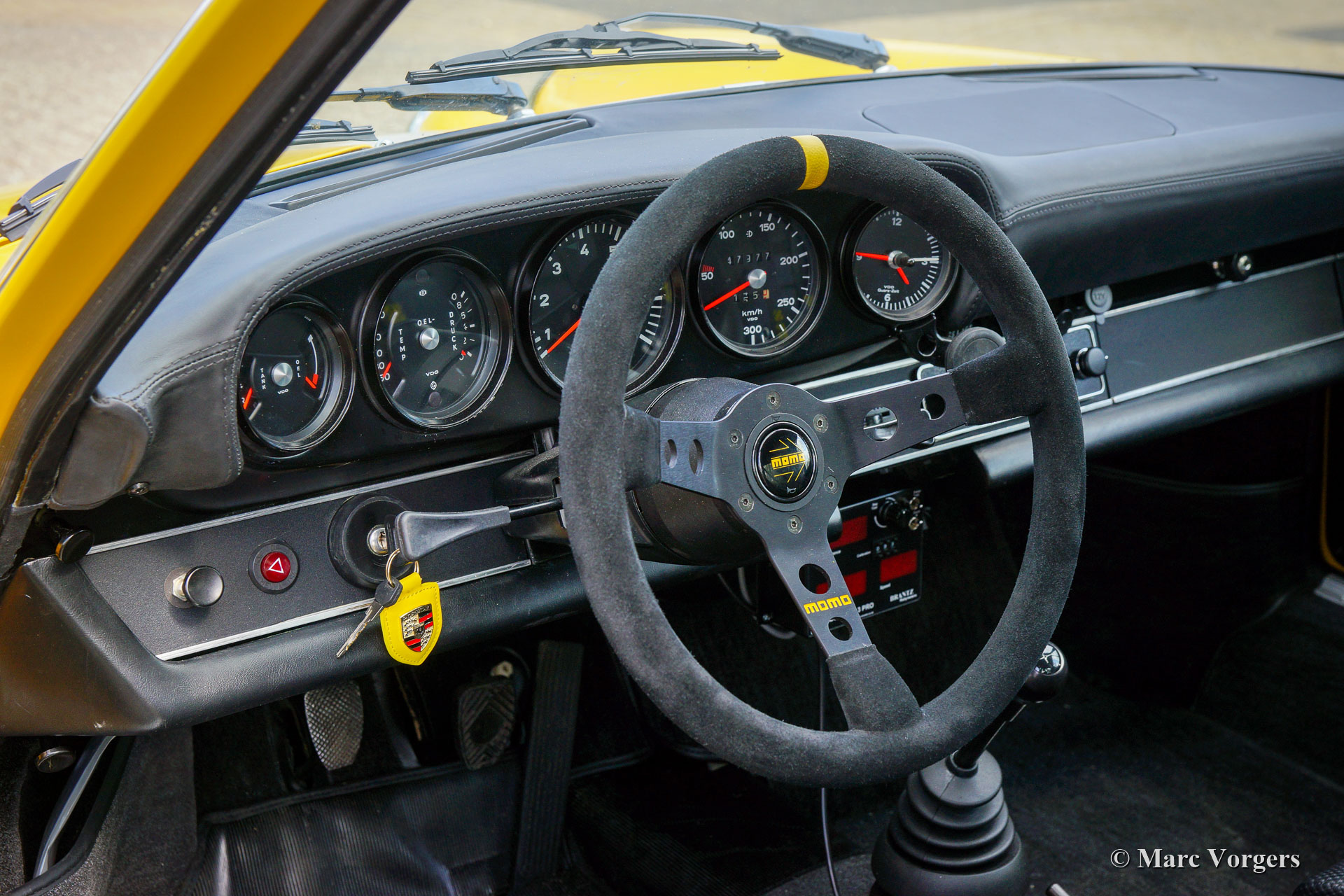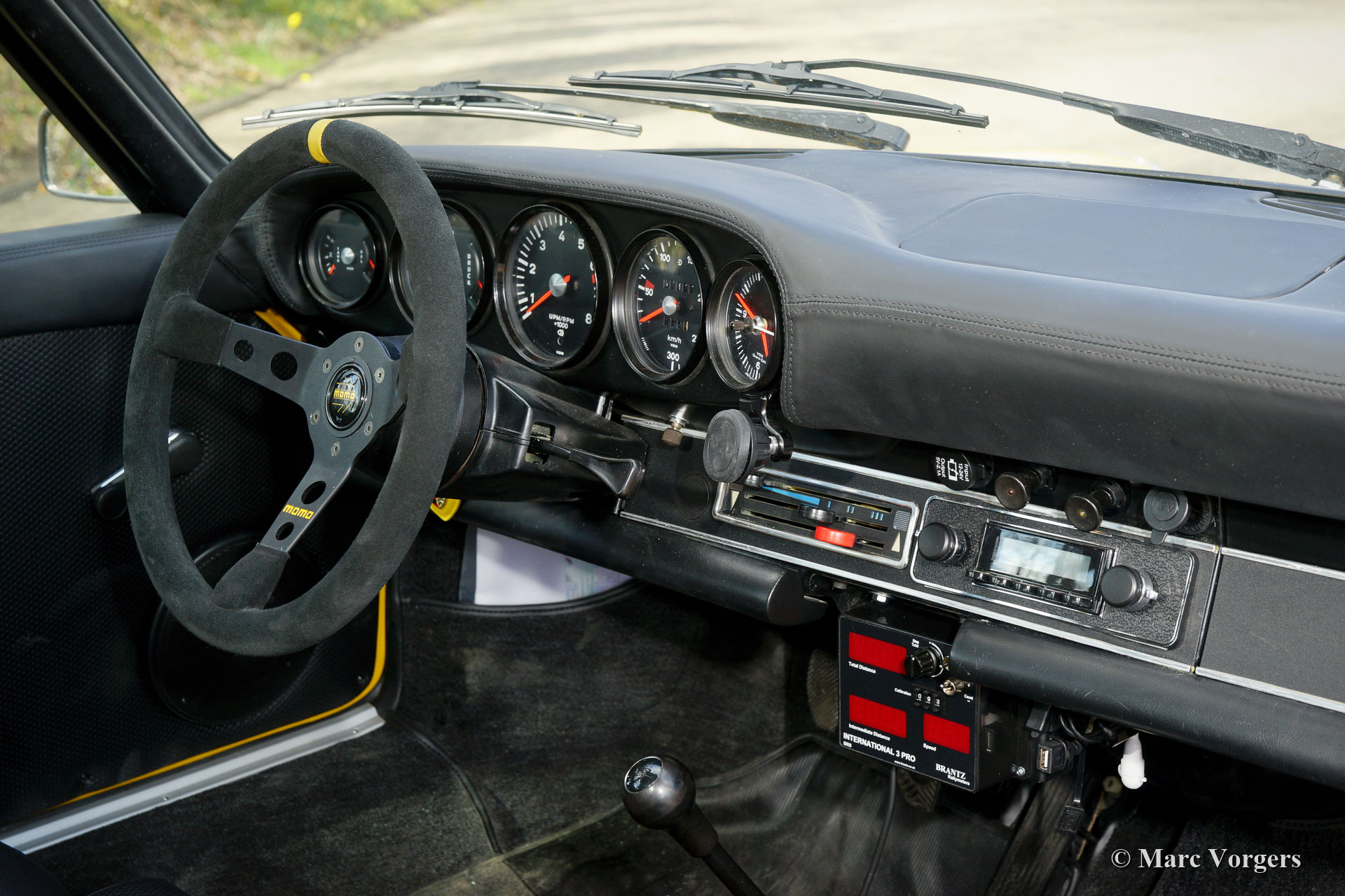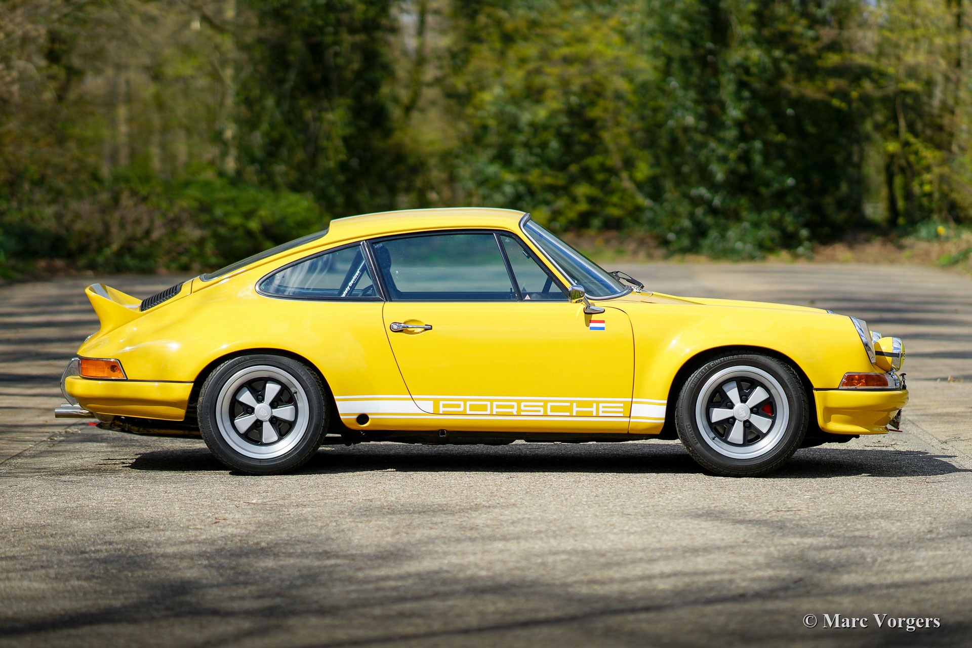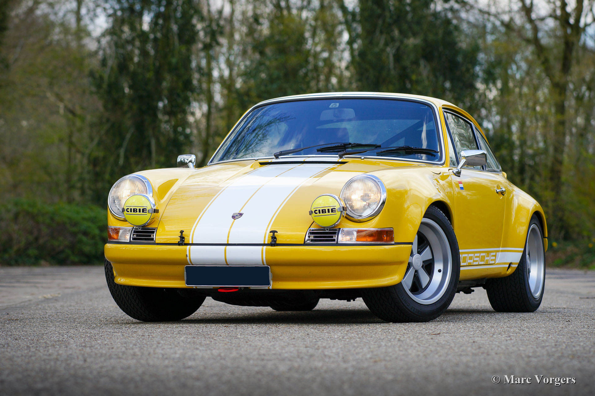 Porsche 911 2.4 “ST”, year 1973. First registration on 8 May 1974. Colour yellow (Porsche Speedgelb) combined with a black leather / leathercloth interior. This magnificent Porsche 911 2.4 T (“long nose” F-series) was extensively restored and modified to 911 “ST” look by Classic Job. The restoration was completed in August 2020. The restoration included a full strip-down, body sheet metal restoration, with the implementation of wider ST style fenders and new paintwork in Minardi yellow. The 2.4 litre six-cylinder boxer engine was fully stripped down and completely overhauled, as were the two triple Weber carburettors. The engine was fitted with MSD digital ignition and sports air-filters. The engine delivers 200 bhp and it runs and sounds superbly. The interior was completely new upholstered with black leather / leathercloth and special bucket seats were fitted. Photo reports of the restoration and of the engine overhaul are present. Study the photo report of the restoration HERE to see all the details. The engine rebuild was also photographed, study the photo report HERE. This fantastic Porsche 911 2.4 ST is in a superb top condition and the car drives and handles perfectly. Matching numbers engine and gearbox. The driving experience is fantastic and this wonderful Porsche 911 “ST” is a true head-turner. The car is fitted with a 915 5-speed gearbox, white sports striping, and Porsche lettering on the doors, a special Momo sports steering wheel, a modern “classic” Bluetooth car radio, 4-point safety harnesses, a rollbar, wide Fuchs style alloy wheels, a “duck-tail” bonnet, a Stainless-Steel exhaust system, a Brantz International 3 Pro digital tripmaster and Cibië Oscar auxiliary lamps with Cibië covers.