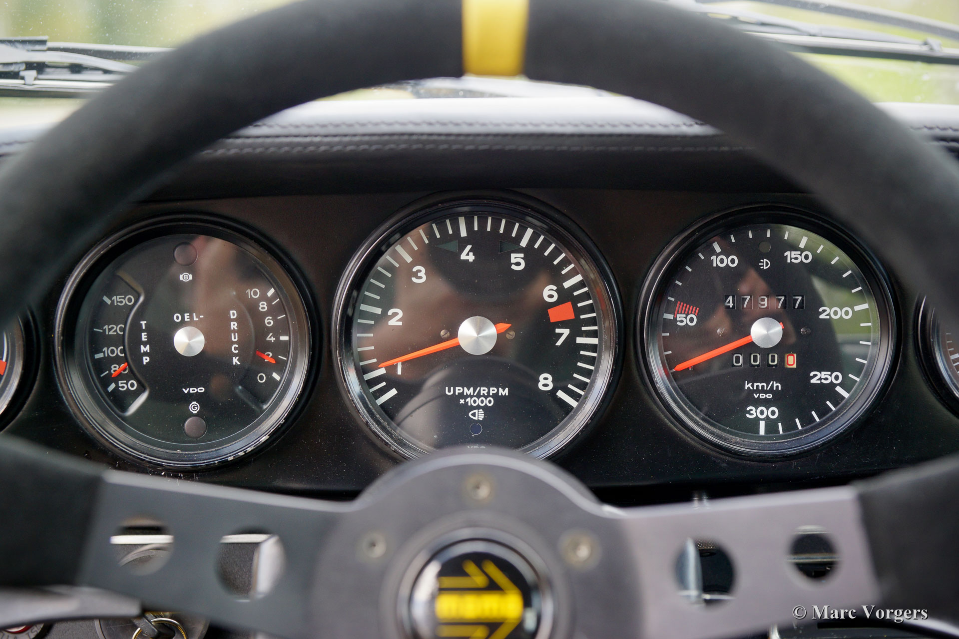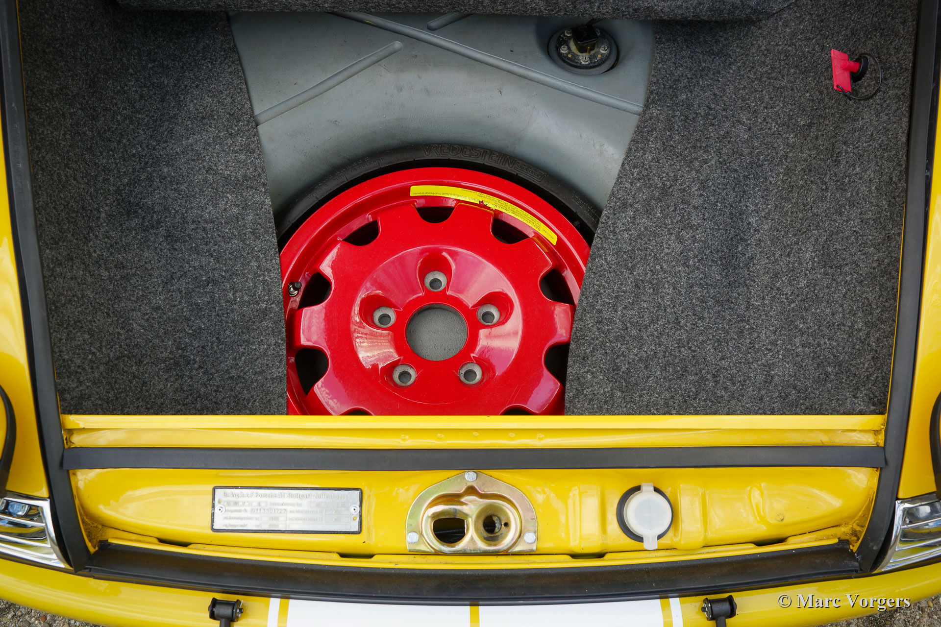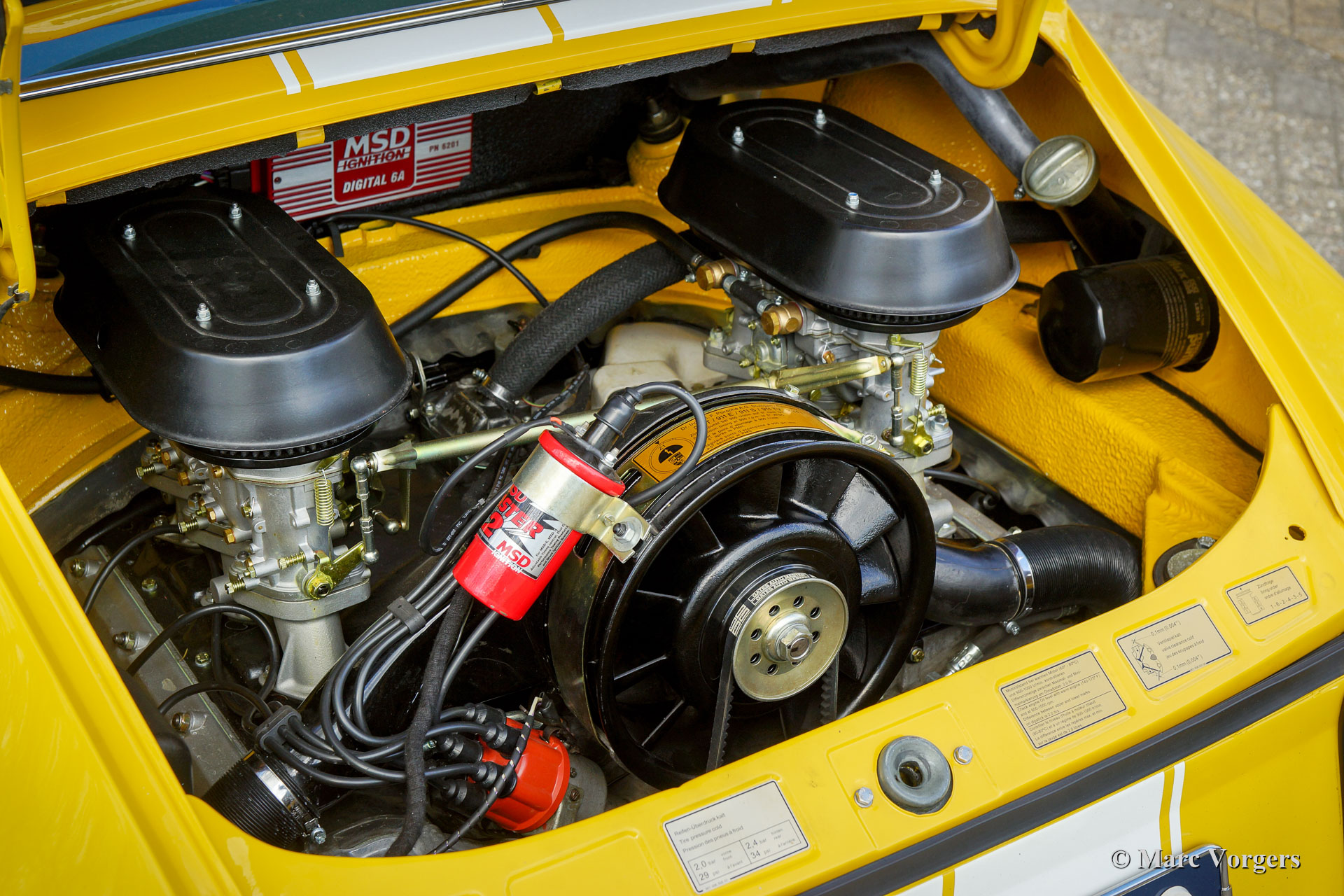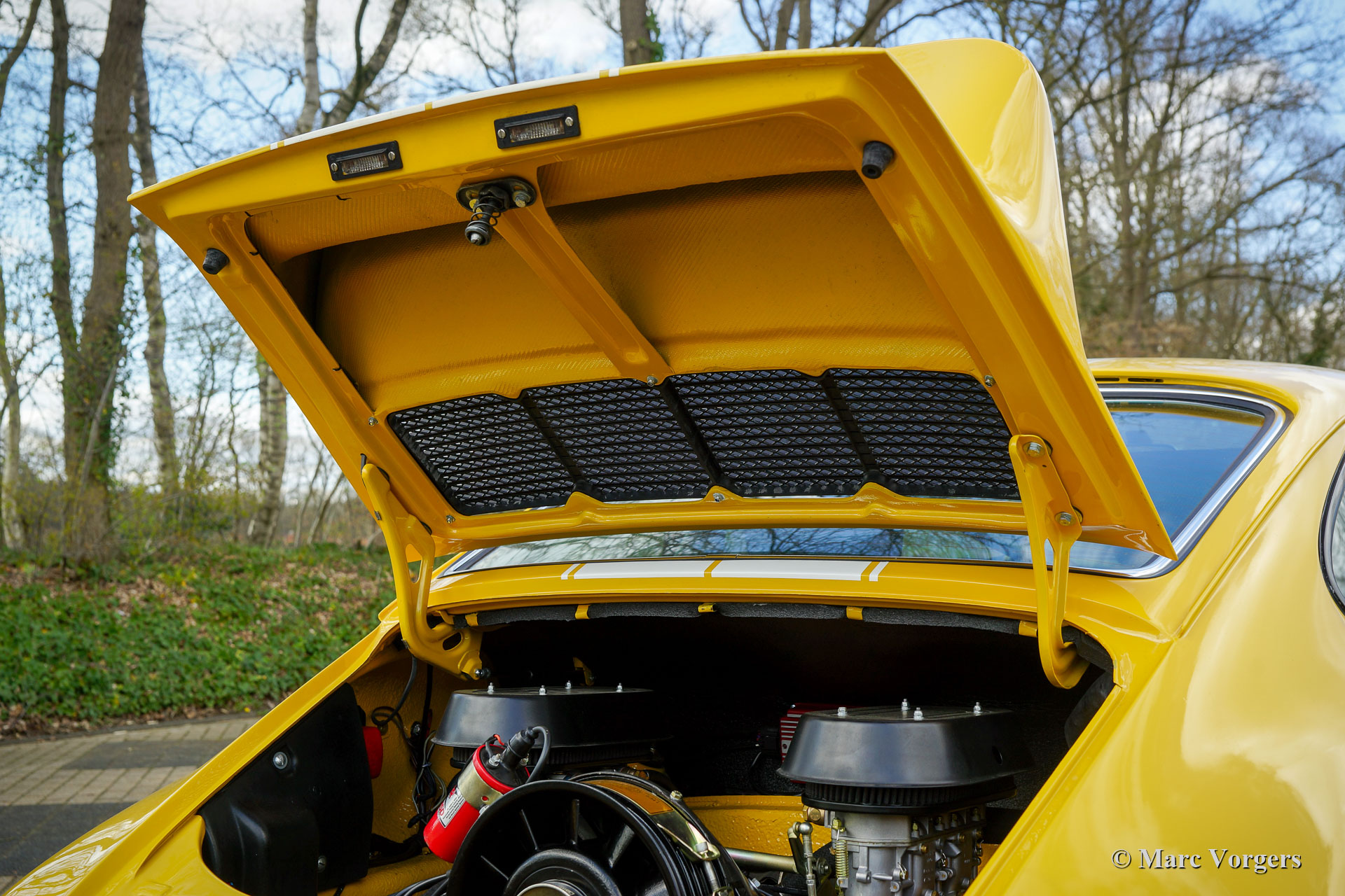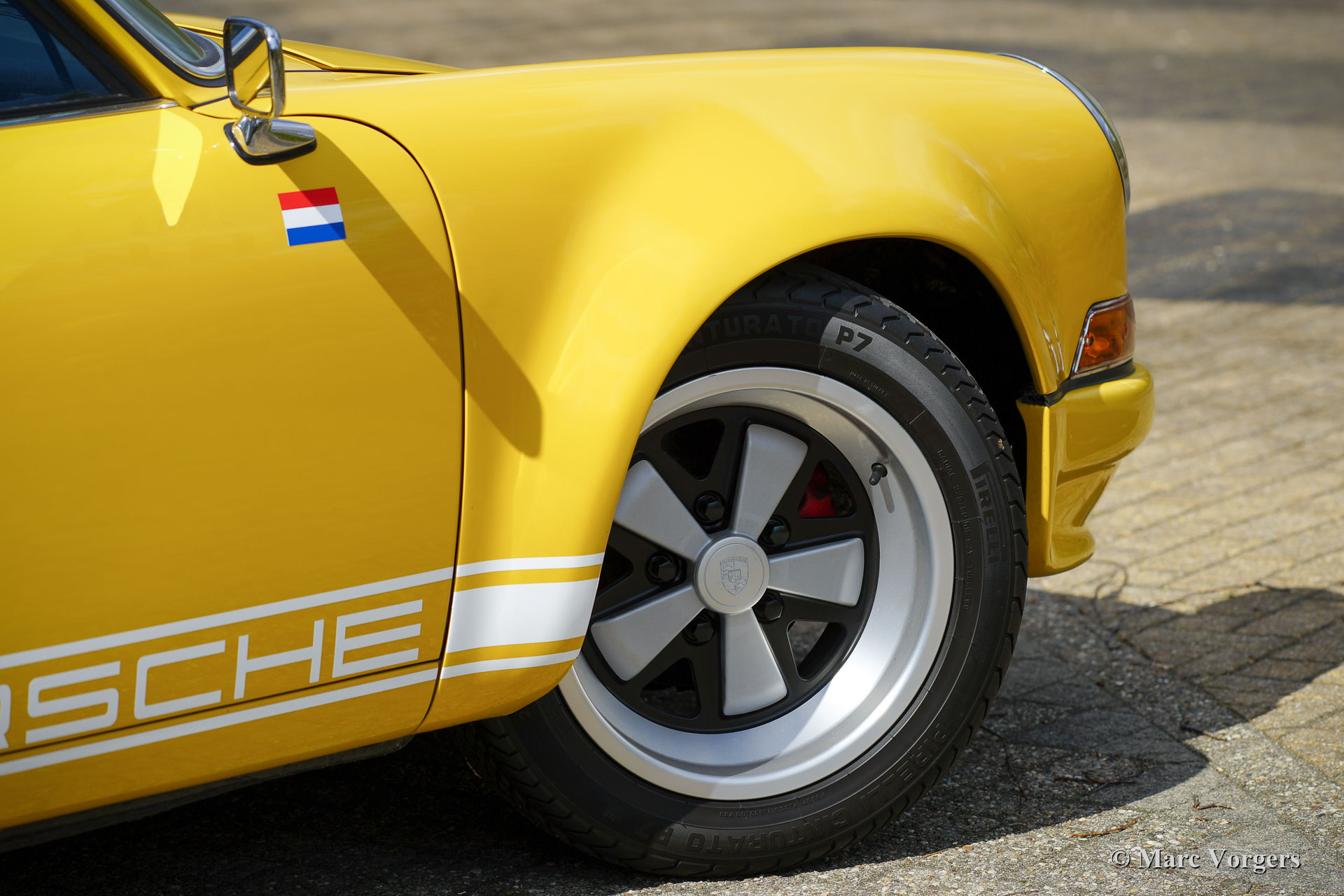 Porsche 911 2.4 “ST”, year 1973. First registration on 8 May 1974. Colour yellow (Porsche Speedgelb) combined with a black leather / leathercloth interior. This magnificent Porsche 911 2.4 T (“long nose” F-series) was extensively restored and modified to 911 “ST” look by Classic Job. The restoration was completed in August 2020. The restoration included a full strip-down, body sheet metal restoration, with the implementation of wider ST style fenders and new paintwork in Minardi yellow. The 2.4 litre six-cylinder boxer engine was fully stripped down and completely overhauled, as were the two triple Weber carburettors. The engine was fitted with MSD digital ignition and sports air-filters. The engine delivers 200 bhp and it runs and sounds superbly. The interior was completely new upholstered with black leather / leathercloth and special bucket seats were fitted. Photo reports of the restoration and of the engine overhaul are present. Study the photo report of the restoration HERE to see all the details. The engine rebuild was also photographed, study the photo report HERE. This fantastic Porsche 911 2.4 ST is in a superb top condition and the car drives and handles perfectly. Matching numbers engine and gearbox. The driving experience is fantastic and this wonderful Porsche 911 “ST” is a true head-turner. The car is fitted with a 915 5-speed gearbox, white sports striping, and Porsche lettering on the doors, a special Momo sports steering wheel, a modern “classic” Bluetooth car radio, 4-point safety harnesses, a rollbar, wide Fuchs style alloy wheels, a “duck-tail” bonnet, a Stainless-Steel exhaust system, a Brantz International 3 Pro digital tripmaster and Cibië Oscar auxiliary lamps with Cibië covers.