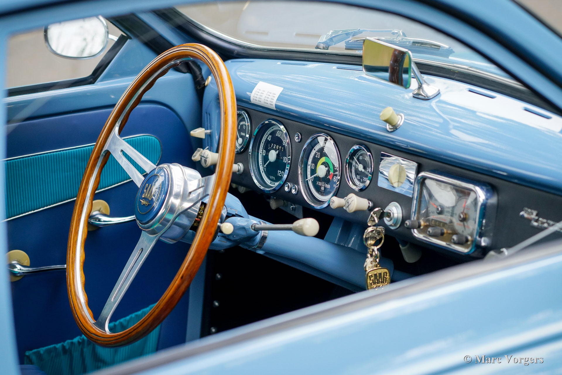 Saab 93B Granturismo 750, year 1959. Bodywork finished in blue combined with a blue green vinyl/cloth interior trimmed with silver piping. This very special Saab Granturismo 750 comes from the rare second ‘B’ series of which only four cars are still known to exist! The Saab was sold new to the USA where it was registered in 1959. In the year 2018 the Saab was shipped to the Netherlands where the automobile was extensively and perfectly restored to original factory specifications. Costs nor effort were spared aiming for perfection. The bodywork was stripped to the naked metal and restored, the interior was newly upholstered using the correct materials, and the mechanical components were overhauled by professional specialists. This rare example is in a superb top condition, which will appeal to discerning collectors. The Saab 93 GT750, introduced at the 1958 New York Automobile Show, was an early attempt to combine sportiness and luxury, a novel concept at the time. Developed specifically for the American market, it was a modified version of the standard 93B. Its three cylinder two-stroke engine was upgraded from 38bhp to 50bhp, and a 57bhp Super version was also available for racing. These modifications, a significant power increase for its era, were done by hand in a special department after the cars left the production line. The GT750 featured a sports interior with a special dashboard, wooden steering wheel, and adjustable seats. It was the first car to be fitted with seatbelts as standard, specifically two-point lap belts. A limited initial run was shipped to the US in mid-1958. Despite initial success, sales declined, and production, originally planned for 500-600 units, was scaled back to an estimated 250-300 cars. In terms of rarity, this Saab ranks third in Saab history. Four Ursaab prototypes were built between 1946 and 1947, and six Saab 94 Sonnett I prototypes were built between 1956 and 1957. In third place is the Saab 93B Granturismo 750. This is a unique chance to add a true museum piece to your (Saab) collection!