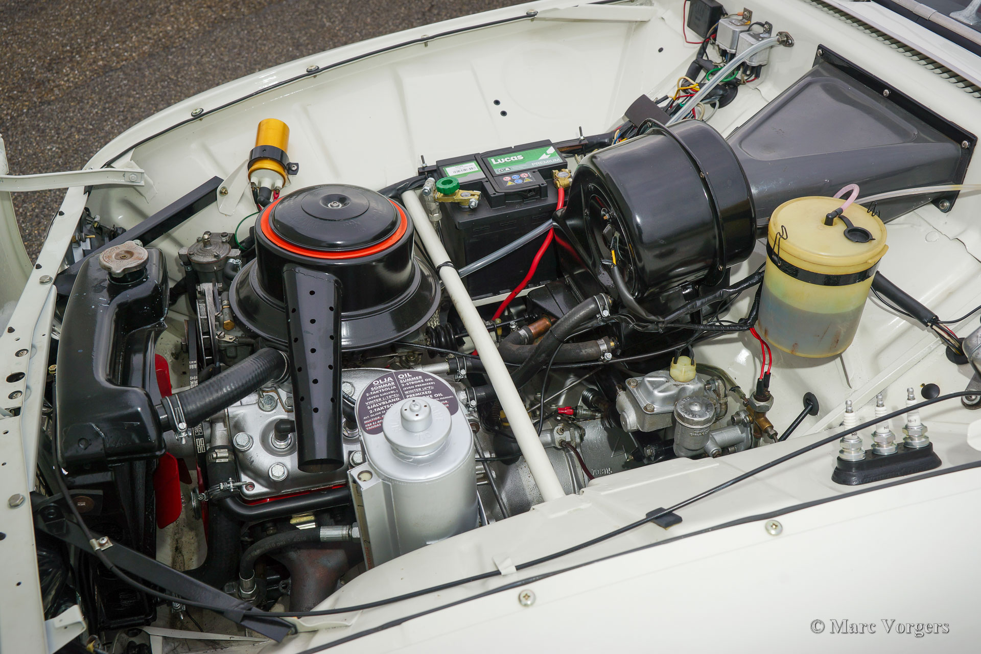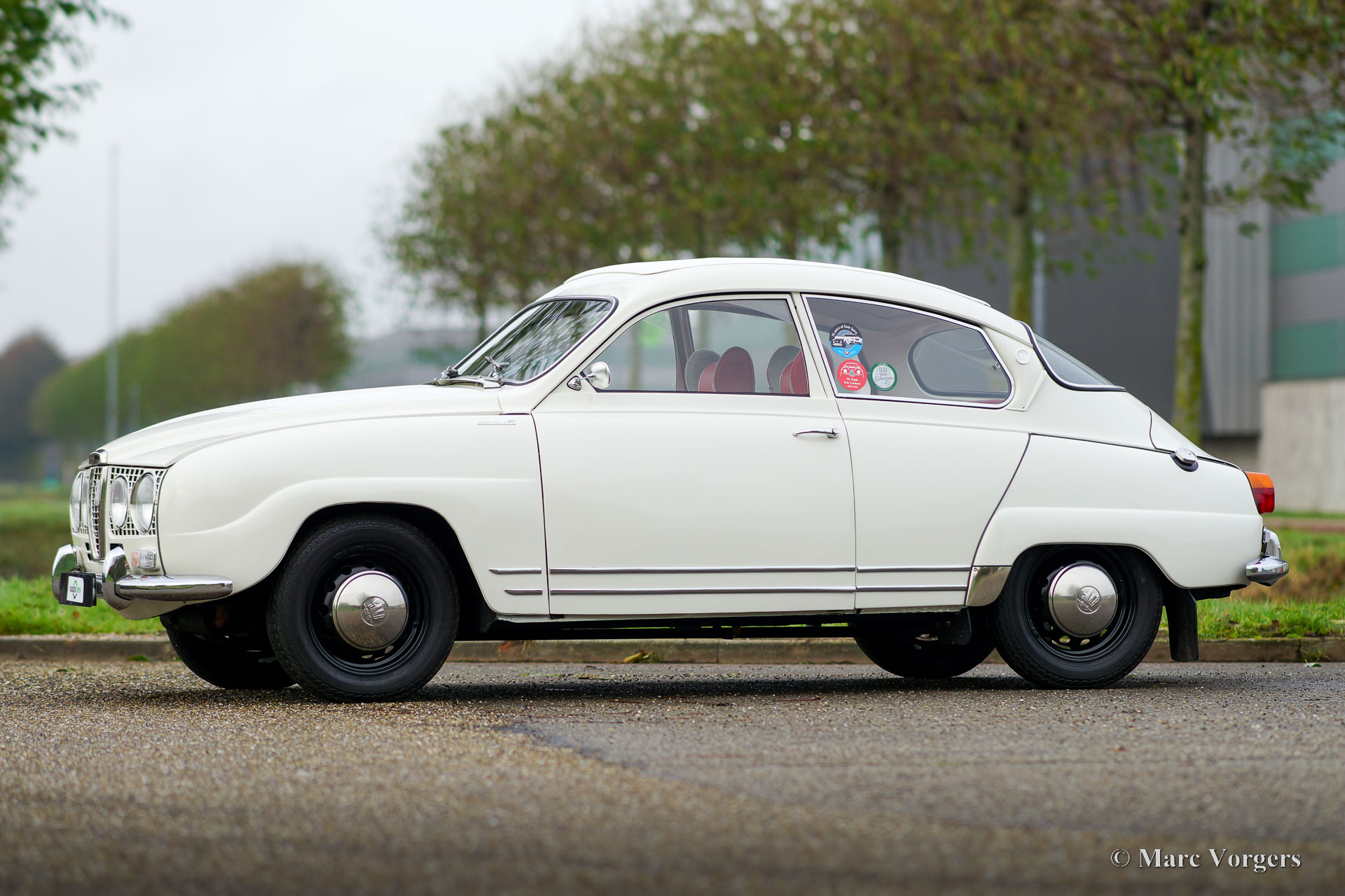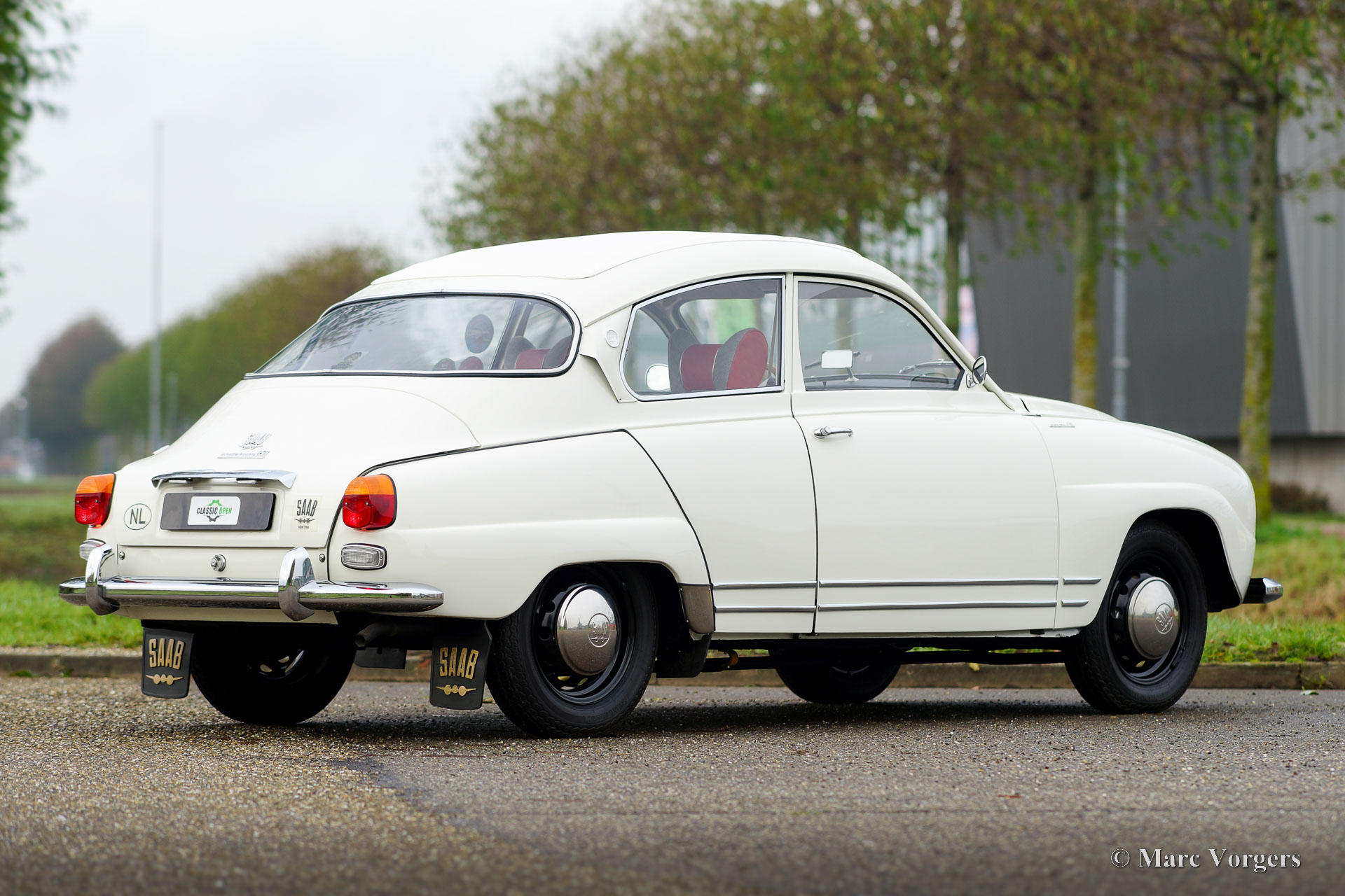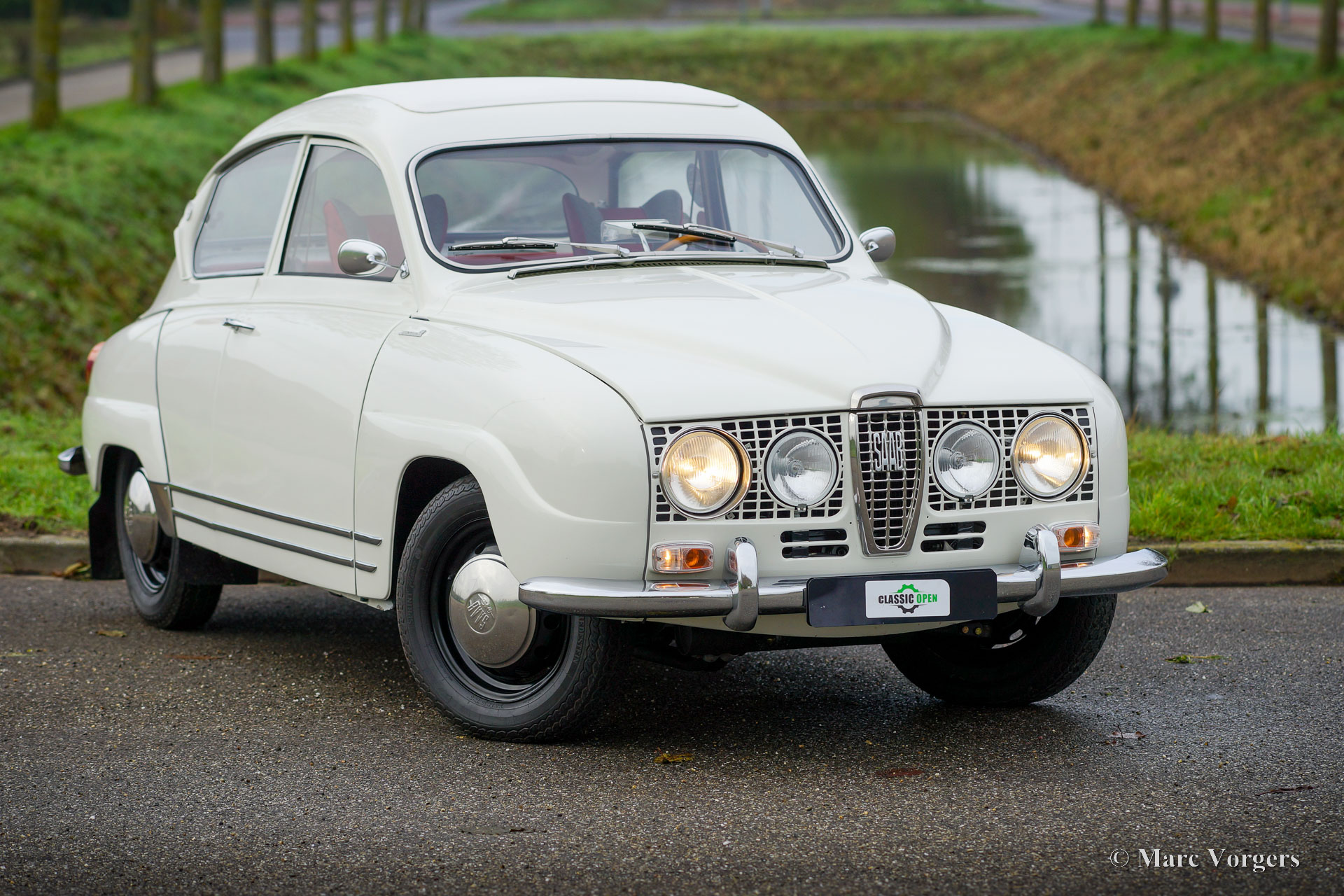 Saab 96 Monte Carlo 850, year 1966. Colour white combined with a red / grey sport interior. This fantastic ‘long-nose’ Saab 96 with 850 cc two-stroke engine is an original and rare Monte Carlo model. The car was wonderfully restored and overhauled to perfection in the years 2017 – 2020. A photo report of the restoration is present. Everything was restored to original specifications including the interior which shows the correct red vinyl, grey wool, and silver piping on the seats and door panels. The original sporty Monte Carlo dashboard looks impressive with all the gauges and the Monte Carlo badge. This car was factory fitted with a sliding / folding roof which opens as fas as the rear bench! The open top experience can be enjoyed by all passengers. The ‘long-nose’ model features two additional Hella spot lamps in the grille, just like the successful factory rally cars of the period. The perfectly overhauled 3-cylinder 850 cc two stroke engine is fitted with three carburettors and a special air-filter. Under the bonnet you also find a special oil tank for the automatic two stroke oil lubrication of the engine. This ultra-desirable Saab features a four-speed gearbox with steering column shifter and disc brakes on the front wheels. The Saab Monte Carlo 850 is a Saab collectors dream, this superbly restored example will be the pride of any Saab enthusiast!