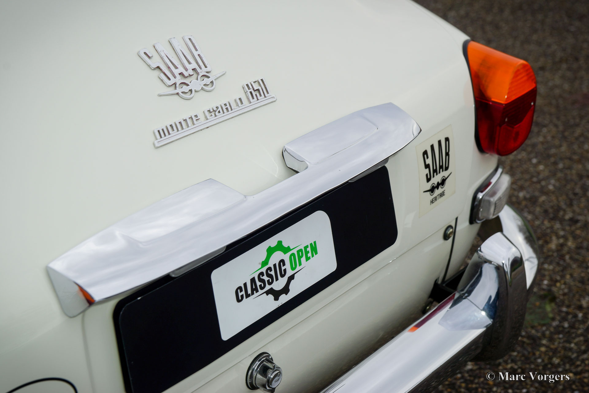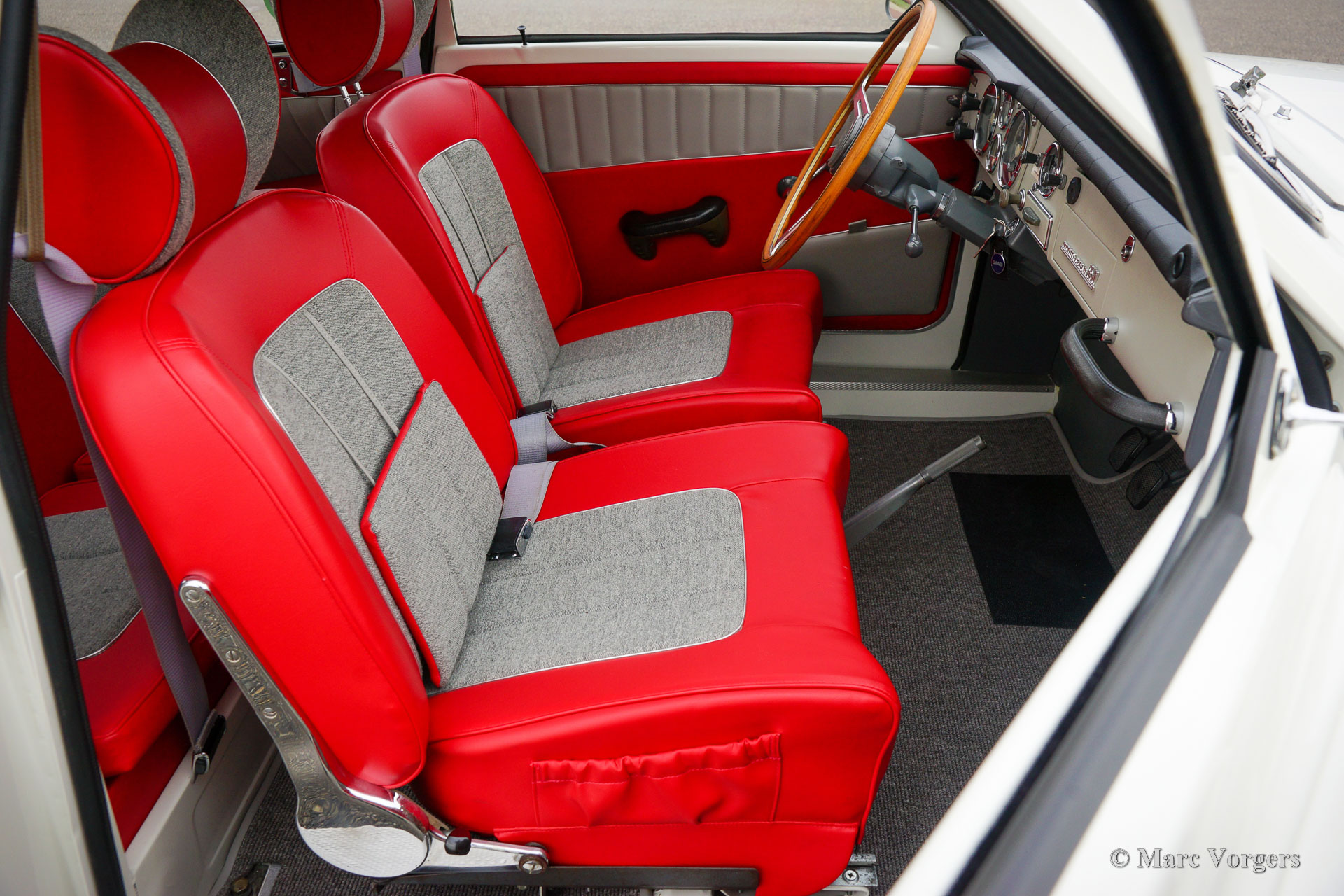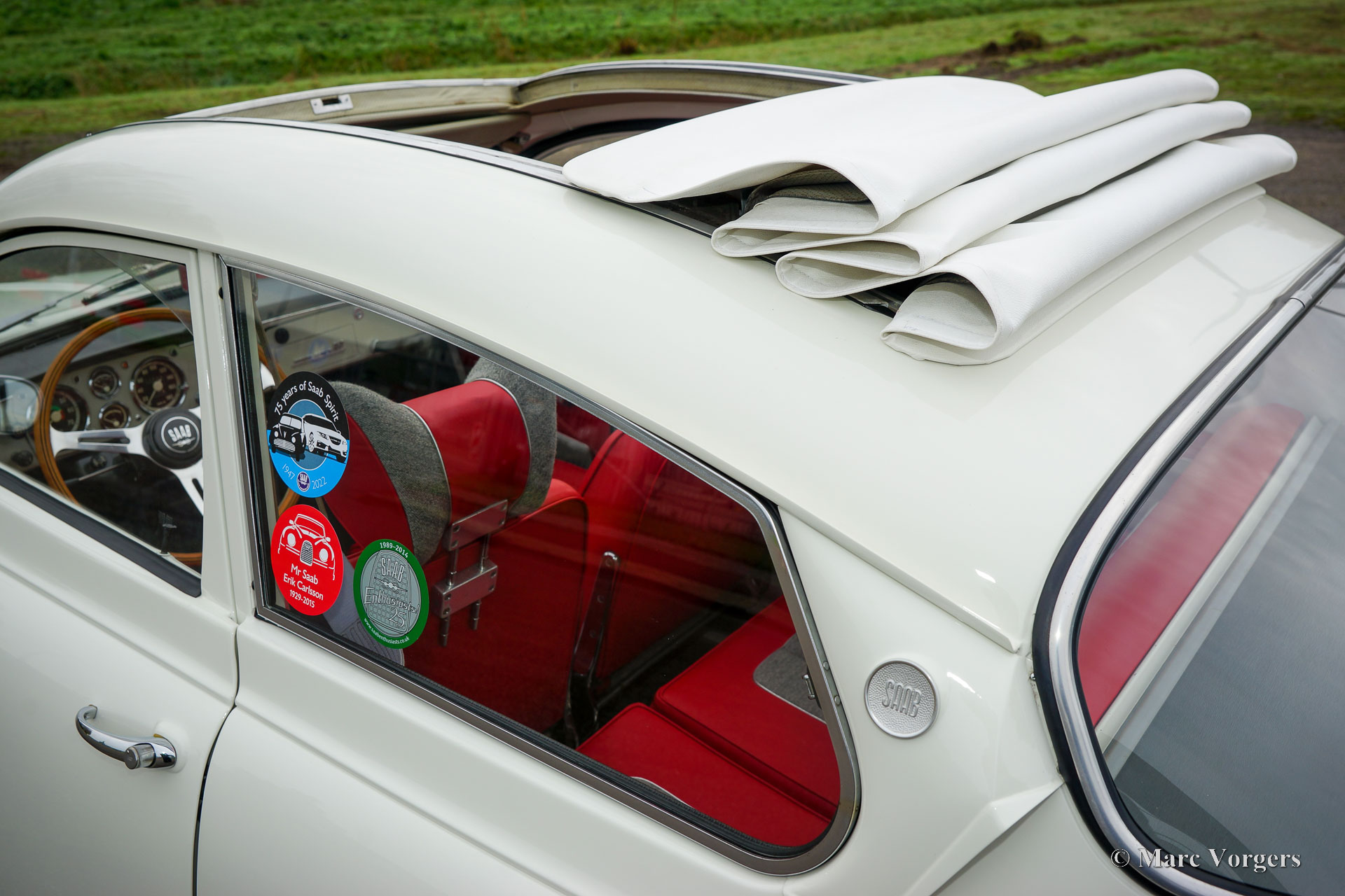 Saab 96 Monte Carlo 850, year 1966. Colour white combined with a red / grey sport interior. This fantastic ‘long-nose’ Saab 96 with 850 cc two-stroke engine is an original and rare Monte Carlo model. The car was wonderfully restored and overhauled to perfection in the years 2017 – 2020. A photo report of the restoration is present. Everything was restored to original specifications including the interior which shows the correct red vinyl, grey wool, and silver piping on the seats and door panels. The original sporty Monte Carlo dashboard looks impressive with all the gauges and the Monte Carlo badge. This car was factory fitted with a sliding / folding roof which opens as fas as the rear bench! The open top experience can be enjoyed by all passengers. The ‘long-nose’ model features two additional Hella spot lamps in the grille, just like the successful factory rally cars of the period. The perfectly overhauled 3-cylinder 850 cc two stroke engine is fitted with three carburettors and a special air-filter. Under the bonnet you also find a special oil tank for the automatic two stroke oil lubrication of the engine. This ultra-desirable Saab features a four-speed gearbox with steering column shifter and disc brakes on the front wheels. The Saab Monte Carlo 850 is a Saab collectors dream, this superbly restored example will be the pride of any Saab enthusiast!