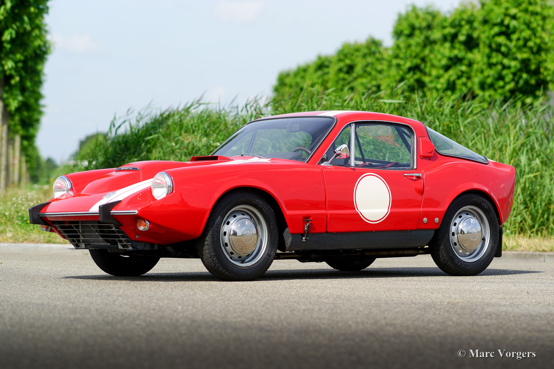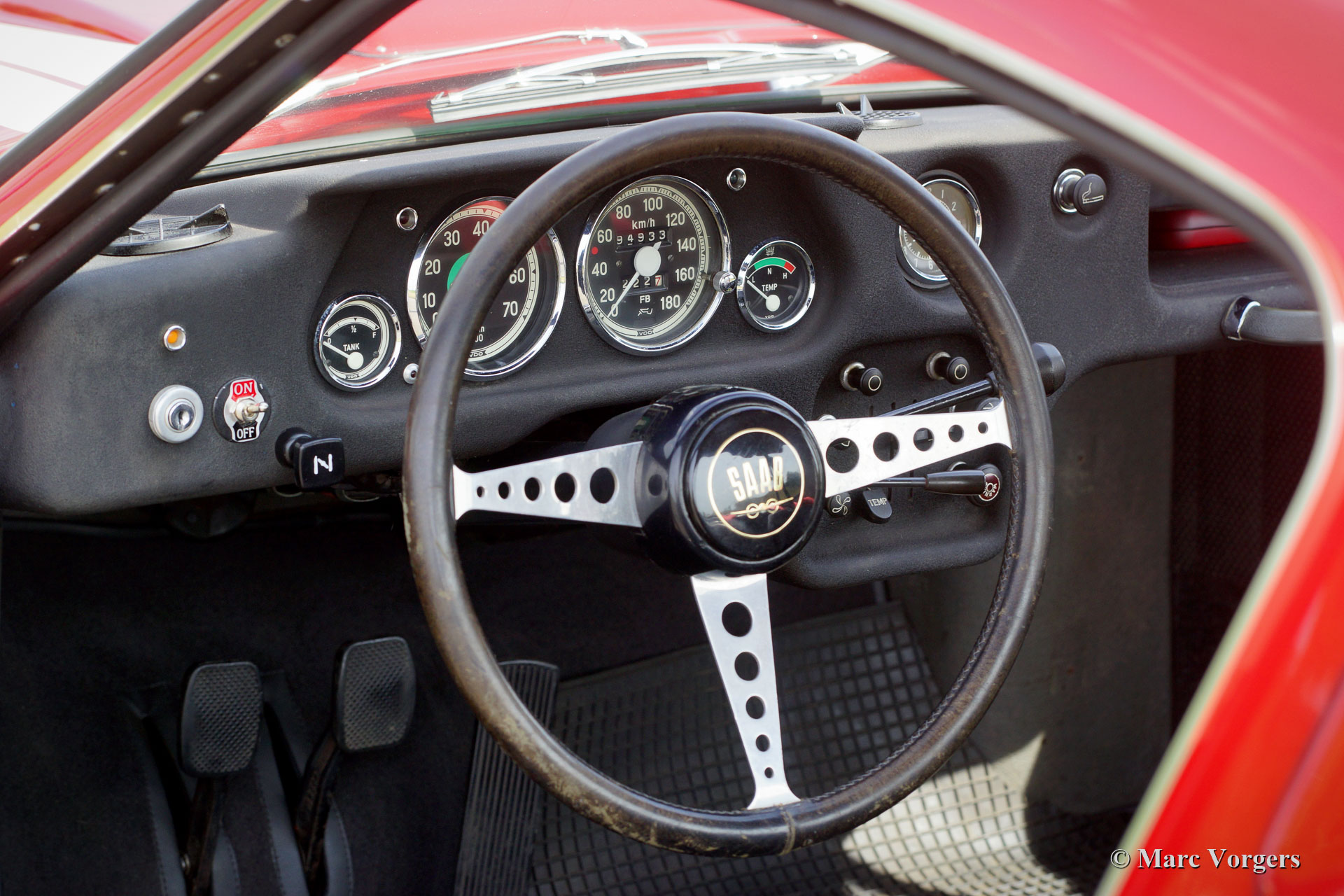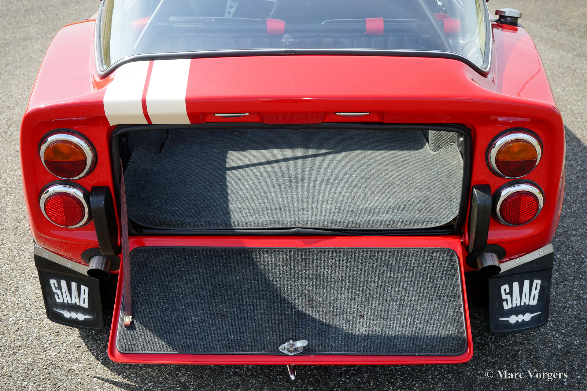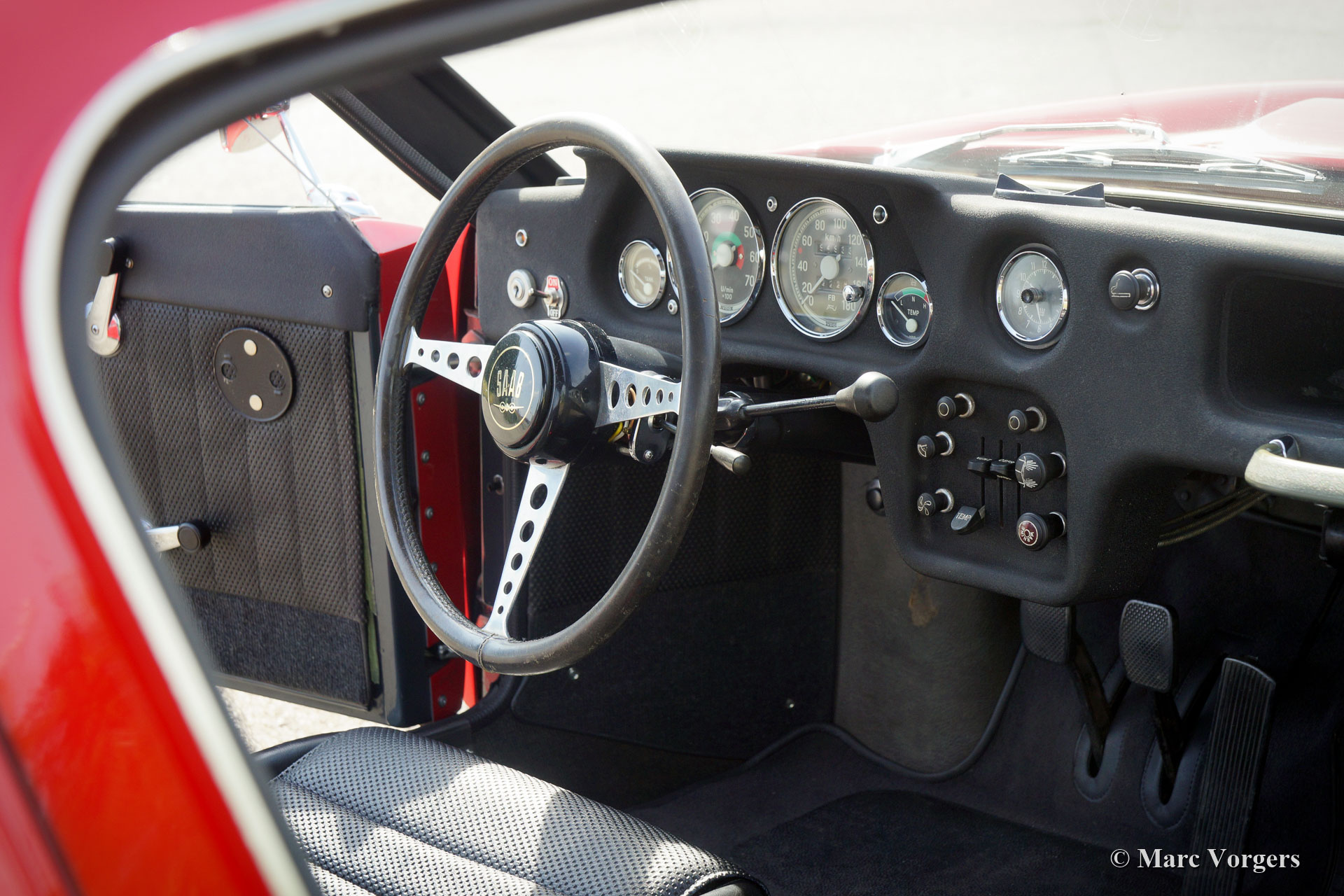 Saab Sonnett II V4, year 1968. Colour red with a black interior. This is a unique Saab Sonnett V4! The automobile was beautifully and extensively restored and rebuilt after it was imported from Germany to the Netherlands. Usually these cars must impress their drivers with 73 bhp under the throttle… THIS example has a SweedSpeed tuned engine delivering a stunning 140 bhp to the front wheels! A massive amount of power considering the weight of only 600 kilogrammes! The original 1500 cc Ford V4 engine was given a capacity of 1853 cc and a host of special parts which make it possible to rev-up to 7000 rpm. The Saab Sonnet features a 4-speed manually operated gearbox with steering column shift; this gearbox works perfectly. This rare classic car is fitted with bucket seats, four-point safety harnesses, 123 tune electronic ignition, an aluminium radiator, an automatic electric cooling-fan, an electric Facet ‘Red Top’ fuel pump, AVO adjustable shock absorbers on all wheels, (boxed) rally type front suspension, a 70 Ampère alternator and a beautifully made Stainless Steel header tank which also acts as a ‘strut’ between the left and right front suspension.