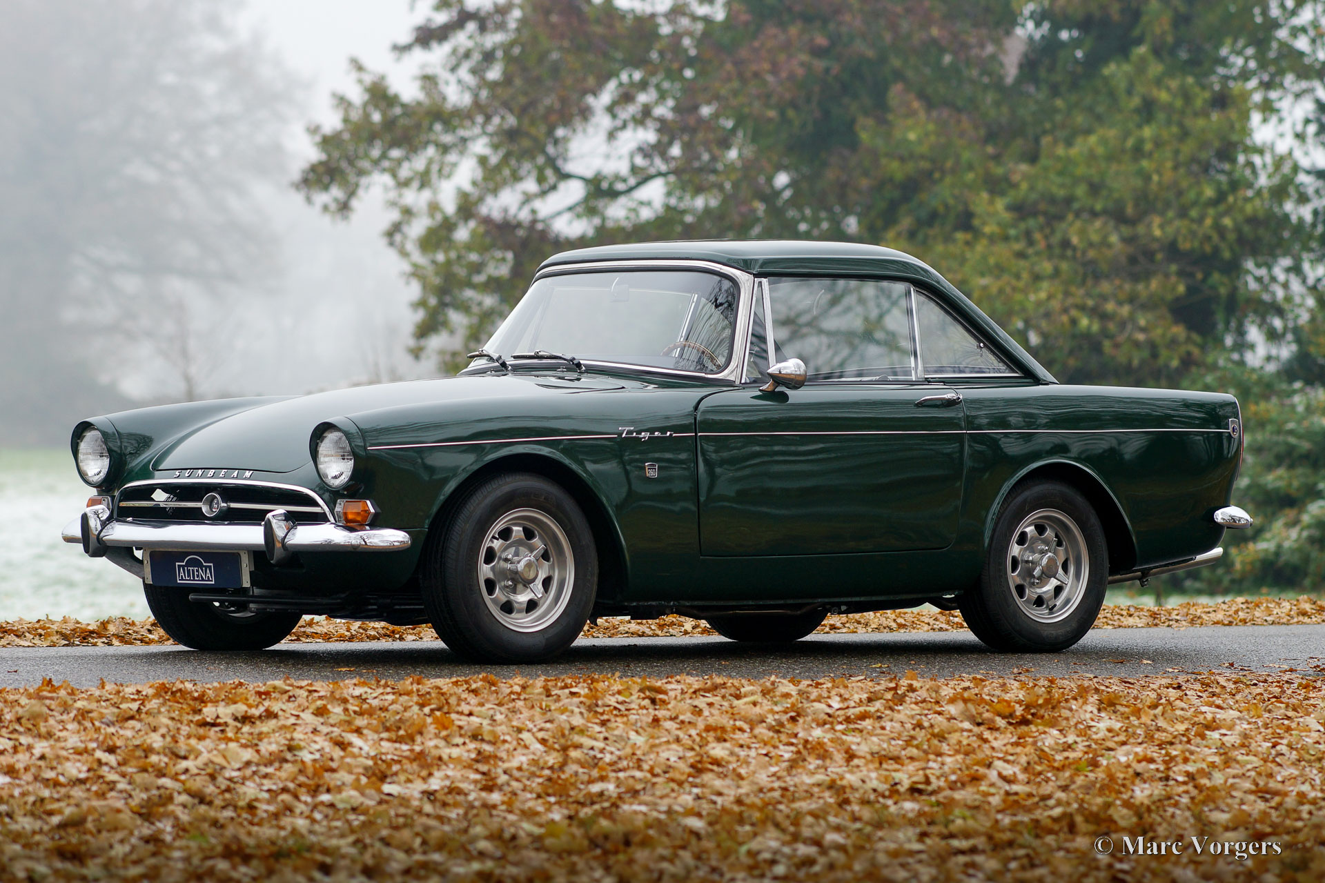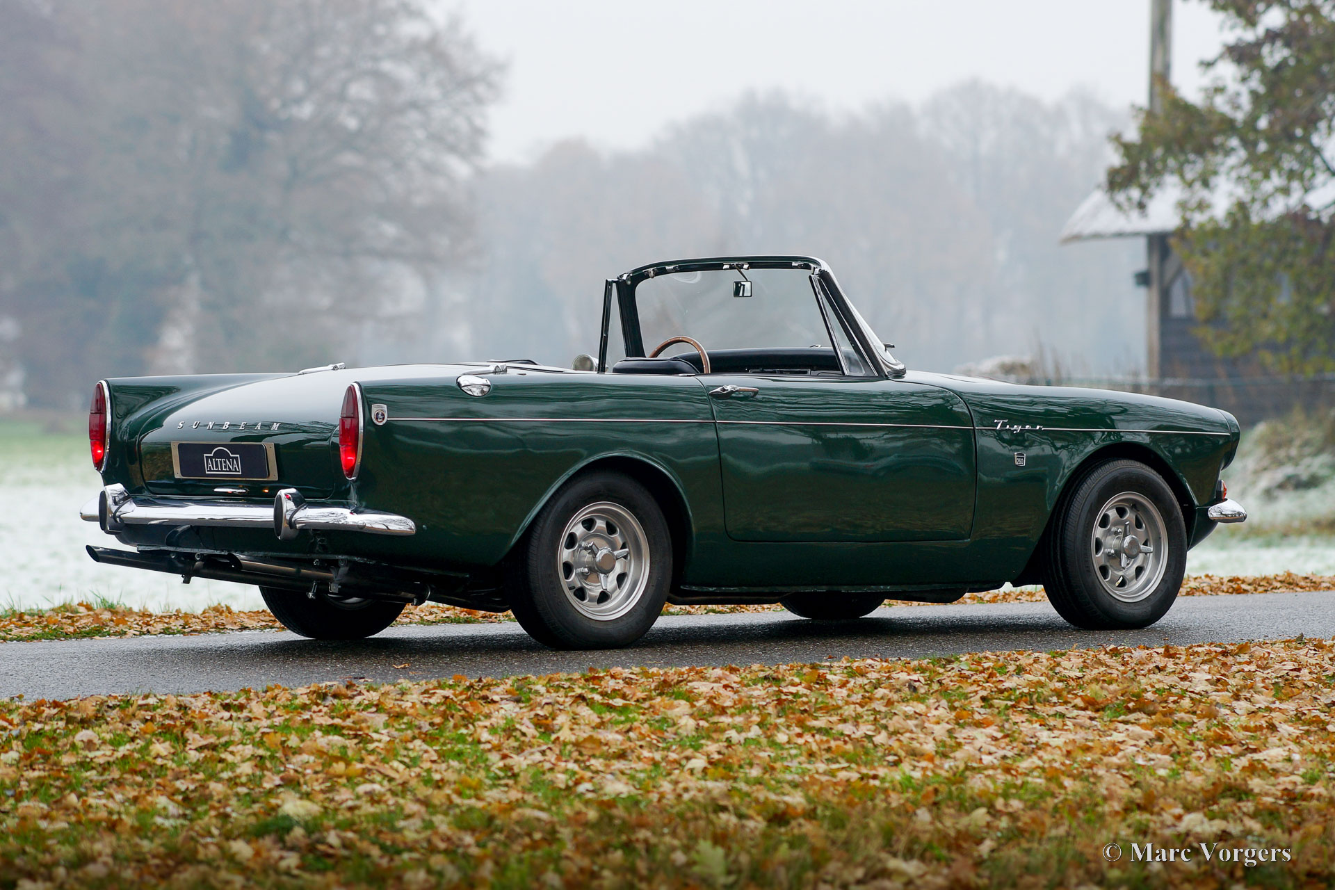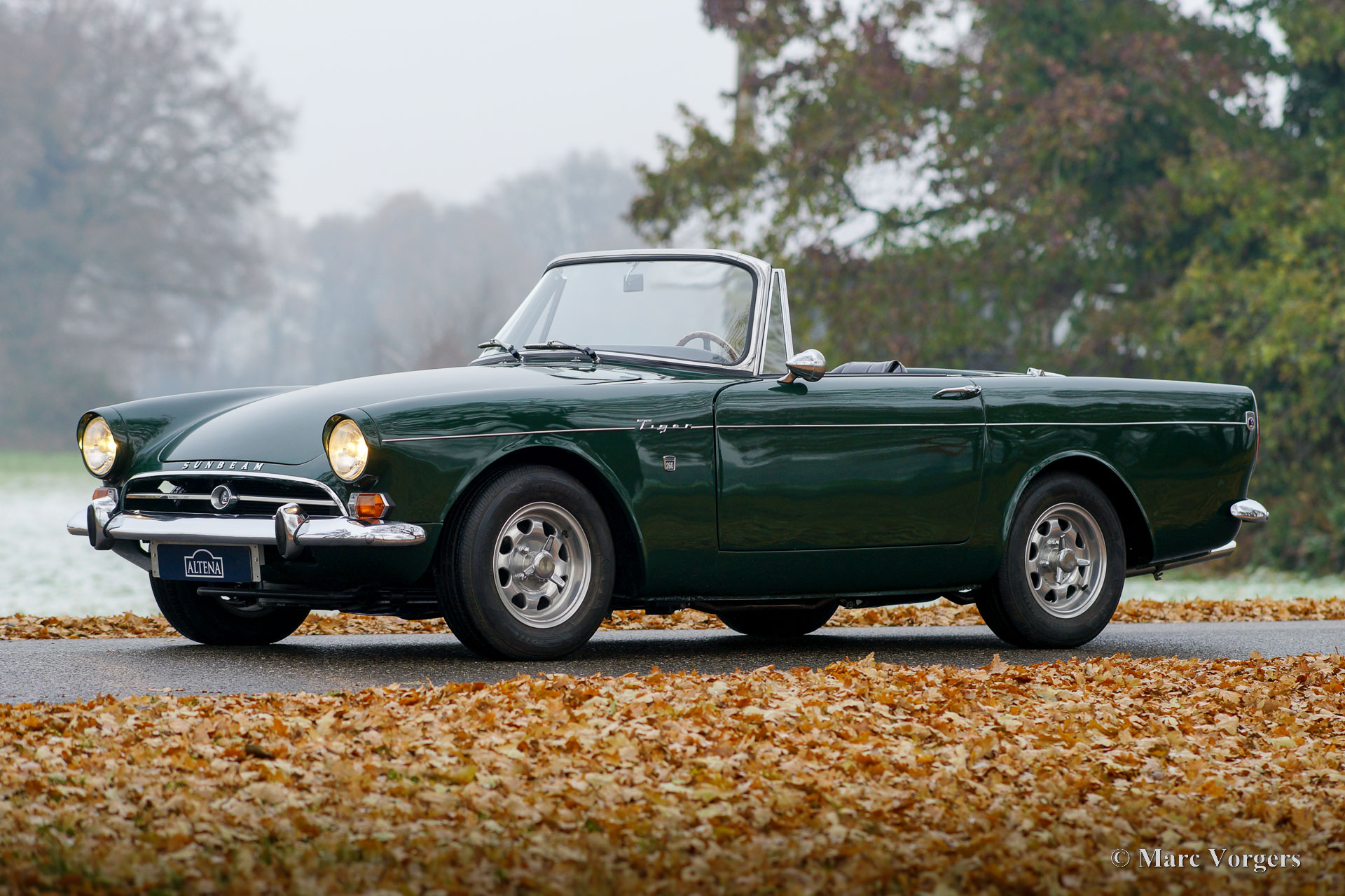 Sunbeam Tiger MK I, year 1965. Colour British Racing Green combined with a black leatherette interior and black carpet. This Sunbeam Tiger was sold new in Missouri, USA. The Sunbeam Tiger is based on the four-cylinder Sunbeam Alpine roadster. In 1962, F1 driver Jack Brabham suggested a V8 engine must be tried. The development was partly done by Carroll Shelby who carried out a similar conversion on the AC ACE resulting in the legendary AC Cobra. The Sunbeam Tiger is a less hard core and a much more practical classic car with a proper hood which is stowed away beautifully, and a proper boot. Only 7083 examples of the Sunbeam Tiger were built.