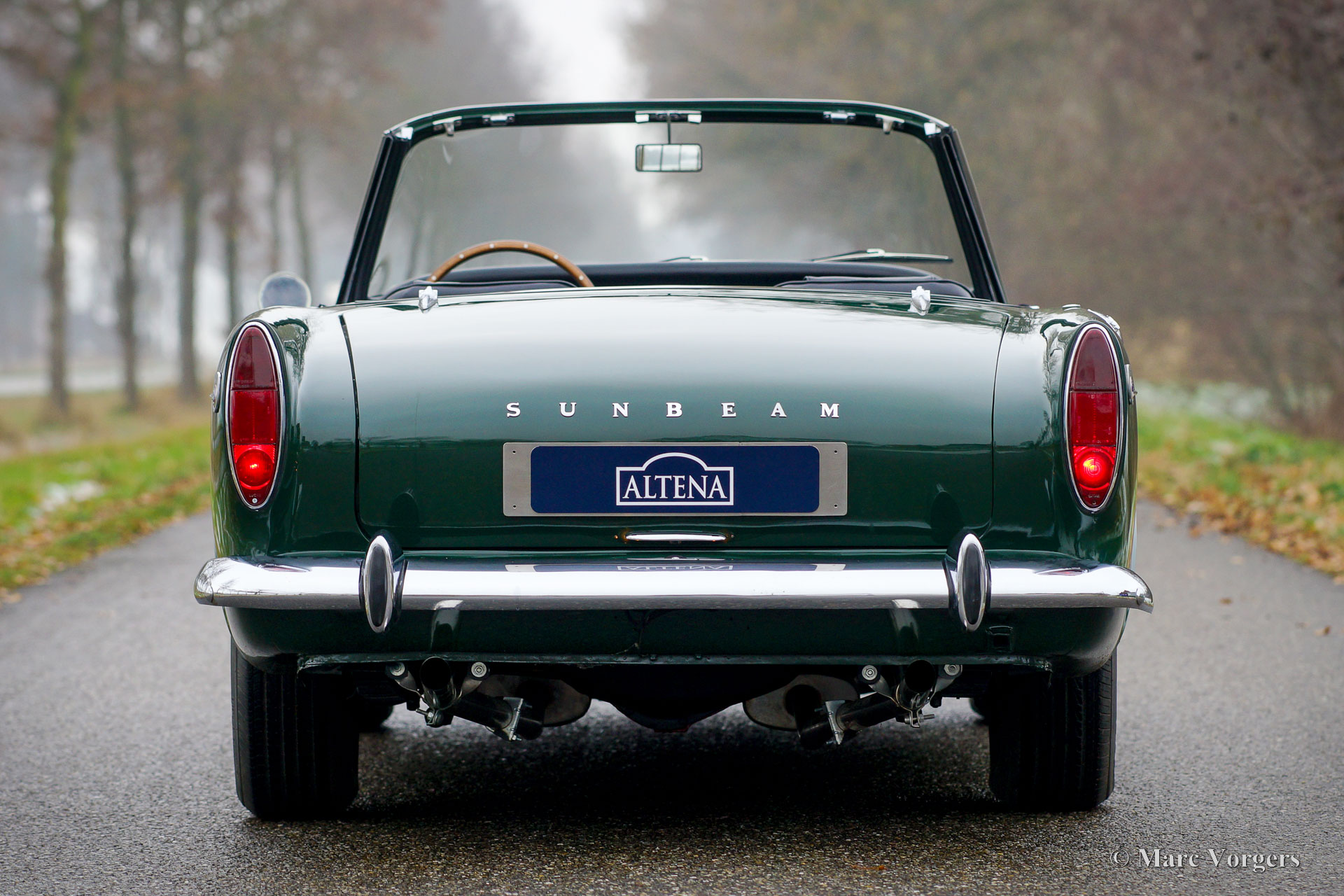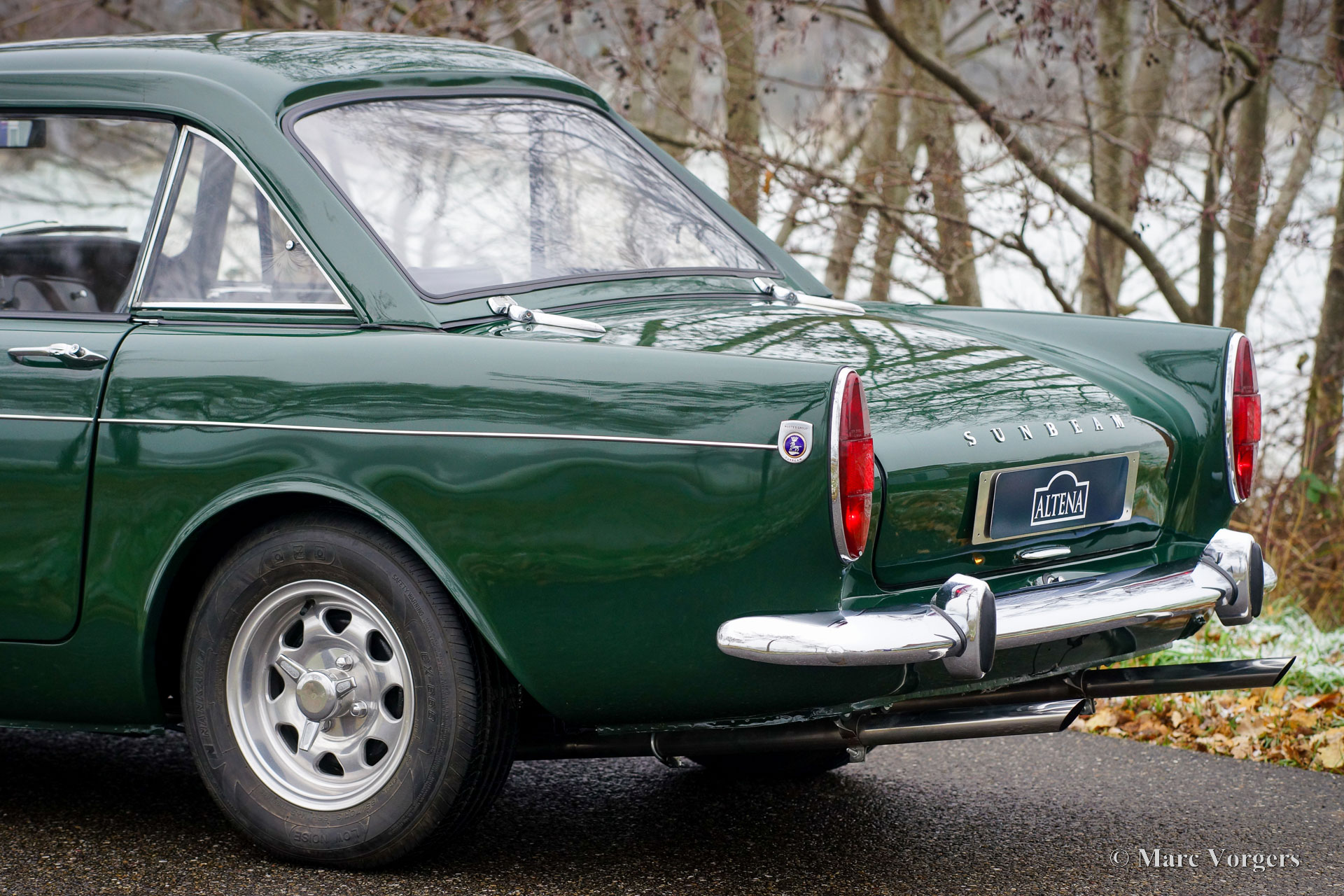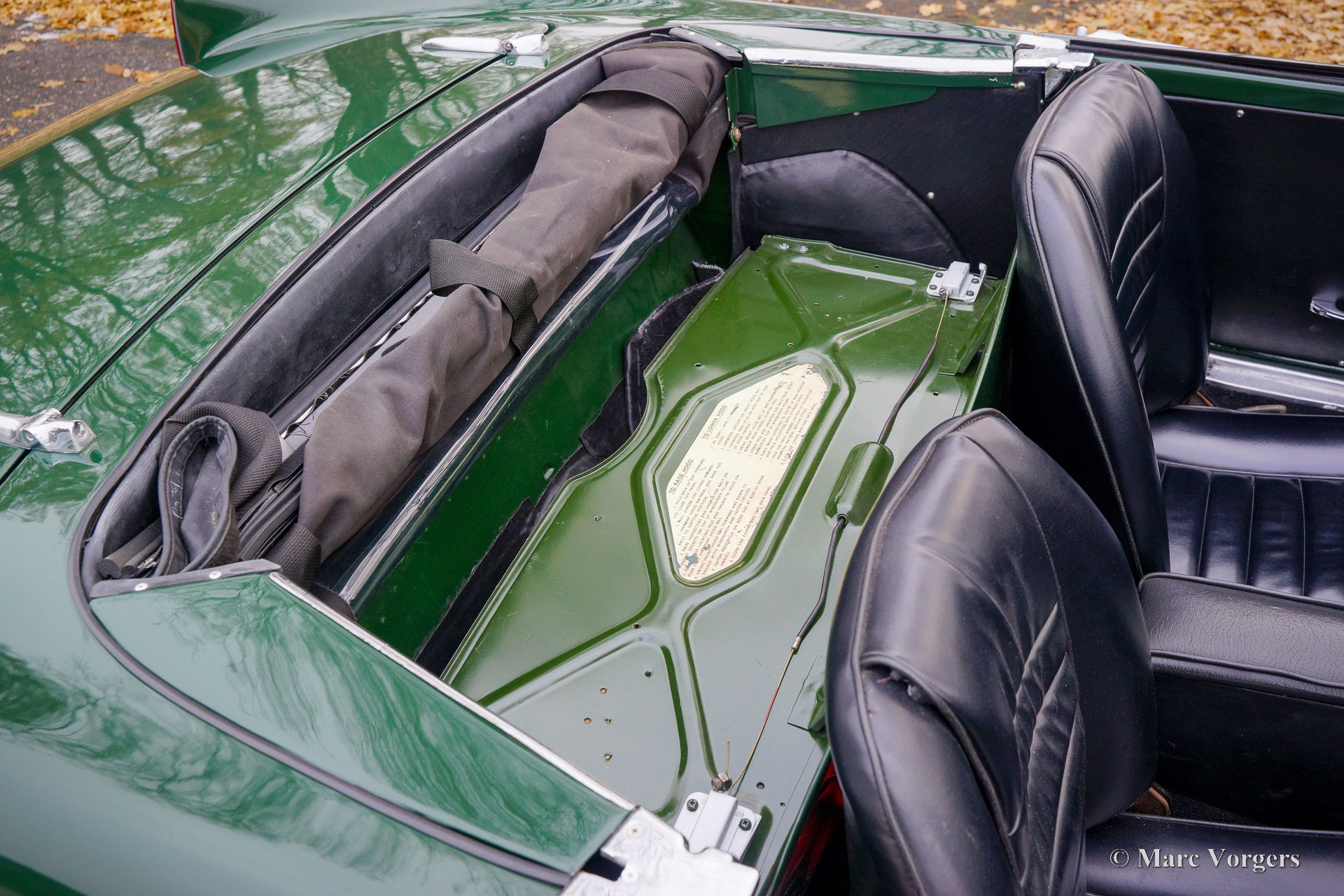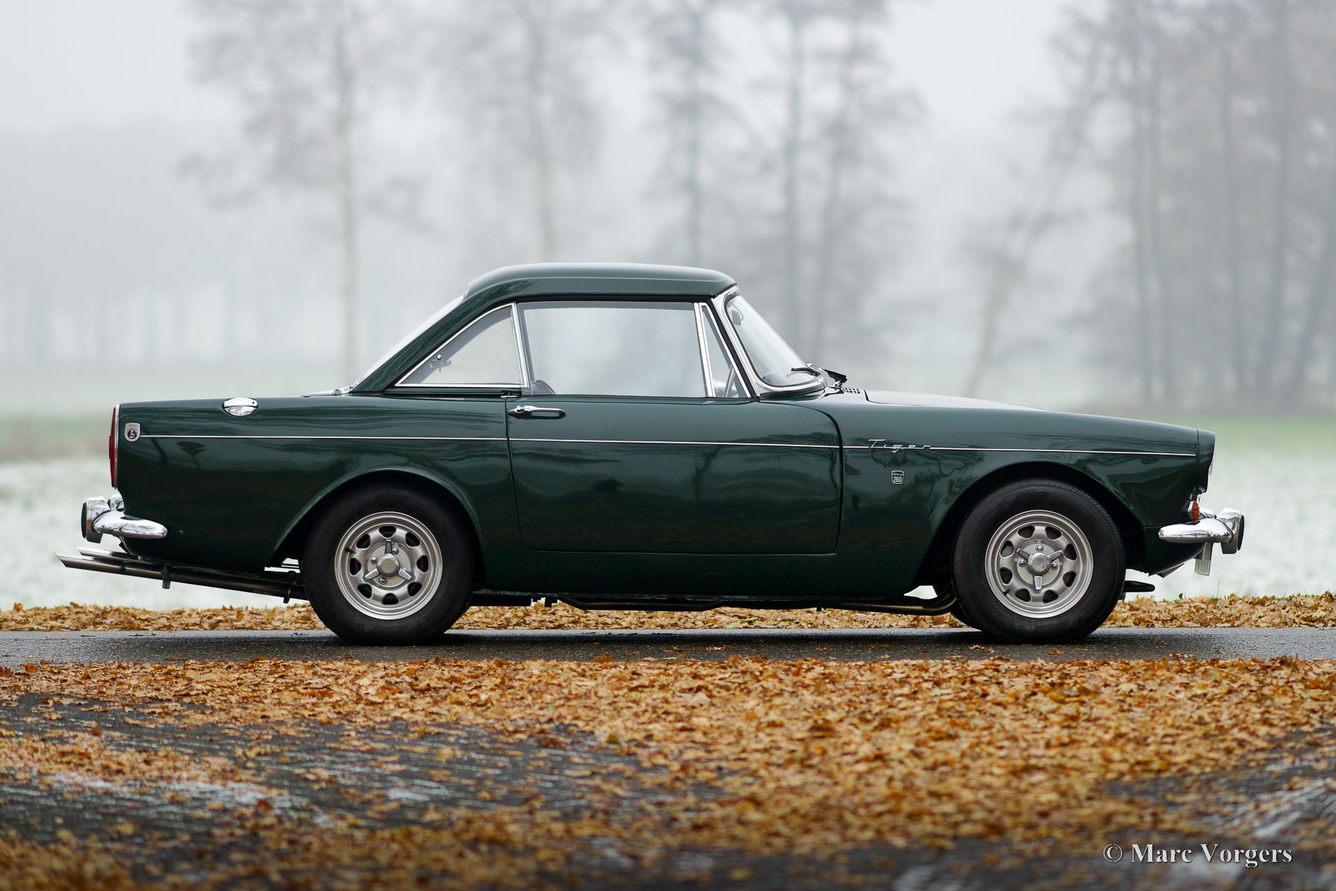 Sunbeam Tiger MK I, year 1965. Colour British Racing Green combined with a black leatherette interior and black carpet. This Sunbeam Tiger was sold new in Missouri, USA. The Sunbeam Tiger is based on the four-cylinder Sunbeam Alpine roadster. In 1962, F1 driver Jack Brabham suggested a V8 engine must be tried. The development was partly done by Carroll Shelby who carried out a similar conversion on the AC ACE resulting in the legendary AC Cobra. The Sunbeam Tiger is a less hard core and a much more practical classic car with a proper hood which is stowed away beautifully, and a proper boot. Only 7083 examples of the Sunbeam Tiger were built.