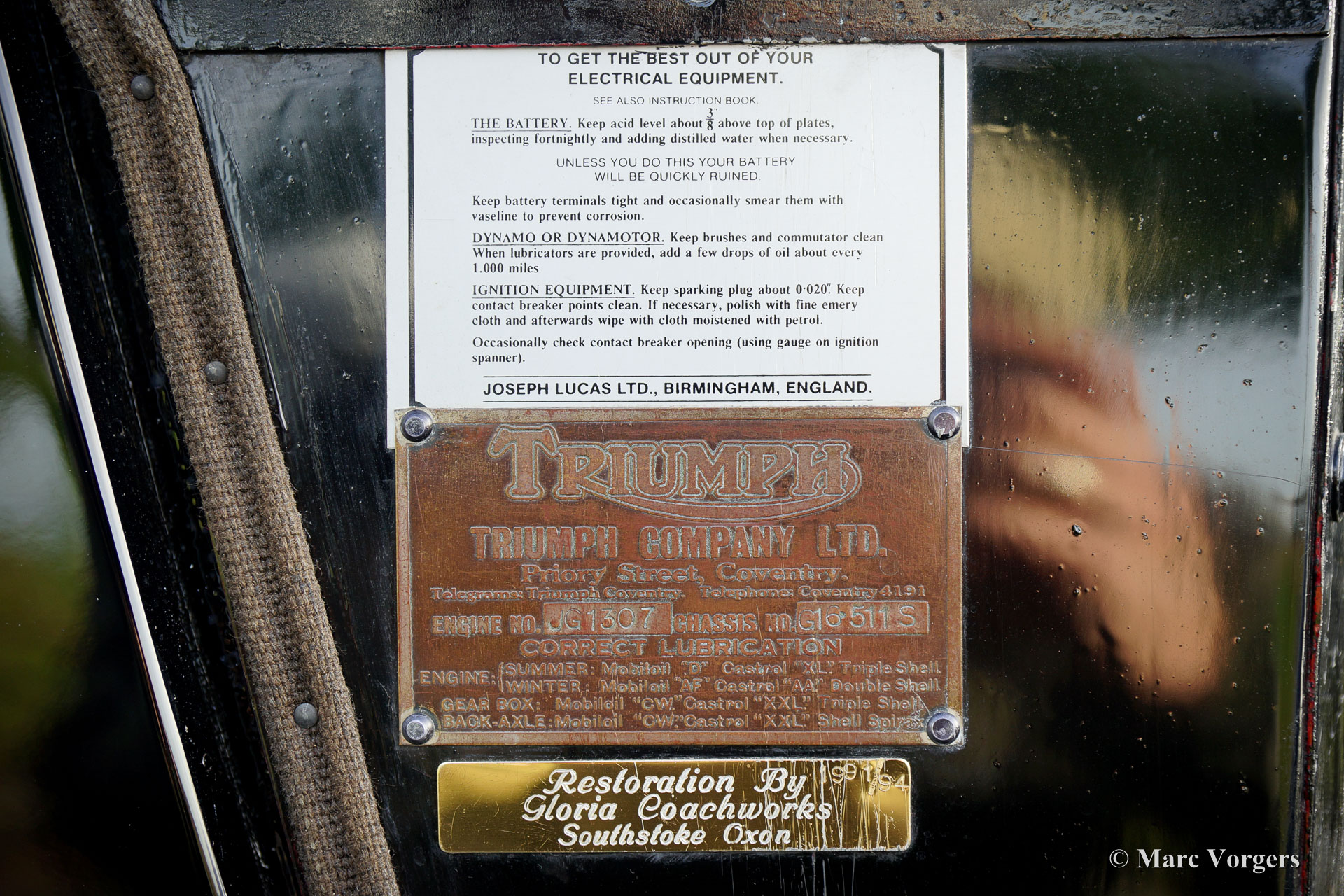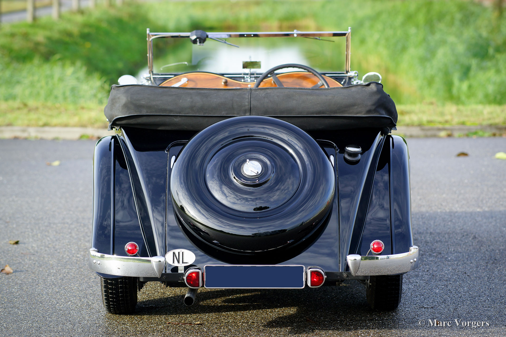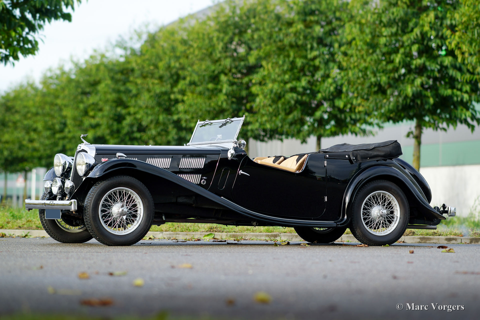 Triumph Gloria SIX Vitesse tourer, year 1935. Colour black with a beige leather interior and beige carpet. Black canvas hood and side screens. This rare and very beautiful Triumph Gloria SIX Vitesse tourer was extensively and body off restored in the years 1990 - 1994 by Gloria Coachworks in England. The automobile was imported to the Netherlands in the year 2013. Recently the car was largely stripped and the body work was given perfect new paint. Also the engine and the gearbox were overhauled. This magnificent pre-war car is in superb condition! The history is known and documented from 1948, however, there is a 1935 tax-disc in the files. Today only five cars of this type are still known with the Pre-1940 Triumph Motor Club England (Gloria SIX tourer fitted with the 2-Litre Coventry Climax six-cylinder engine). This Triumph is an impressive car with many beautiful and original details, and the six-cylinder engine sounds magnificent!