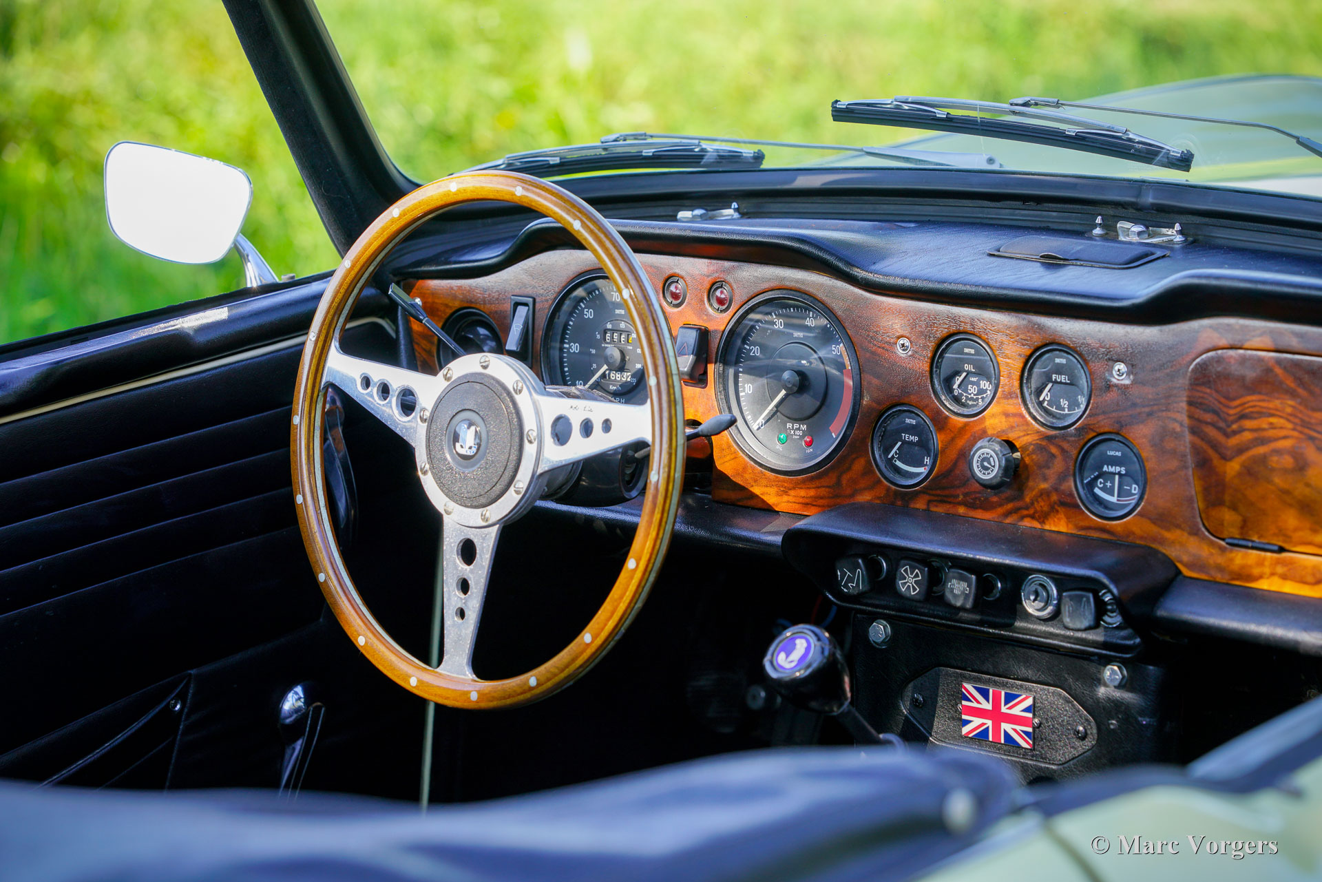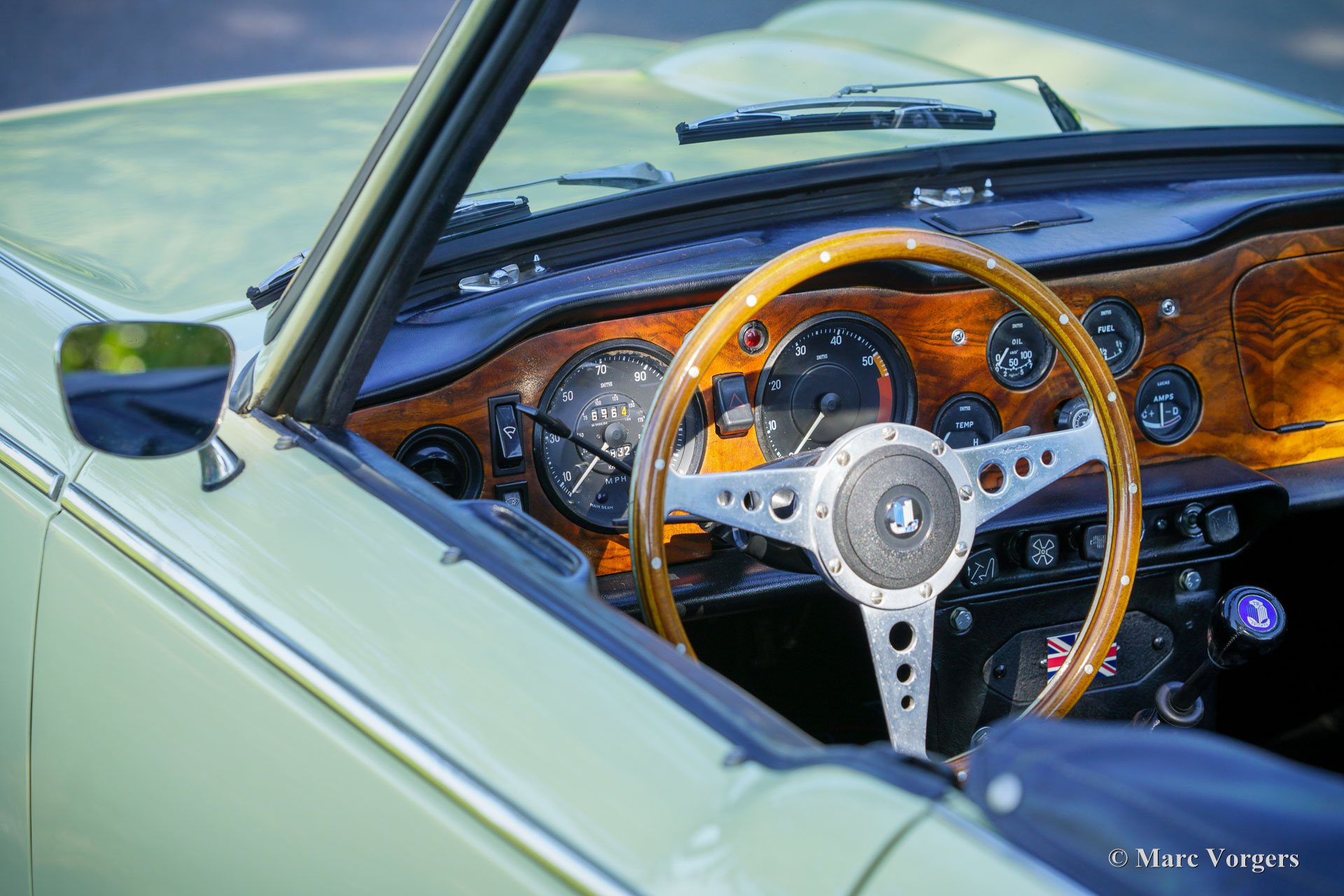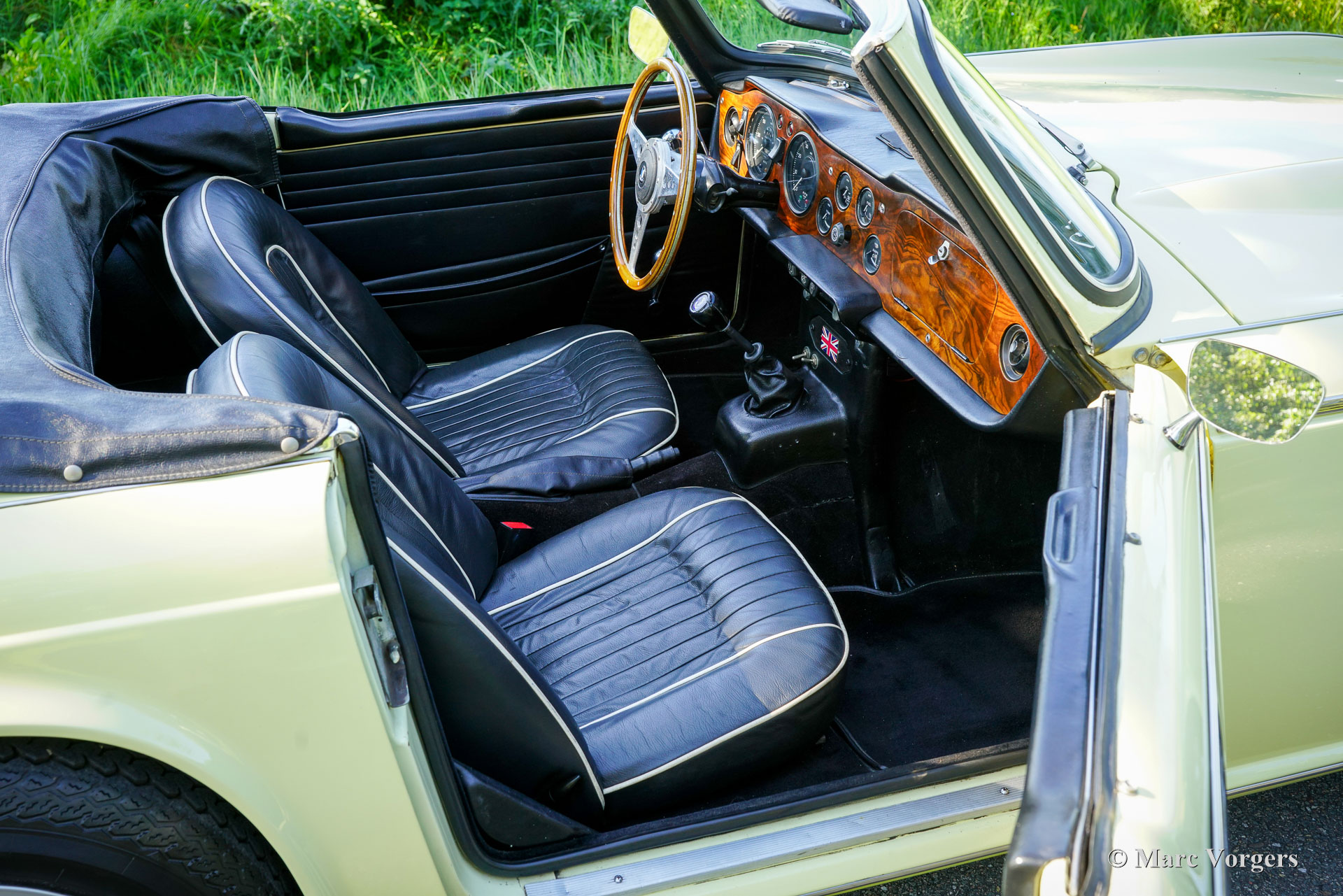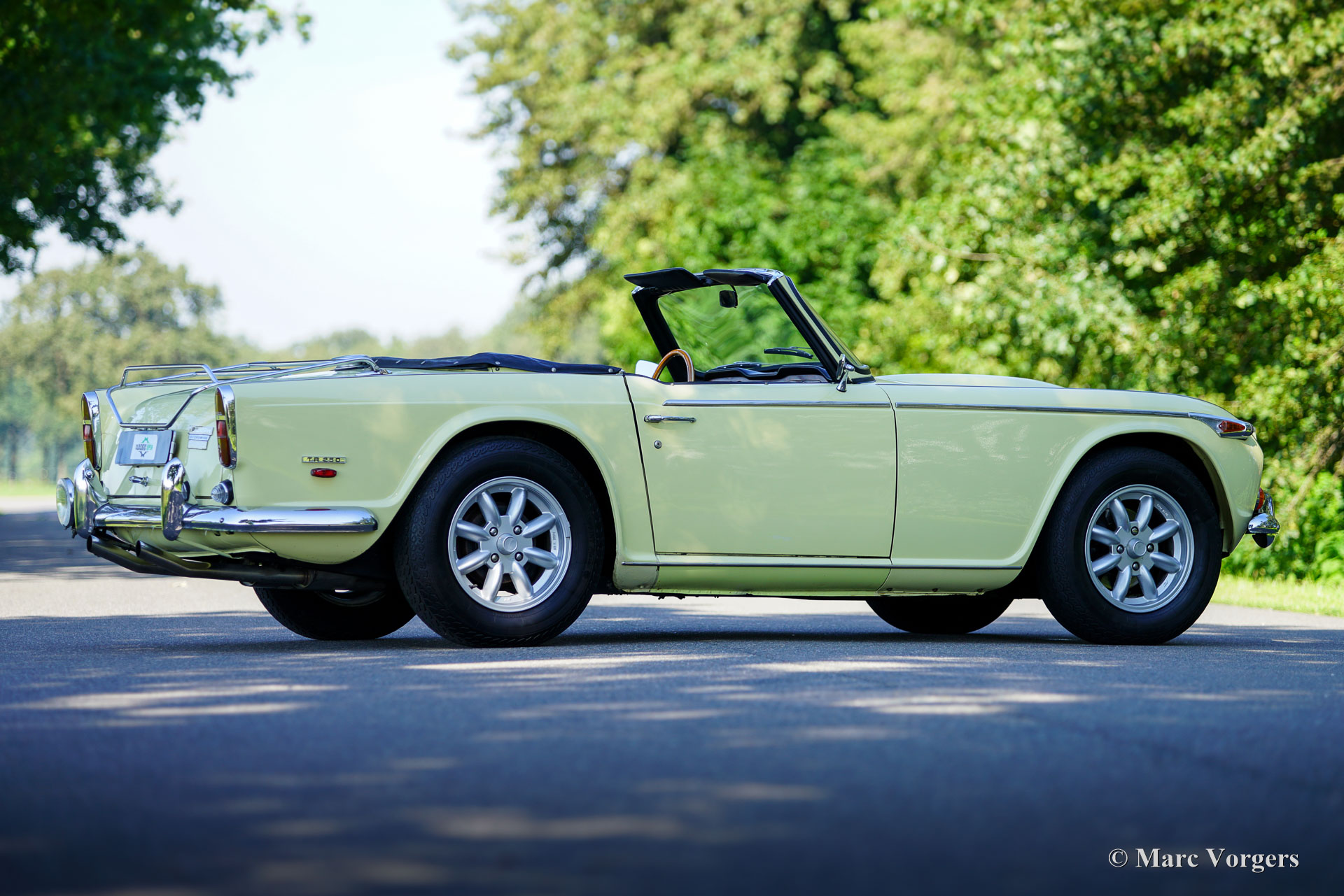 Triumph TR 250, year 1968. Colour Jasmine yellow combined with a black leather interior trimmed with white piping and black carpet. Black cloth soft-top and vinyl hood cover. The Triumph TR 250 is the American sister model of the European Triumph TR 5. The TR 250 was fitted with carburettors, the TR 5 featured Lucas mechanical petrol injection. The TR 250 is a rare Triumph, only 8484 examples were built in 1967 and 1968. This Triumph TR 250 is in a very good condition and the car drives and sounds delightfully! The wonderful 2,5 Litre cast iron straight six engine is ‘fast road’ tuned and is fitted with S.U. carburettors. Furthermore, the car is fitted with overdrive, CV joints in the rear half axles, Minilite style wheels, 123 electronic ignition, a Stainless Steel petrol tank, a stainless steel sports exhaust, and an electric (Facet) petrol pump. The stylish lines were drawn by the Italian master designer Michelotti. The interior breathes the ‘snug’ atmosphere of the classic British roadster with low seats close together, a wood dashboard with an array of gauges, and the steering wheel and shift-stick perfectly placed for a sporty yet comfortable driving experience. This wonderful Triumph TR 250 was imported from Oregon (USA) in 1994, the car has known only one enthusiast owner ever since. A superb driver car!