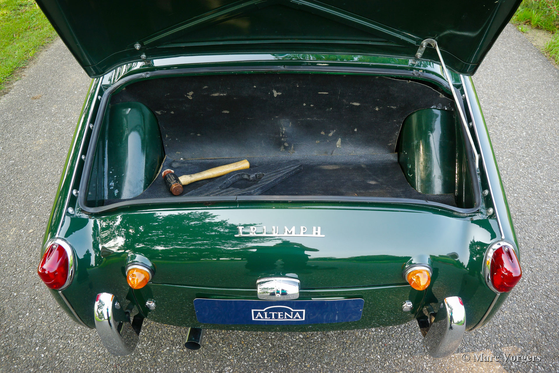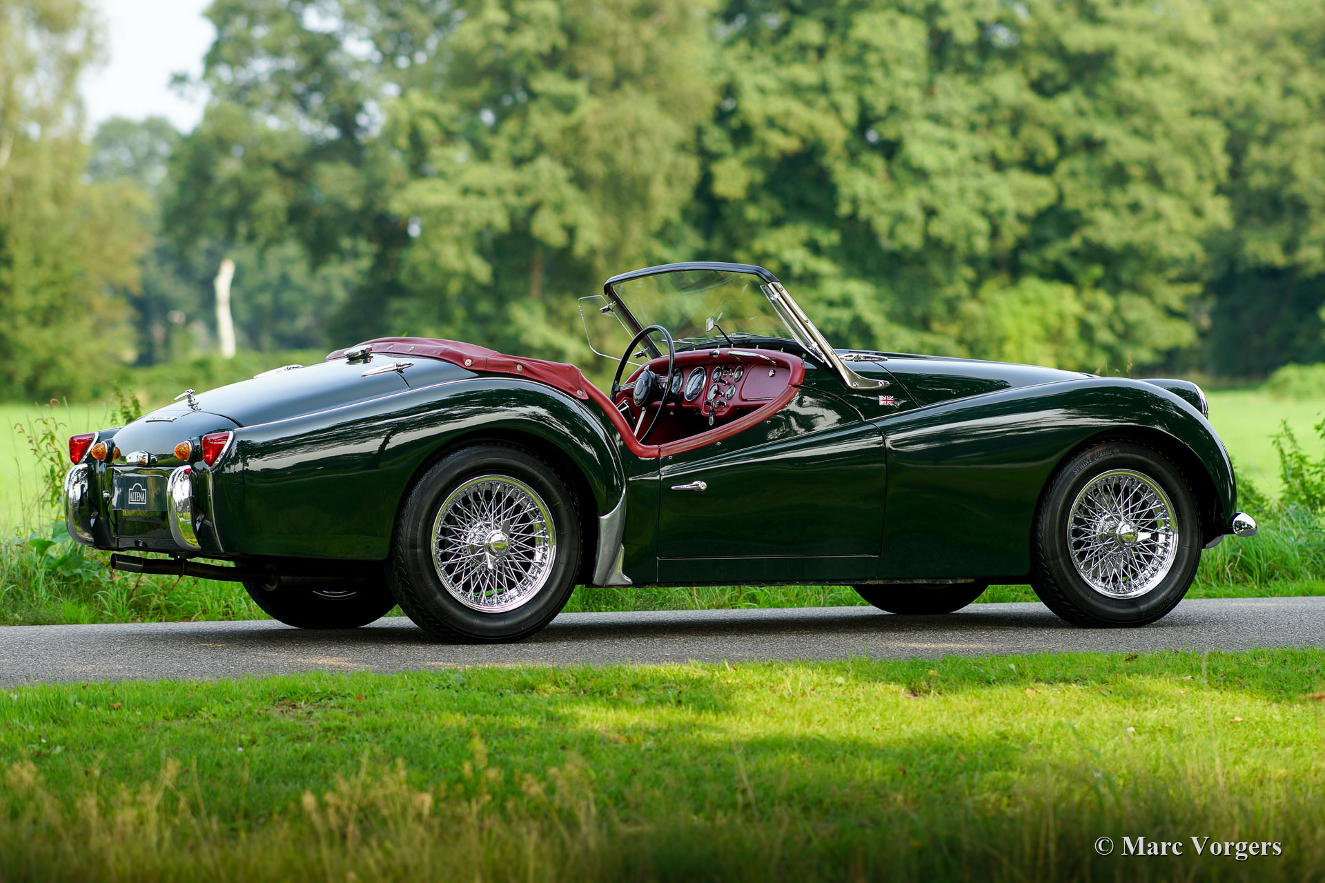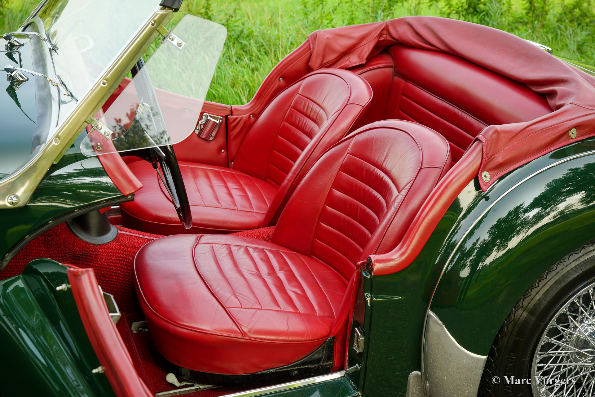 Triumph TR 3A, year 1958. Colour dark British racing green combined with a red leather interior, red carpet and a red leather hood cover. Red mohair soft top and red mohair side screens. This wonderful Triumph TR 3A was sold new in the United States. In the year 1996 the car was imported in the Netherlands. In the late 1990s the automobile was extensively restored. Everything was restored, overhauled and / or renewed. The engine, gearbox, suspension, axles and dashboard gauges were overhauled. A new wiring loom was fitted, brightwork re-chromed etcetera. A photo report of the restoration is present. Now, 20 years later, the car is still in excellent condition with only slight traces of use. This fine Triumph TR 3A shows all the original details and the car drives perfectly! The car is fitted with chrome wire wheels shod with Vredestein Sprint Classic 165/15 tyres, a Stainless-Steel exhaust system, and it comes with a removable chrome luggage rack which can be mounted on the boot lid. A very desirable example!