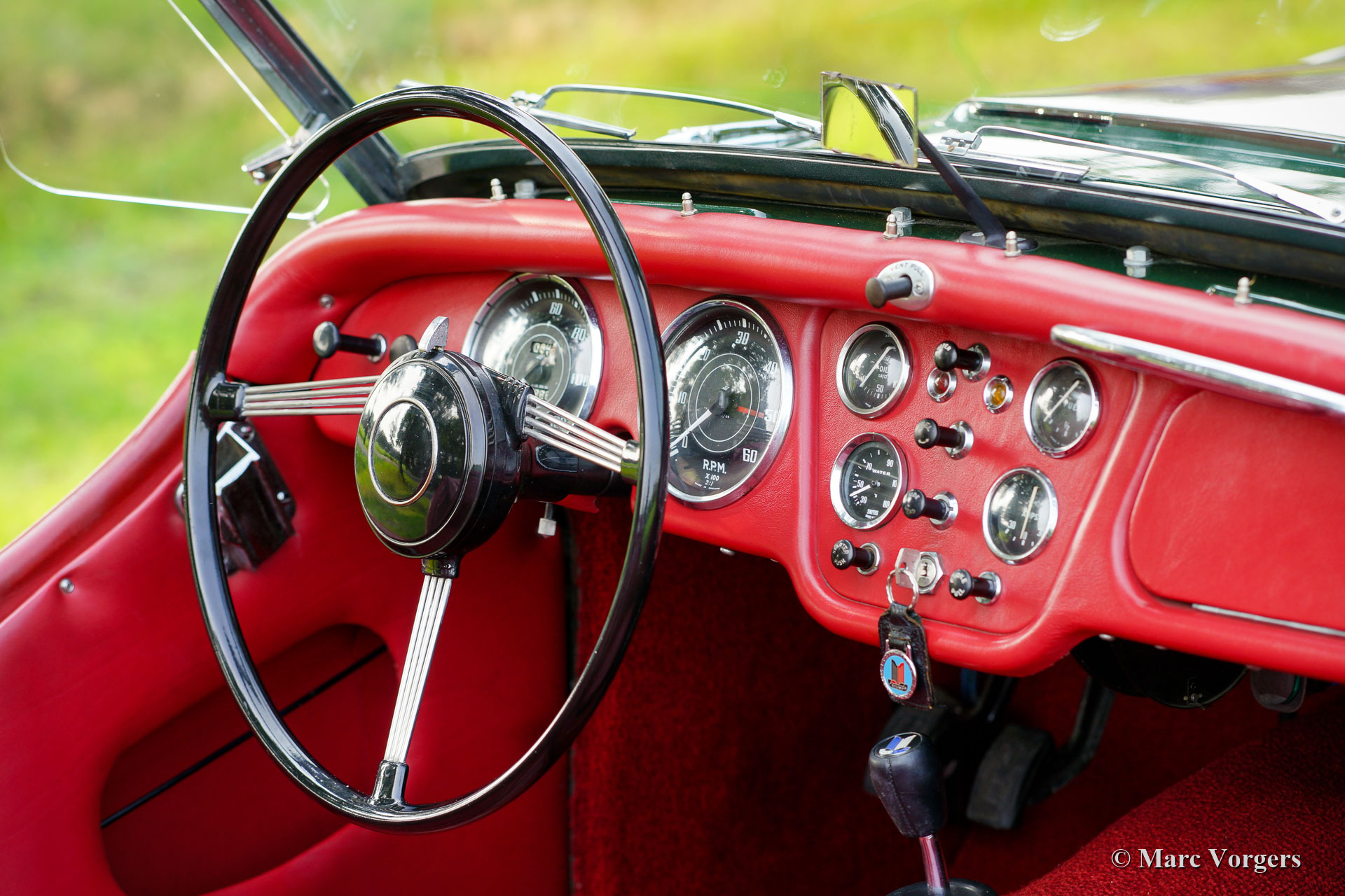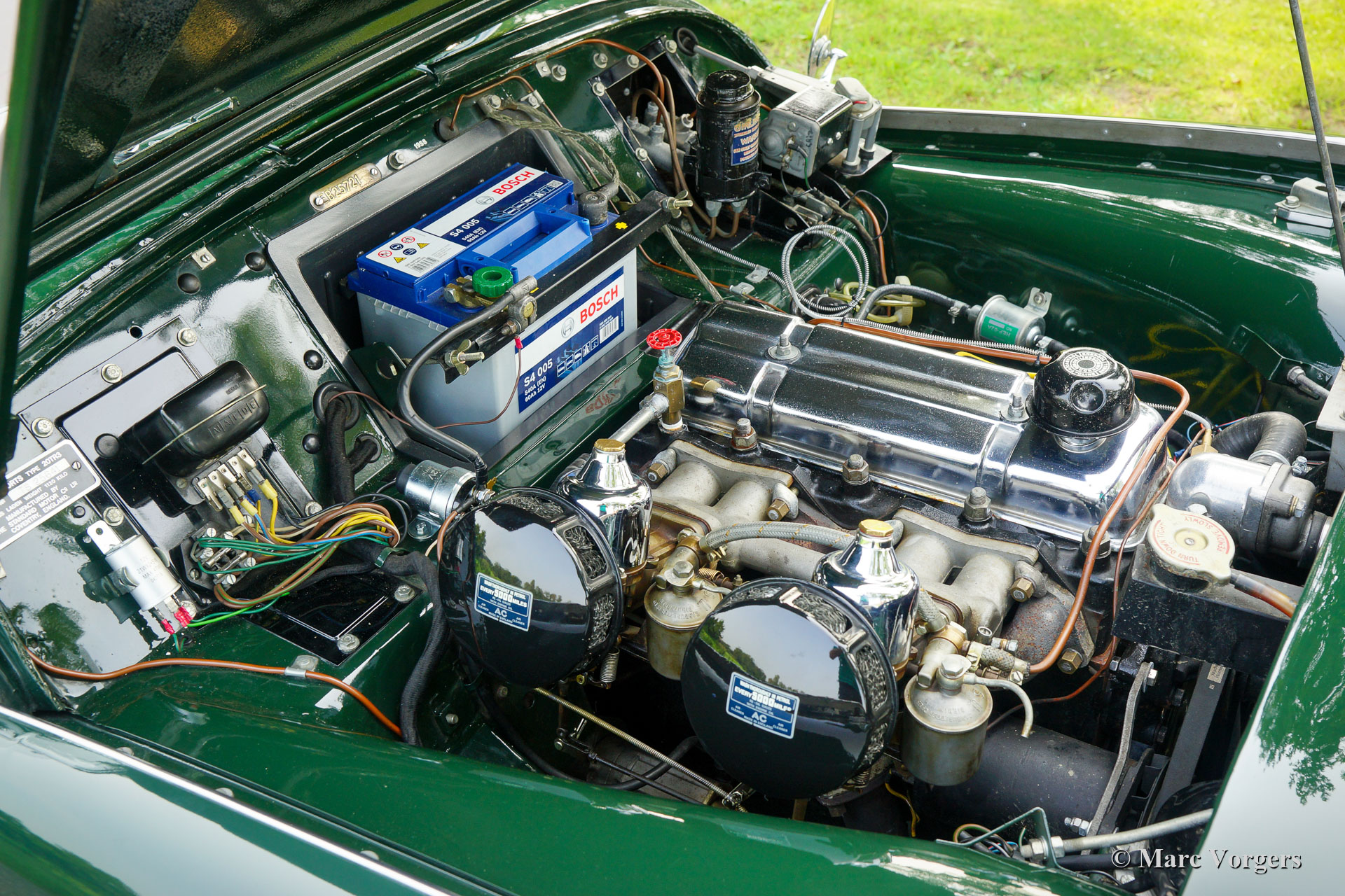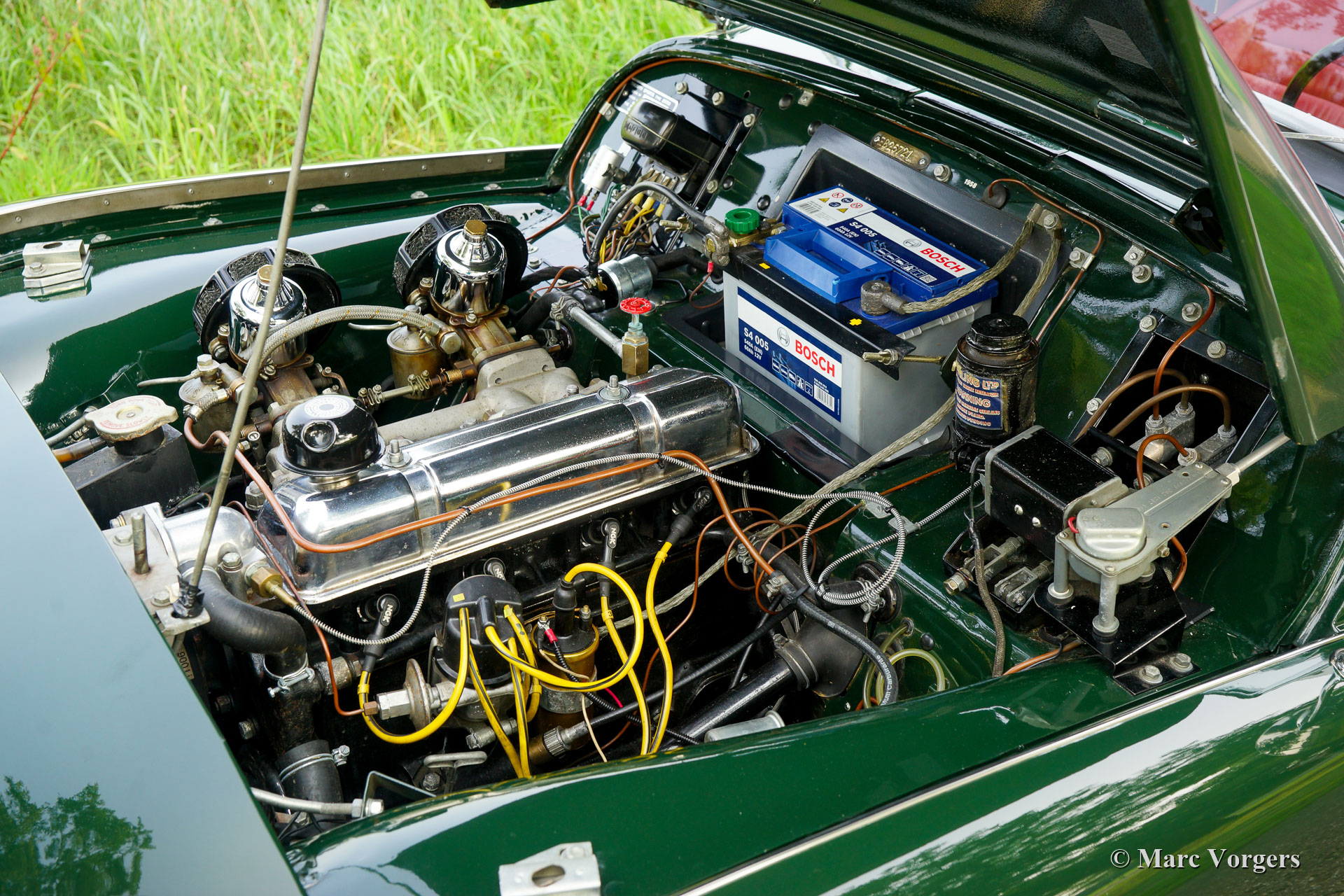 The Triumph TR 3 is a no nonsense sports car; very robust, simple and reliable, a true British sports car all over. The TR 3 was the first production car, off factory, equipped with disc brakes on the front-wheels. The engine was a Standard Vanguard based, cast-iron, long stroke, in-line four cylinder with a displacement of 1991cc. The TR 3 engine was equipped with two carburettors giving a power-output of almost 100 bhp.