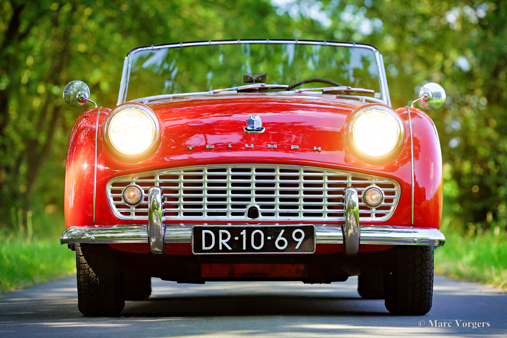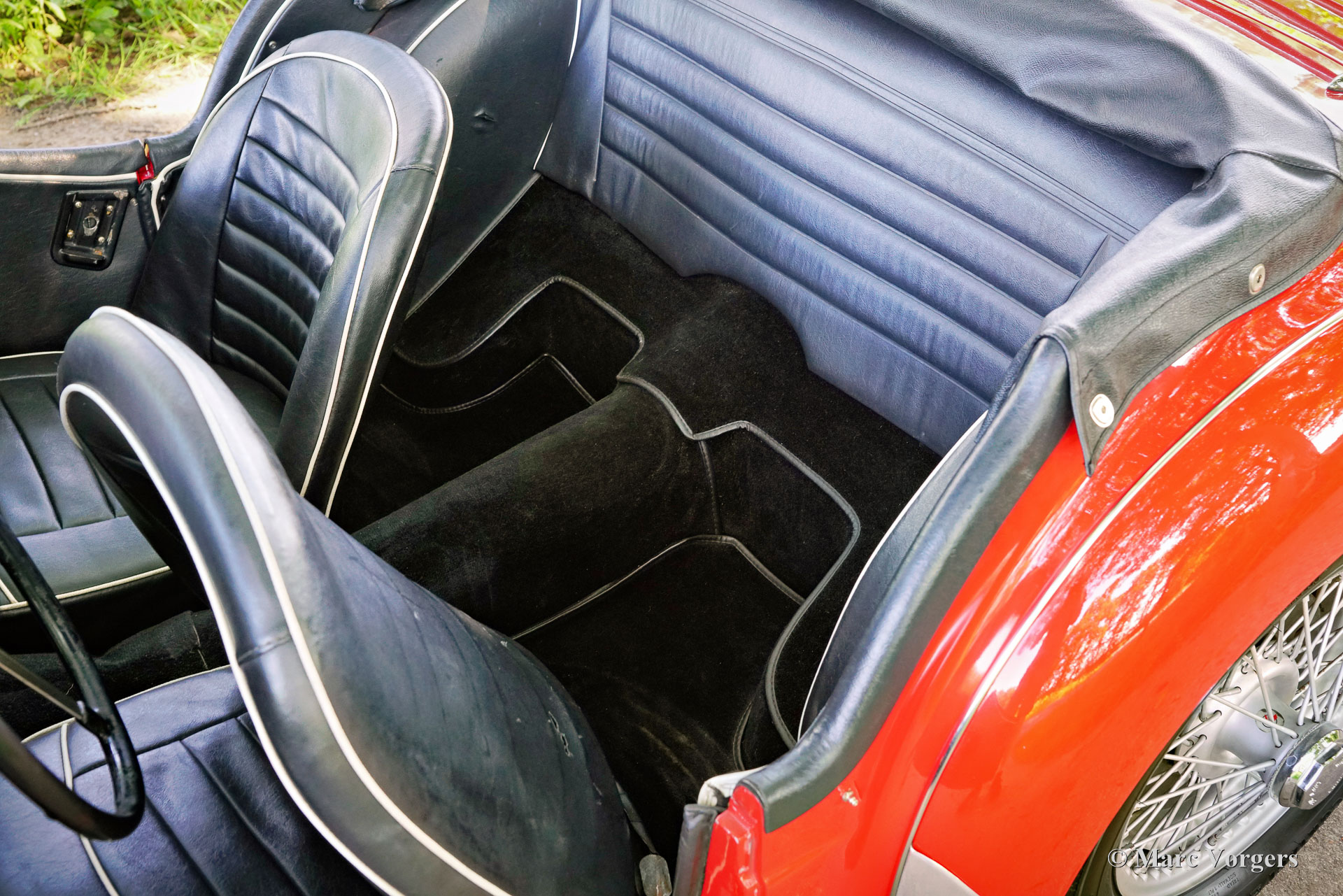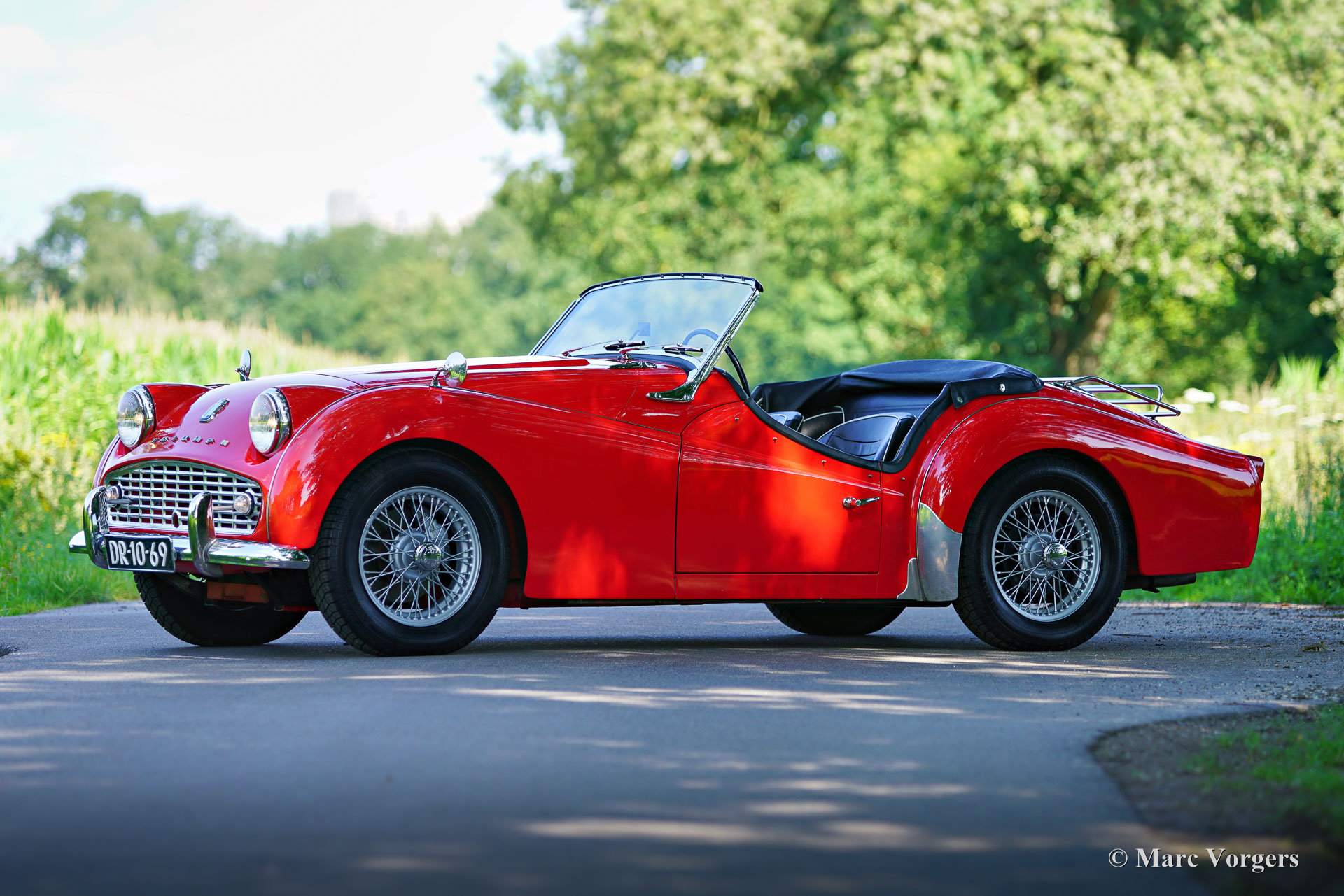Triumph TR 3A, year 1959. Colour red combined with black leathercloth interior trimmed with white piping and black carpet. The car features a black vinyl hood cover, a black vinyl tonneau cover, a black vinyl soft-top, and black side screen frames. This Triumph TR 3A was sold new to the USA. After being found in an American barn the super original TR 3A was shipped to the Netherlands to be extensively restored and overhauled. The bodywork and the chassis were perfectly and “body off” restored. The original green colour was exchanged in favour of red. Everything was overhauled and or renewed, and the car was registered for the road in June 1997. A complete photo report of the restoration is present. Since completion of the restoration the car was well serviced and properly garaged. The car is with the last owner since June 2021. This fine Triumph TR 3A is in a very good and wonderful condition! The rugged 1991 cc four-cylinder engine produces a healthy 100 bhp and (the then novelty) disc brakes on the front wheels supply ample stopping power. This gorgeous Triumph TR 3A shows all the wonderful original details and is fitted with silver painted wire wheels, and two wing mounted rear view mirrors. The car is fitted with a four-speed gearbox, if you wish overdrive can be fitted at additional costs. This Triumph TR 3A offers a superb classic open top driving experience, and it will complete your vintage motoring passion!