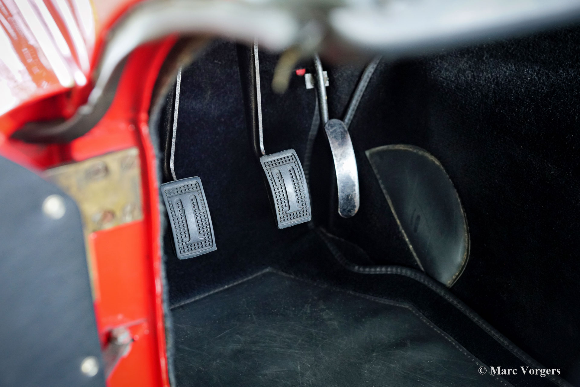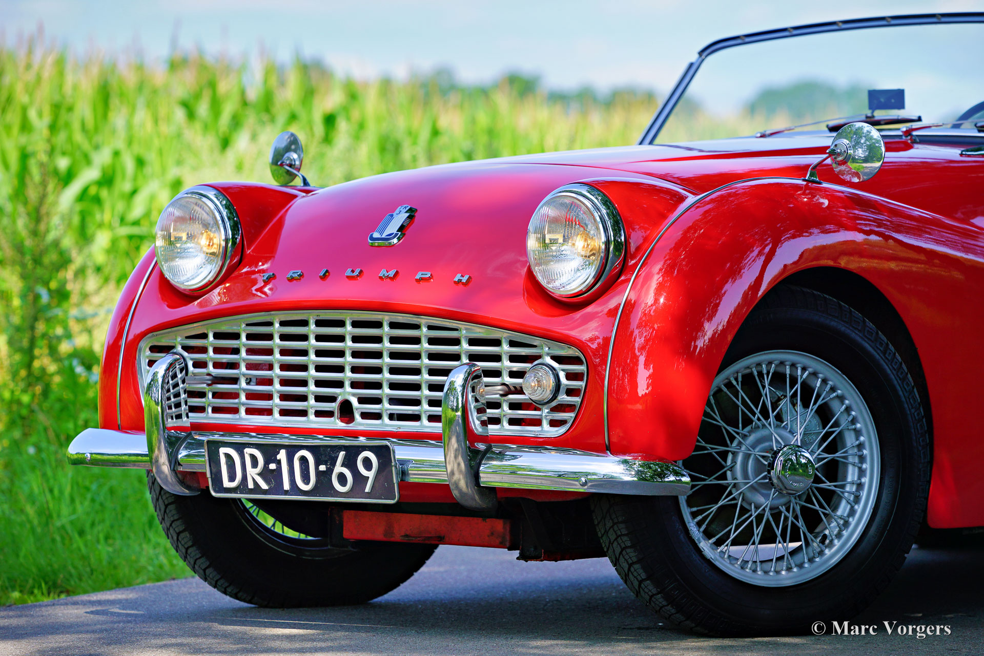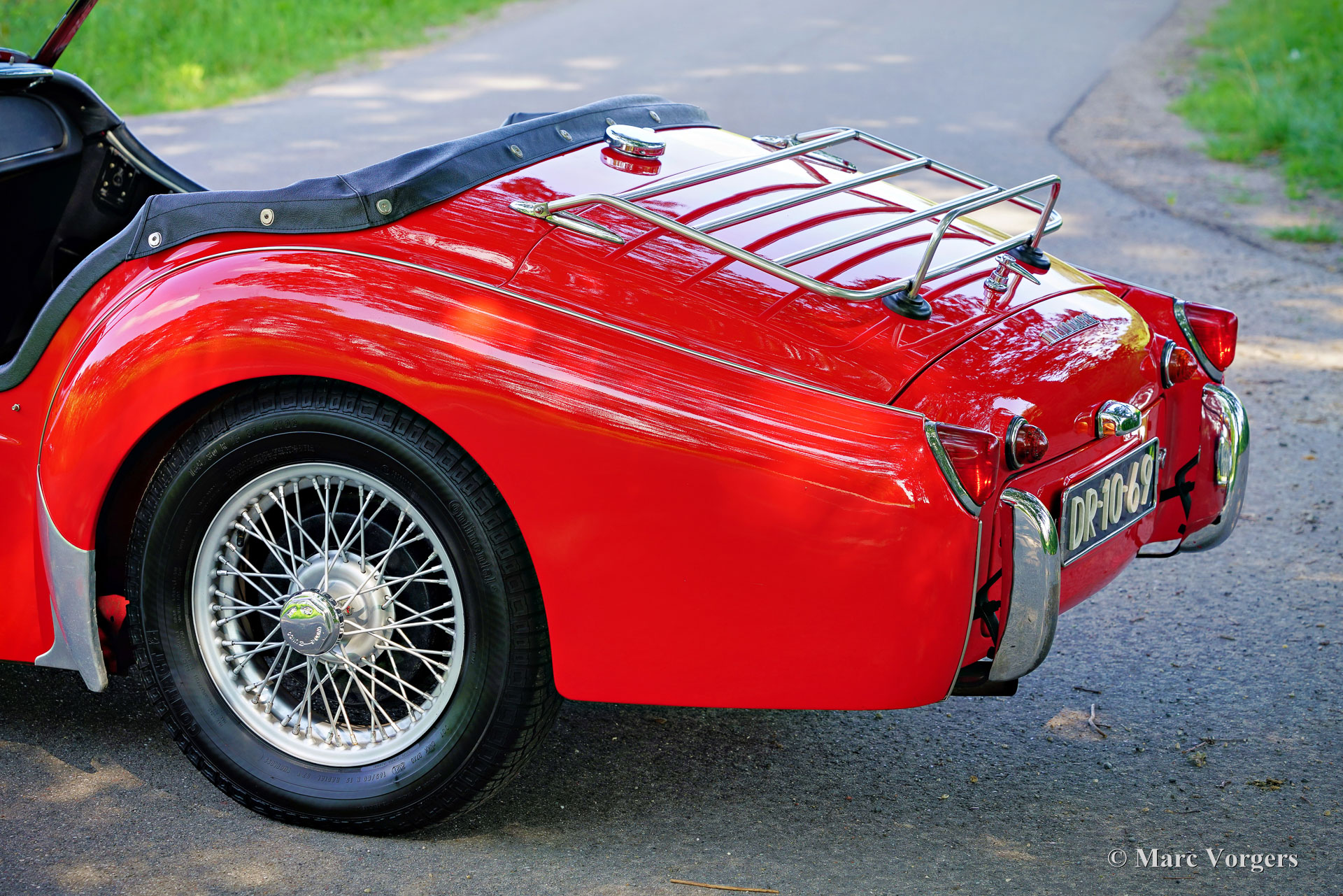 Triumph TR 3A, year 1959. Colour red combined with black leathercloth interior trimmed with white piping and black carpet. The car features a black vinyl hood cover, a black vinyl tonneau cover, a black vinyl soft-top, and black side screen frames. This Triumph TR 3A was sold new to the USA. After being found in an American barn the super original TR 3A was shipped to the Netherlands to be extensively restored and overhauled. The bodywork and the chassis were perfectly and “body off” restored. The original green colour was exchanged in favour of red. Everything was overhauled and or renewed, and the car was registered for the road in June 1997. A complete photo report of the restoration is present. Since completion of the restoration the car was well serviced and properly garaged. The car is with the last owner since June 2021. This fine Triumph TR 3A is in a very good and wonderful condition! The rugged 1991 cc four-cylinder engine produces a healthy 100 bhp and (the then novelty) disc brakes on the front wheels supply ample stopping power. This gorgeous Triumph TR 3A shows all the wonderful original details and is fitted with silver painted wire wheels, and two wing mounted rear view mirrors. The car is fitted with a four-speed gearbox, if you wish overdrive can be fitted at additional costs. This Triumph TR 3A offers a superb classic open top driving experience, and it will complete your vintage motoring passion!
