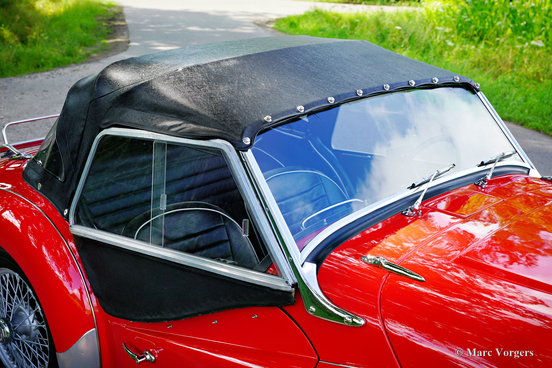 The Triumph TR 3 was uprated twice during the entire production period. In 1957 the car became a wider grille, door handles on the outside and slightly recessed headlamps and was named TR 3a then. In 1960-61 the cylinder capacity was enlarged to 2138 cc. giving a capacity of 104 bhp. and extra torque. Also the fully synchronized TR4 gearbox was incorporated. The car was then named TR 3b. The TR 3 is a pure two-person roadster, a classic generously giving you the fifties British sports car feeling, rough but honest. It comes with a simple soft-top for weather protection. Separate clip-on side screens can additionally be attached to the doors.