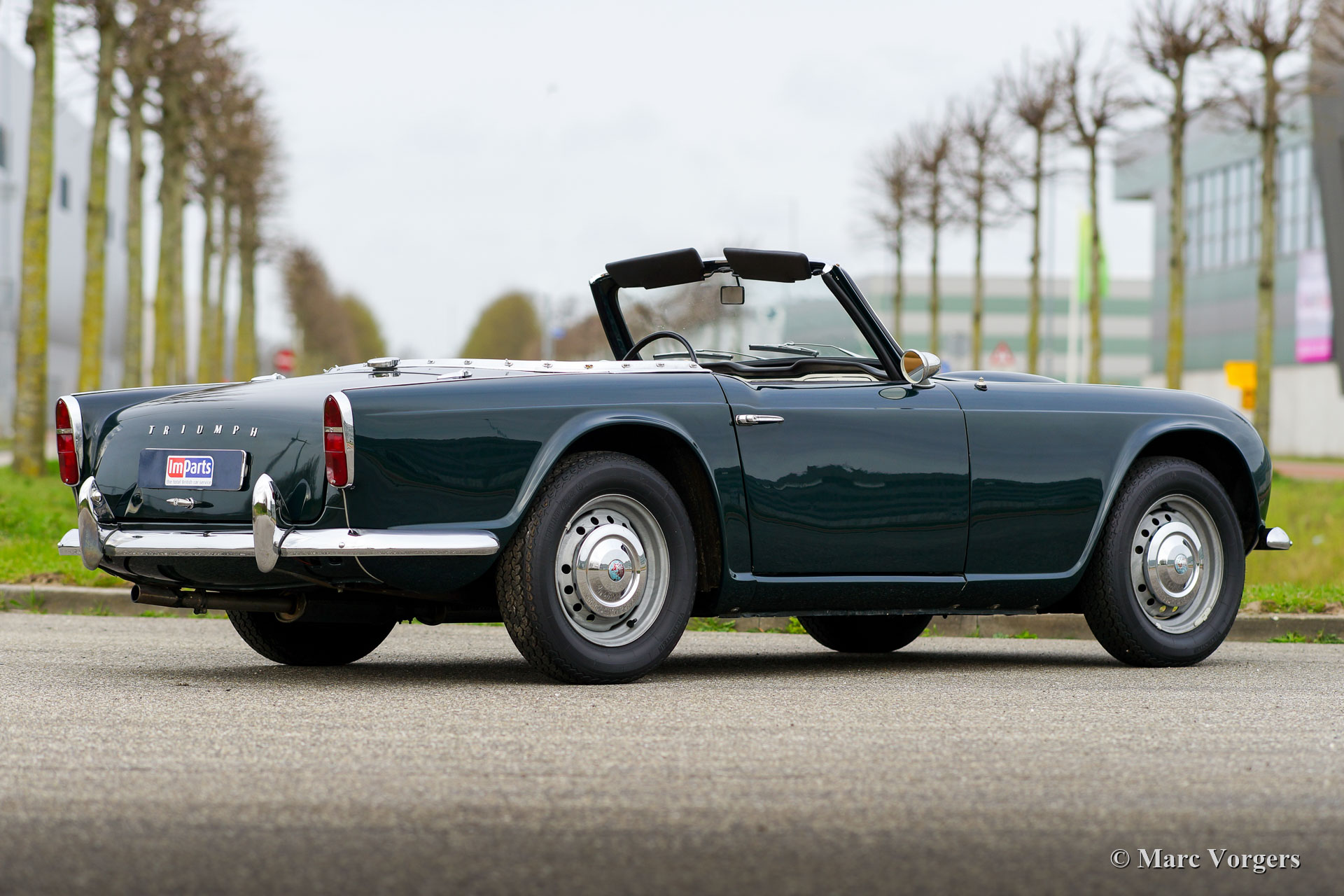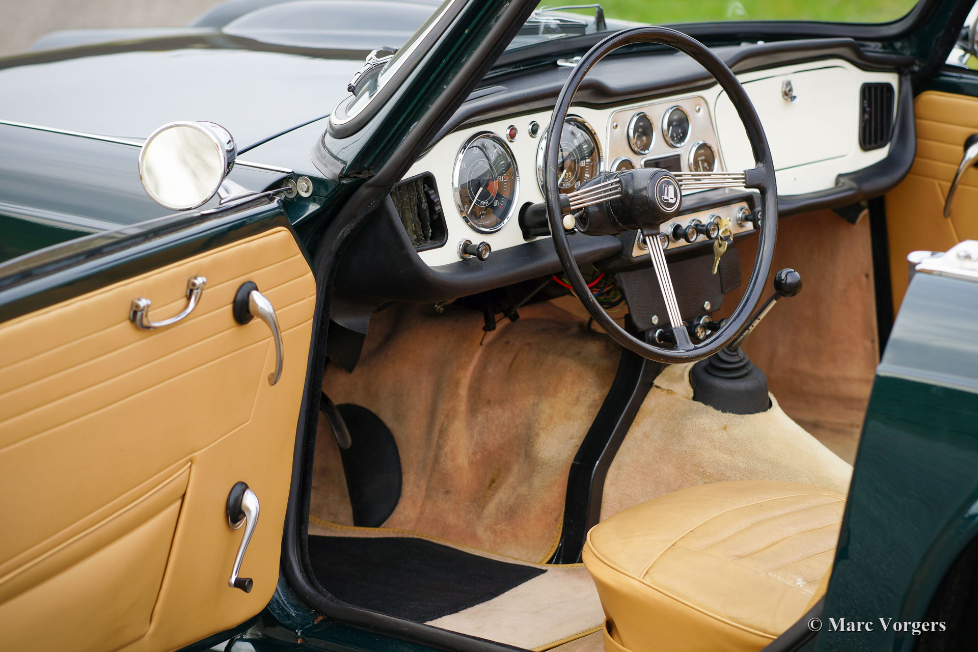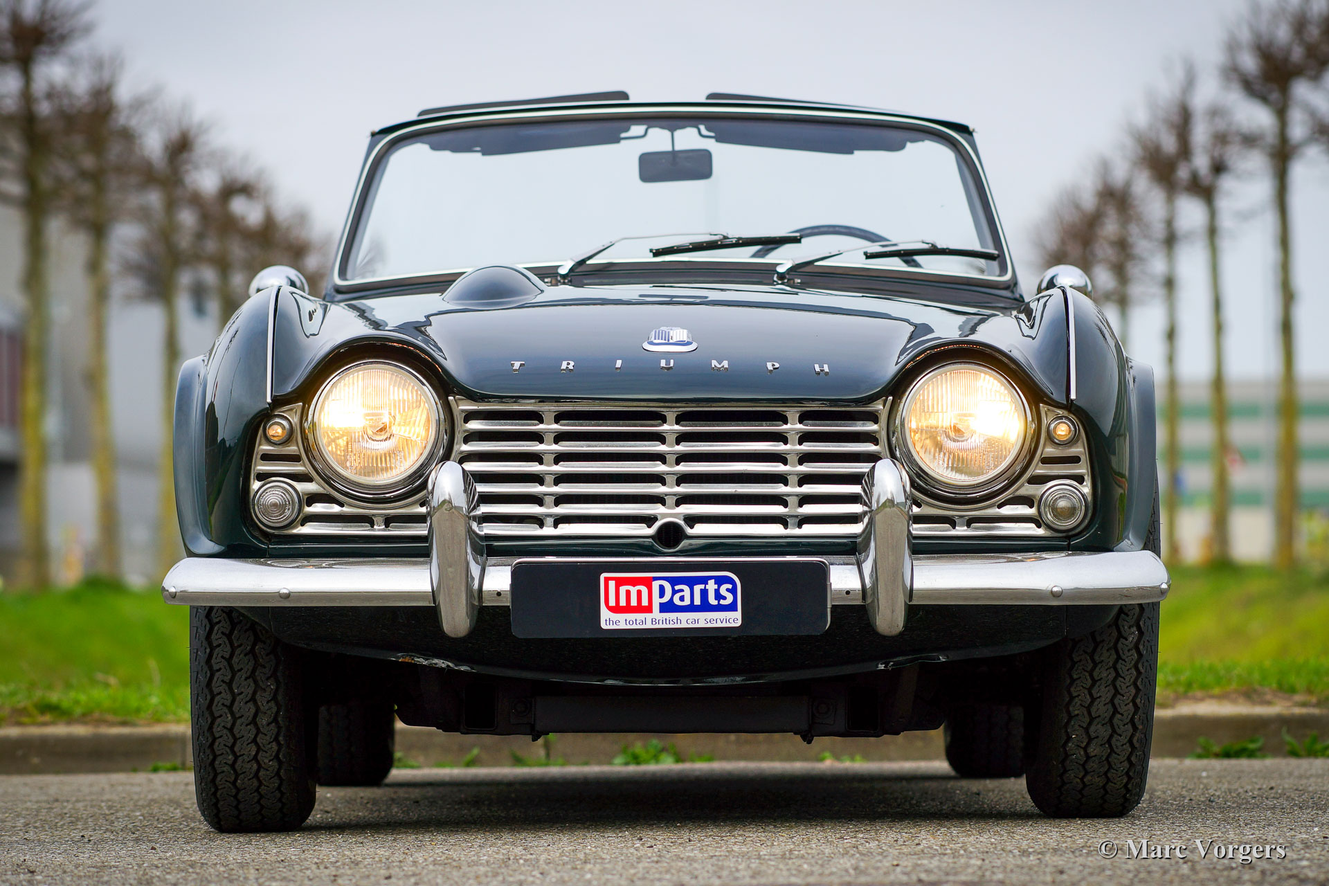 The Triumph TR 4 is a real British roadster; pure and honest. The TR 4 is built with a sturdy separate chassis with independent front suspension and a live rear axle. (IRS versions are equipped with independent rear suspension). The TR4 is equipped with disc brakes at the front and drum brakes at the rear. The bonnet shows a beautiful power bulge which gives space for the two carburettors. The Triumph TR 4 has a very beautiful wooden dashboard that is clear and functional and is equipped with large Smiths clocks. For the TR 4 a very nice "Surrey-top" is available as accessory. The Triumph "Surrey top" inspired Porsche to built the Porsche "Targa" versions. The Triumph TR4 is as all the TR versions a real drivers car.