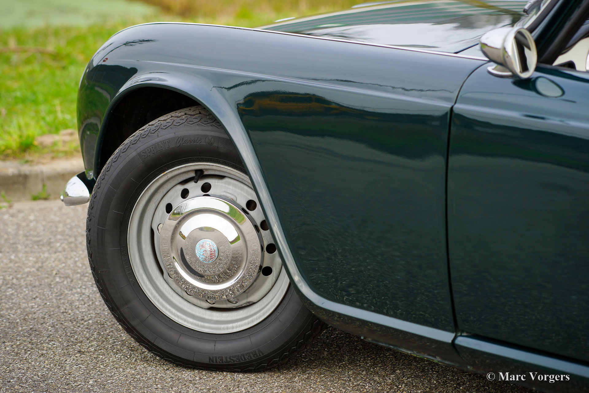 Triumph TR 4, year 1962. Colour dark British Racing Green combined with a light beige leather interior and matching carpet. Black soft-top. This beautiful Triumph TR 4 was extensively and ‘body off’ restored to original specifications in the past. The automobile is good condition, with light traces of use, and the car drives delightfully. This is an early TR 4 which can be identified by the short bulge on the bonnet and the special seat design. The car shows all the original details like the gorgeous white metal dashboard, and the steel disc wheels fitted with chrome hub caps featuring the globe Triumph logo. This beautiful Triumph TR 4 is ready to be enjoyed this spring and summer!
