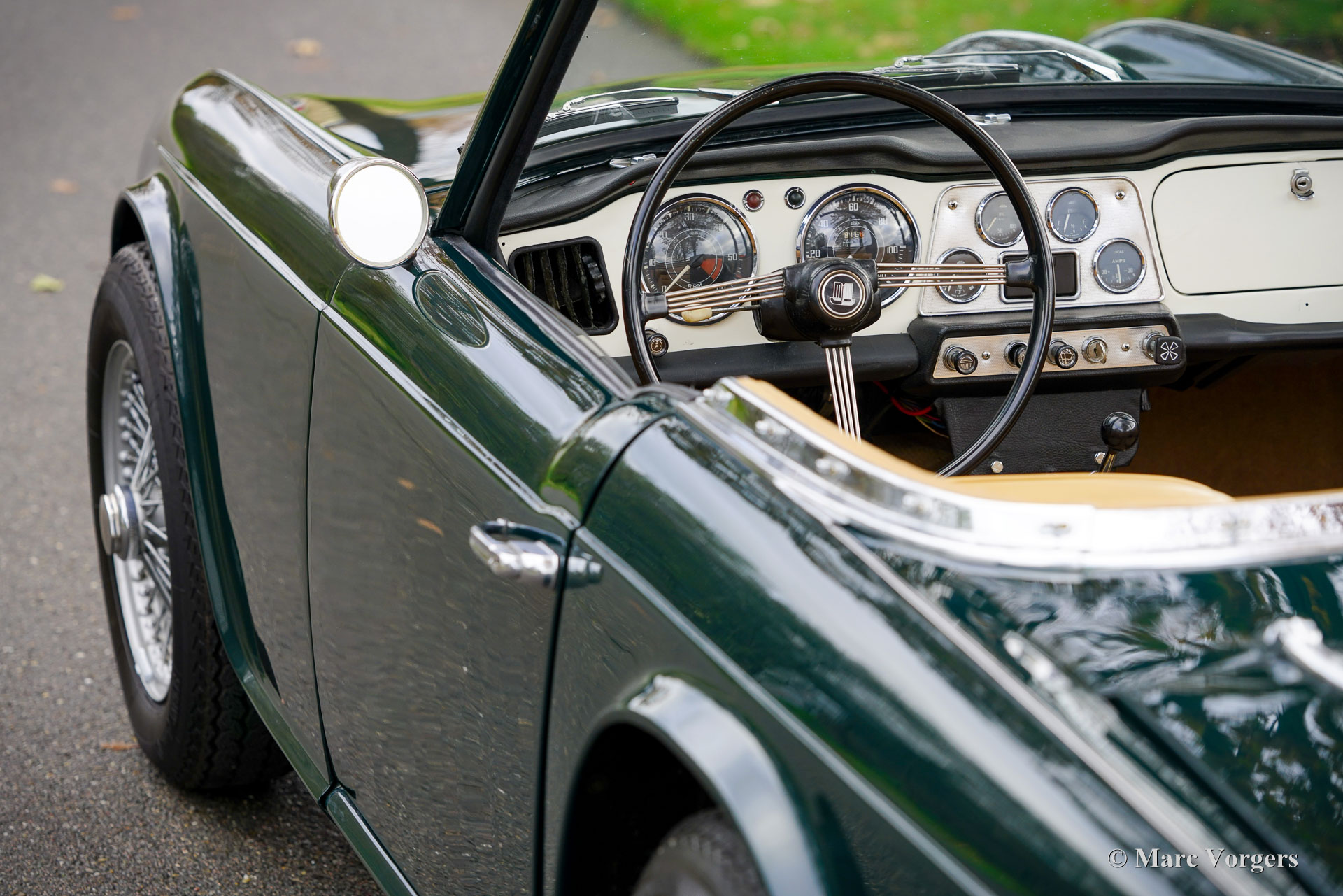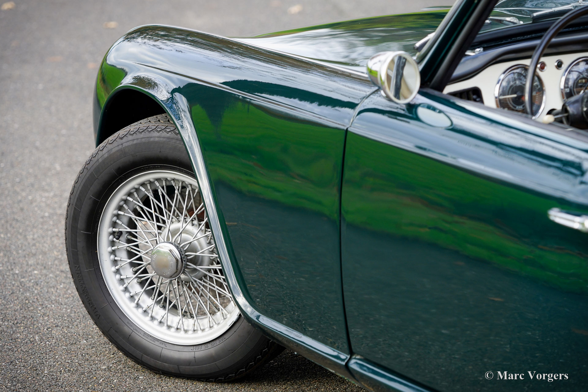 Triumph TR 4, year 1962. Colour dark British Racing Green combined with a pale beige leather interior and matching carpet. Black soft top and silver painted wire wheels. This beautiful Triumph TR 4 has been extensively and 'body off' restored to original specifications in the past. The automobile is in good condition with minor signs of previous use and the car drives and steers delightfully! This is an early TR 4 that can be recognized by the which dashboard, the short ‘bump’ on the hood and the special seat design. The car shows all the original details and is fitted with wire wheels. This TR4 is in a beautiful condition and the car is ready to be enjoyed!