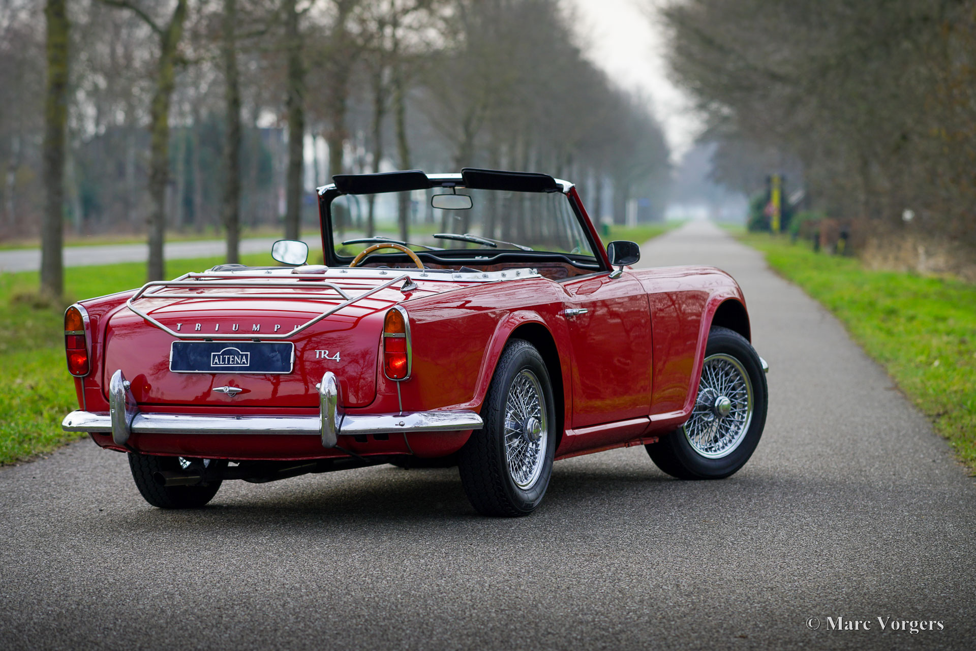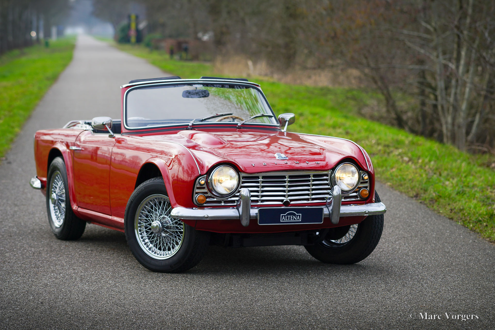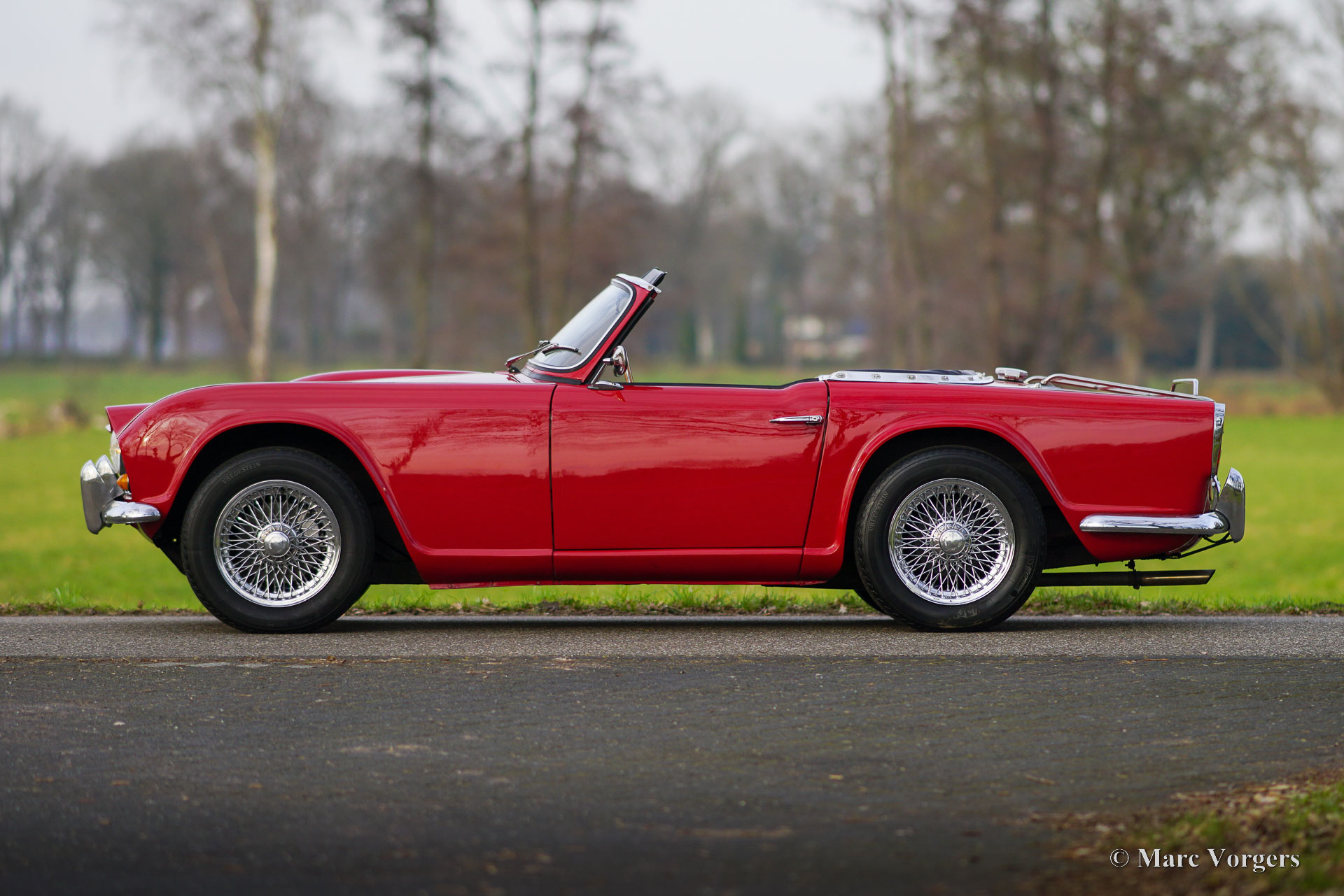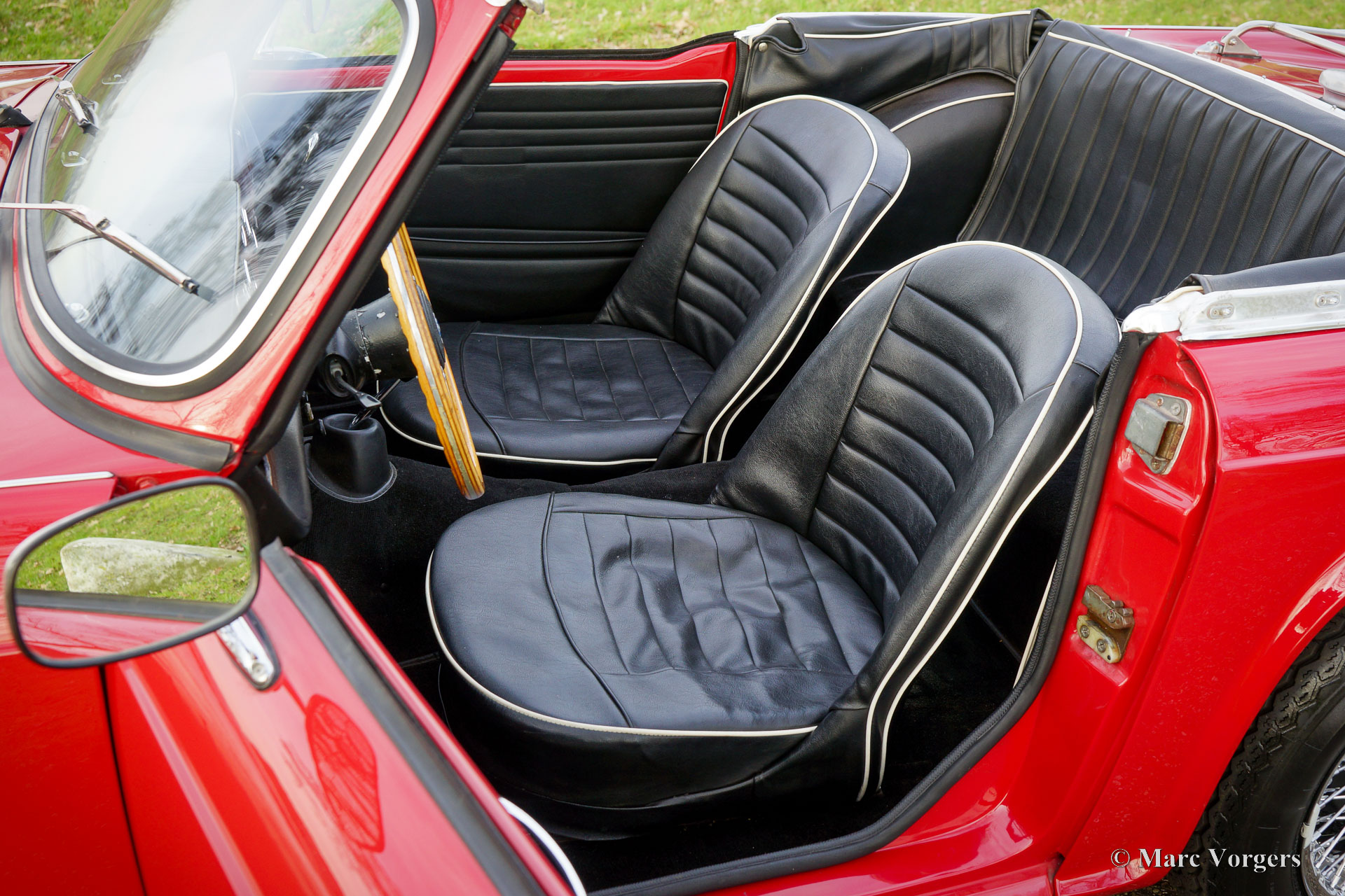 Triumph TR 4, year 1964. Colour red combined with a black leatherette interior trimmed with white piping and black carpet. Black soft-top. This wonderful Triumph TR 4 was sold new in the USA. The automobile was imported to the Netherlands in 1990. From 1990 until 2023 the car has known only one owner! That is quite unique and guarantees that the car has received a lot of love and care. The car was repainted perfectly in the year 2015. Over the years, this TR 4 was very well serviced and maintained, the car is in very good to excellent condition inside and out! The automobile is fitted with chrome wire wheels shod with Vredestein 165/15 tyre, an aluminium cylinder head, a MotoLita steering wheel with wood rim (the original steering wheel is also present), S.U. carburettors, and a Stainless-Steel baggage rack. The car comes with a complete history file and (service) invoices. This Triumph TR 4 A drives and handles delightfully, and it will give the new owner a lot of driving fun. The car is ready to enjoy an early spring and a wonderful summer in your own Triumph with the top down!