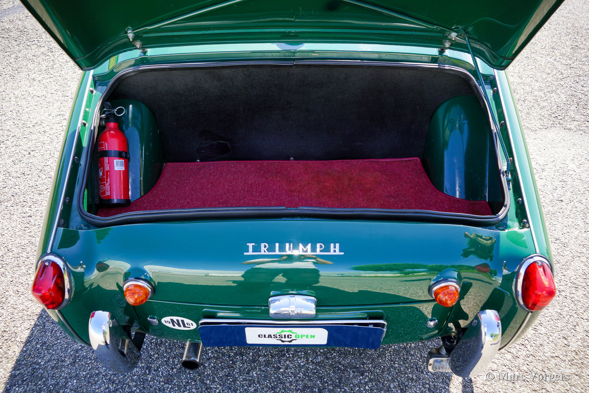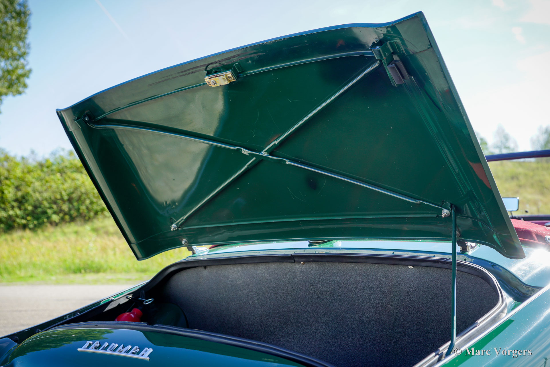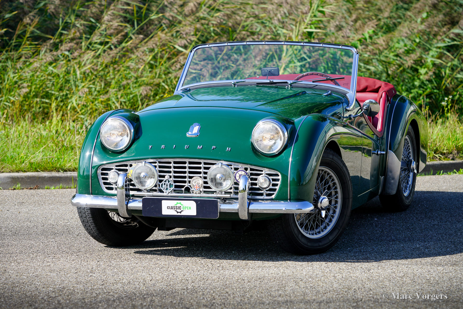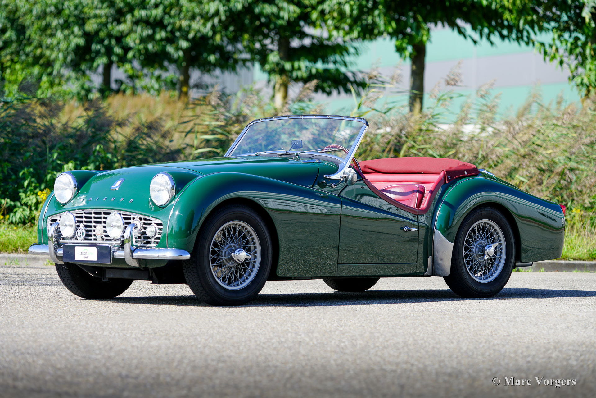 Triumph TR3A, year 1961. Exterior finished in dark green with a dark red leather interior trimmed with white piping and dark red carpet. Black mohair soft top and tonneau cover. This rugged and charming Triumph TR3A was extensively restored about twenty years ago. The car was driven and maintained with care and is still in a superb top condition! During the restoration the mechanical components were also overhauled; everything looks, feels, and sounds perfectly; like the restoration was done in recent years. The Triumph TR3 was the first production car fitted with disc brakes at the front wheels and a rugged sports car with rally and racing pedigree. The powerful 100 bhp four-cylinder engine and it rugged build made the Triumph TR3A serious competitor in the racing and rally scenes of the 1950s and 1960s. The Triumph TR3A stands as a symbol of post‑war optimism: simple, tough, and endlessly fun to drive. This example is fitted with silver painted wire wheels, Lucas wide-beam fog/cornering lamps, overdrive, power brakes, inertia reel safety belts, an electric cooling fan and a MotoLita sports steering wheel with wood rim. The steering wheel still features the original centre part with turn signal switch and horn push button. This gorgeous and well sorted example drives and handles like a dream and offers an exhilarating vintage open top driving experience!