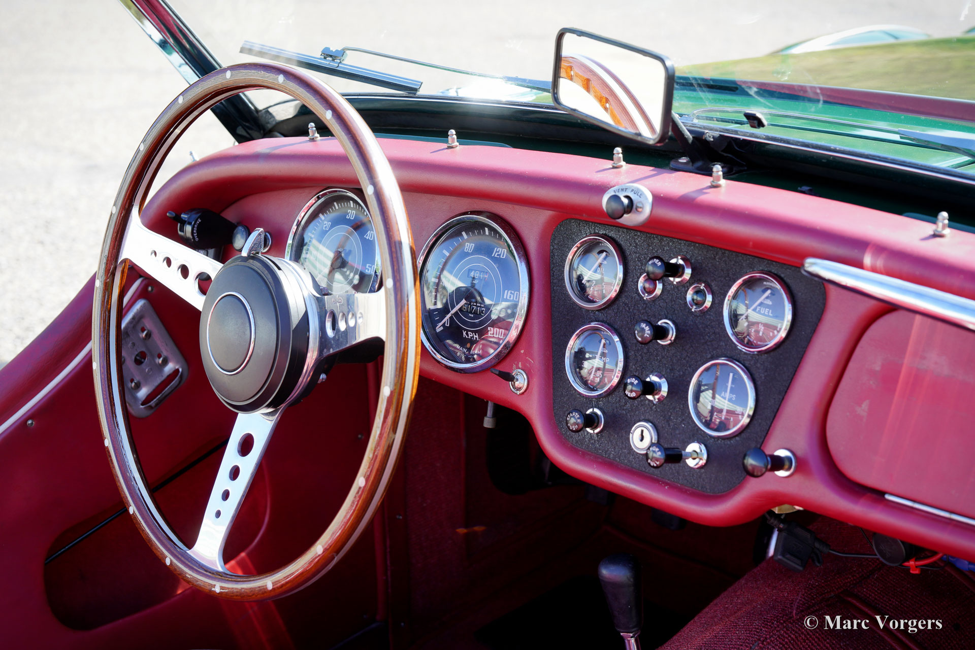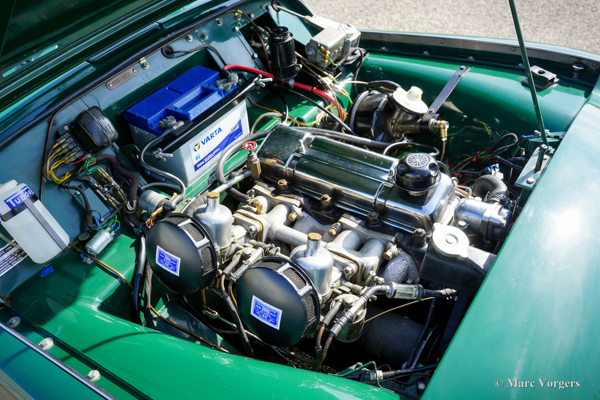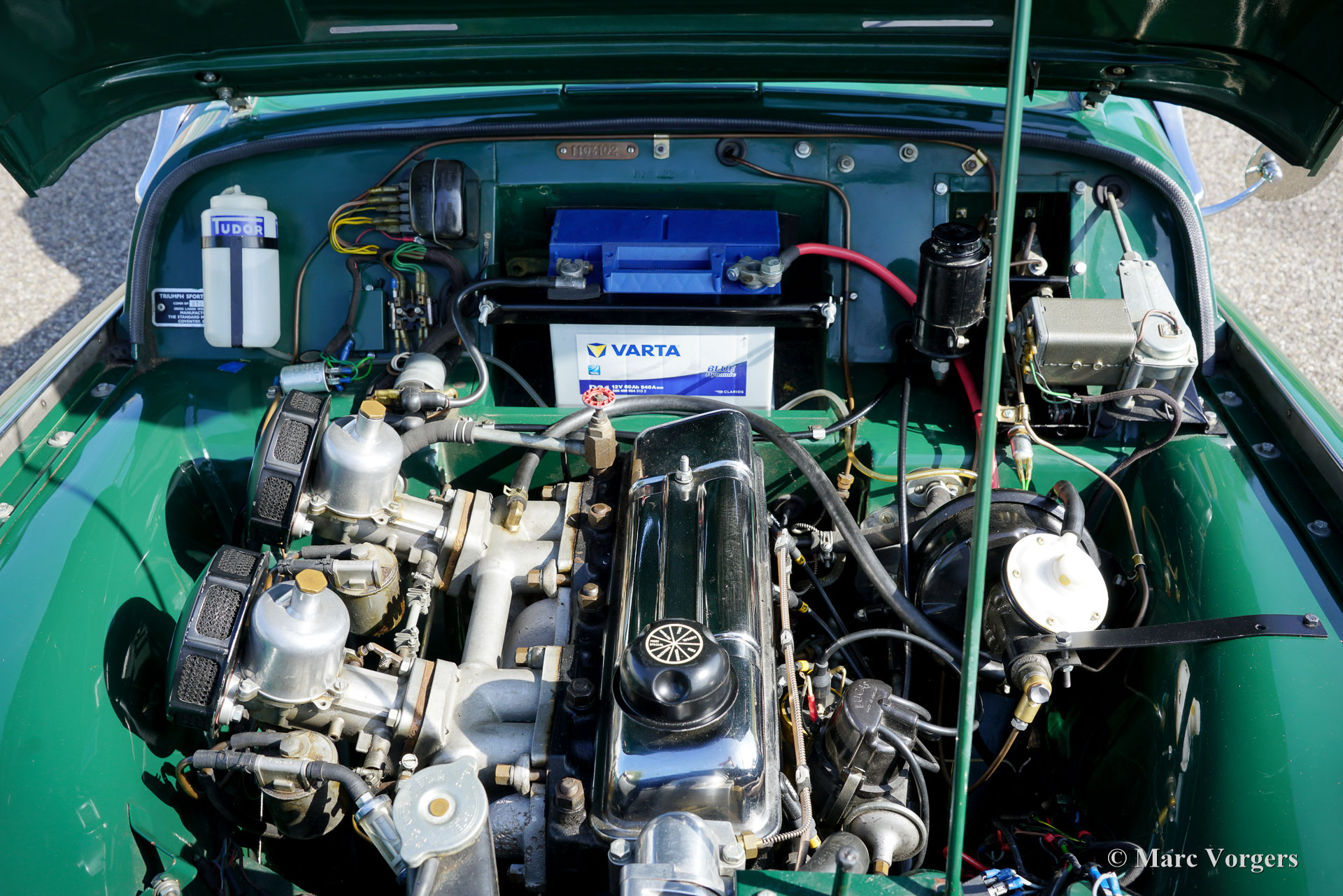 The Triumph TR 3 is a no nonsense sports car; very robust, simple and reliable, a true British sports car all over. The TR 3 was the first production car, off factory, equipped with disc brakes on the front-wheels. The engine was a Standard Vanguard based, cast-iron, long stroke, in-line four cylinder with a displacement of 1991cc. The TR 3 engine was equipped with two carburettors giving a power-output of almost 100 bhp.
