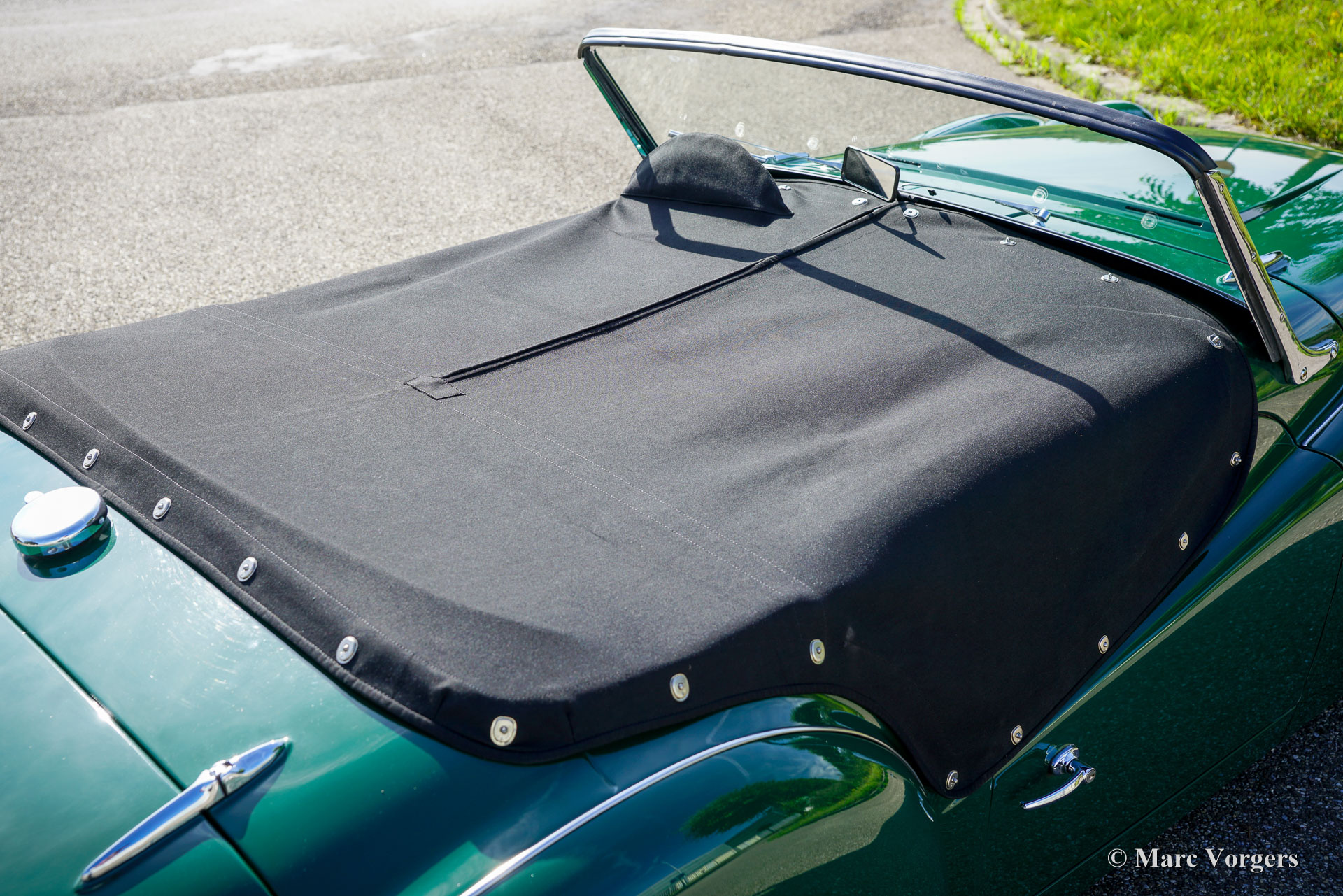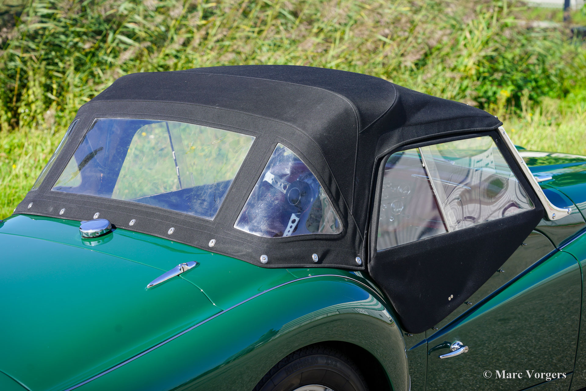 The Triumph TR 3 was uprated twice during the entire production period. In 1957 the car became a wider grille, door handles on the outside and slightly recessed headlamps and was named TR 3a then. In 1960-61 the cylinder capacity was enlarged to 2138 cc. giving a capacity of 104 bhp. and extra torque. Also the fully synchronized TR4 gearbox was incorporated. The car was then named TR 3b. The TR 3 is a pure two-person roadster, a classic generously giving you the fifties British sports car feeling, rough but honest. It comes with a simple soft-top for weather protection. Separate clip-on side screens can additionally be attached to the doors.