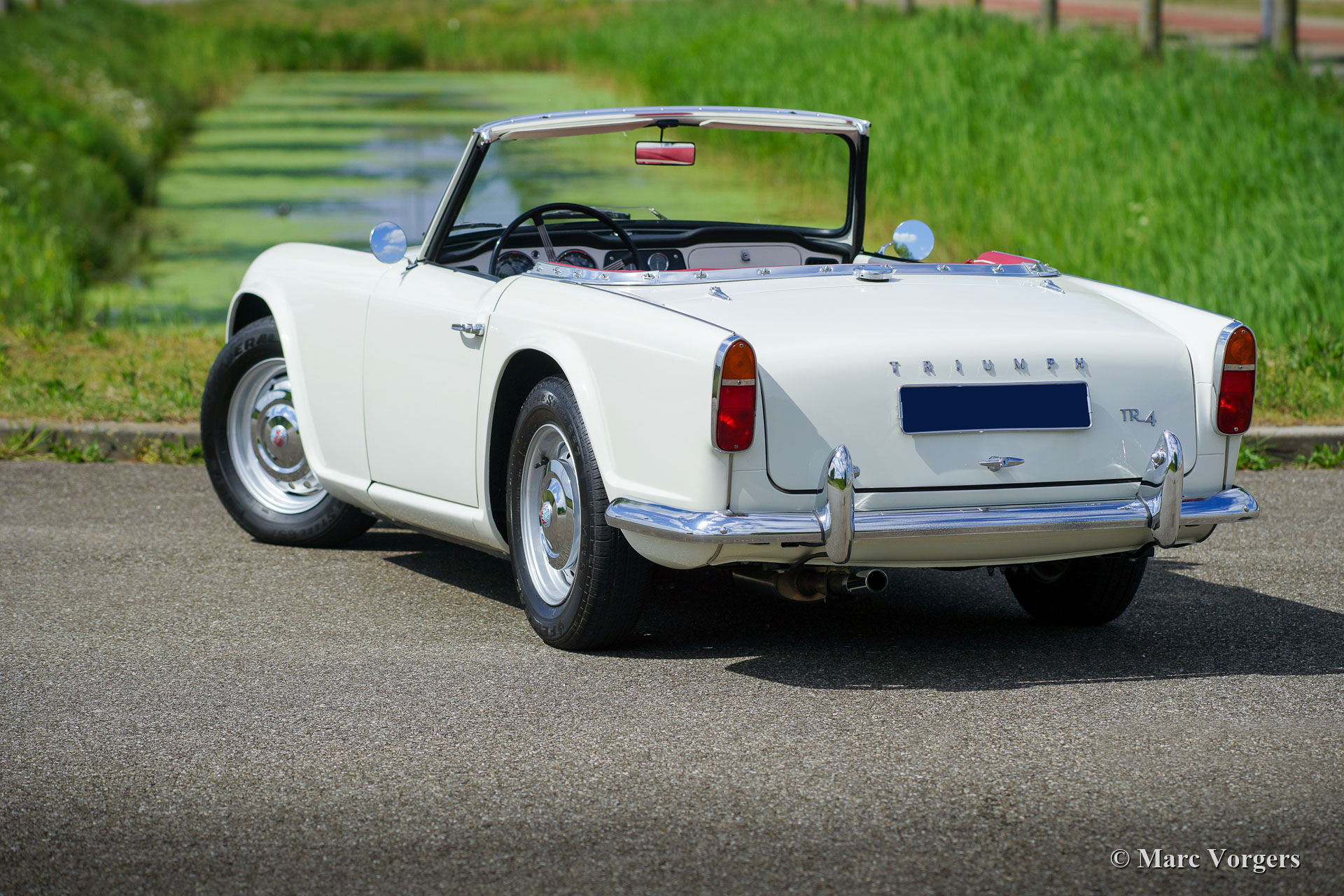 Triumph TR4, year 1966. Colour Triumph white combined with a red leather interior trimmed with white piping and red carpet. This gorgeous Triumph TR4 is a highly desirable early example with the wonderful metal dashboard. The TR4 was beautifully restored to original specifications, the car is in top condition, concours! The car shows all the original details. The 2138 cc four-cylinder engine runs perfectly! This Triumph TR4 is a ‘must have’ for the person looking for an immaculate early Triumph TR4!