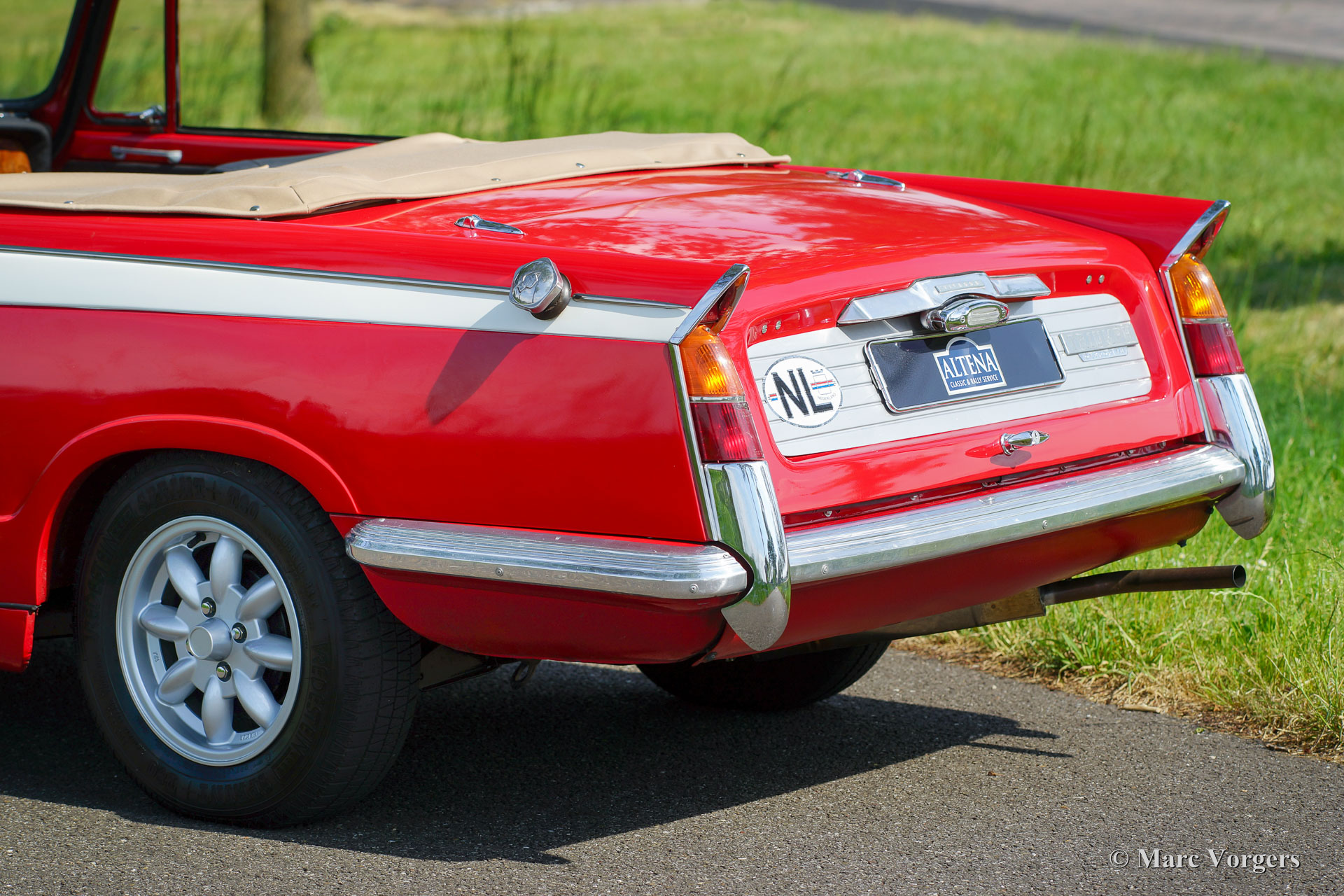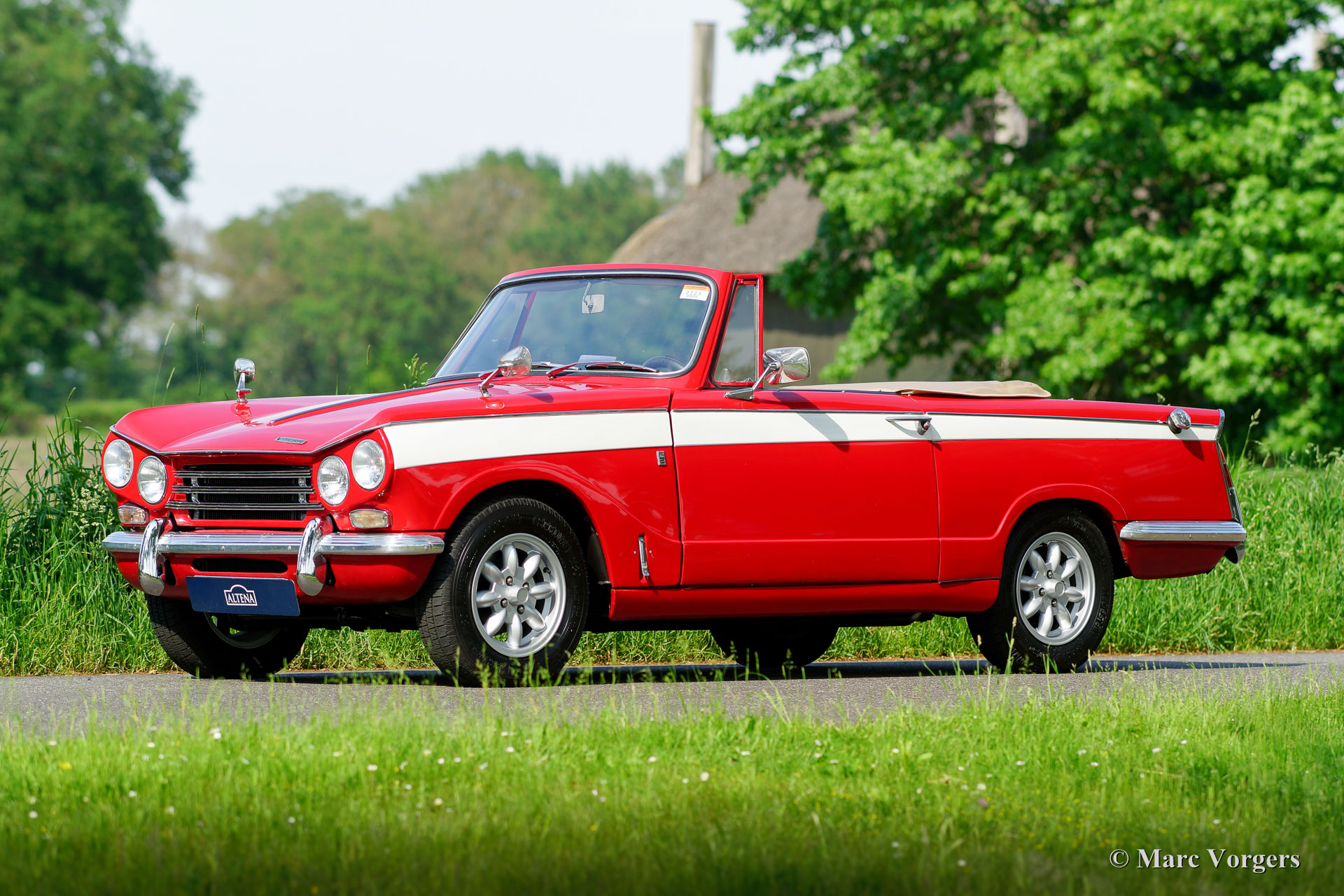 Triumph Vitesse Mk II, year 1969. Colour red with a creme white contrasting stripe on the sides. Black leather interior, black carpet, beige mohair hood and a beige mohair tonneau-cover. The Triumph Vitesse is the quite rare six-cylinder convertible which is based on the Herald series. The car was designed by Giovanni Michelotti. The presented Triumph Vitesse was extensively restored a few years ago in the Netherlands, the automobile is in excellent condition and the car drives delightfully! This is a RARE left-hand drive (LHD) model! The car does not have matching numbers, the engine was exchanged in the past. The Triumph Vitesse is a compact convertible which offers space for four people! The car features a smooth running 2-Litre six-cylinder engine mated to a four speed manually operated gearbox and overdrive. Furthermore, the car is fitted with beautiful Minilite-style alloy wheels and a MotoLita sports steering wheel with leather rim. This is a highly desirable convertible to be enjoyed by the entire family!