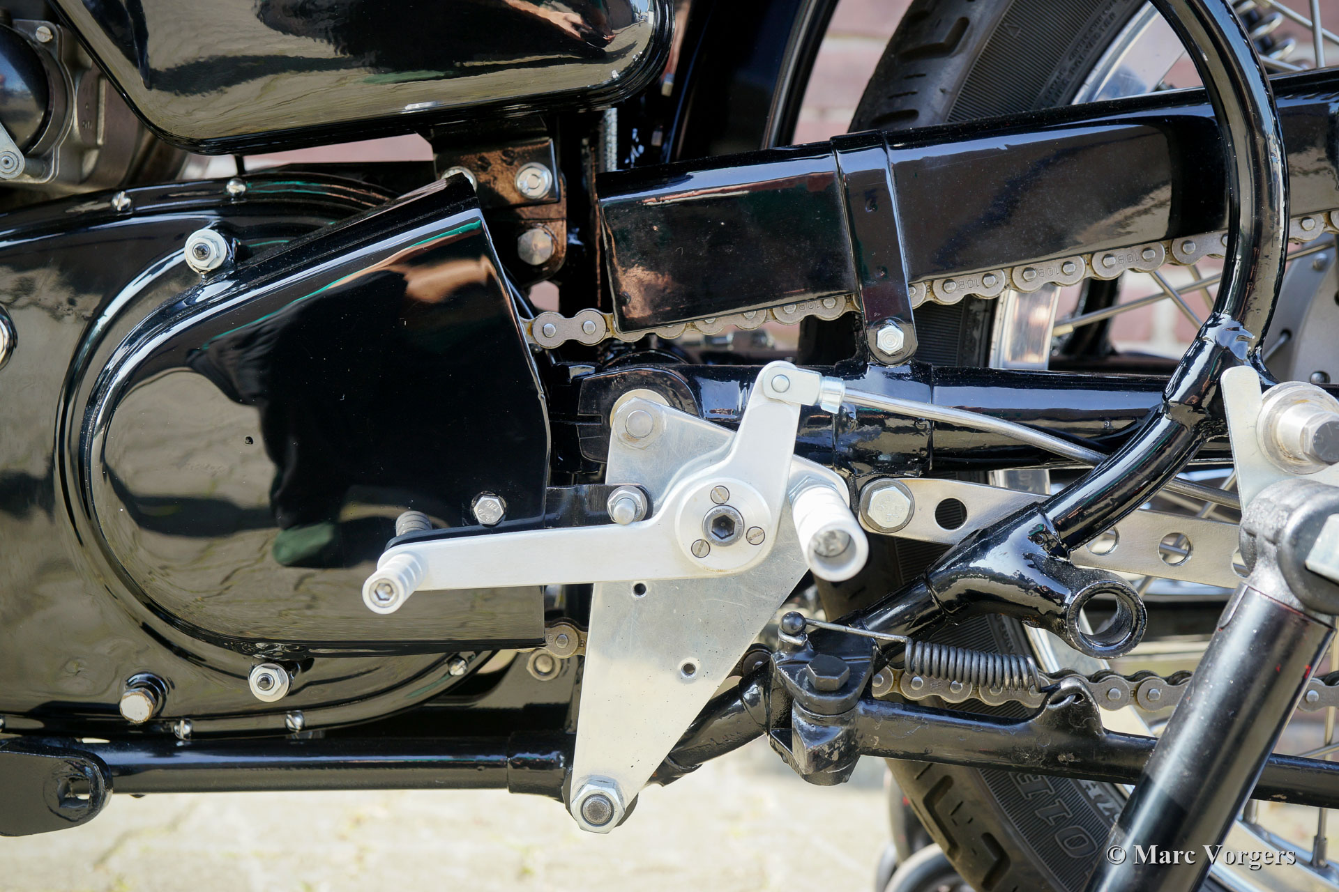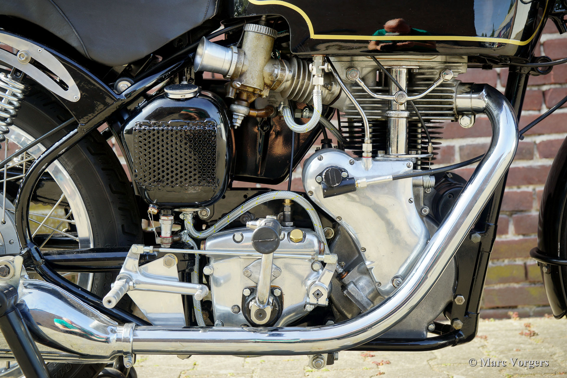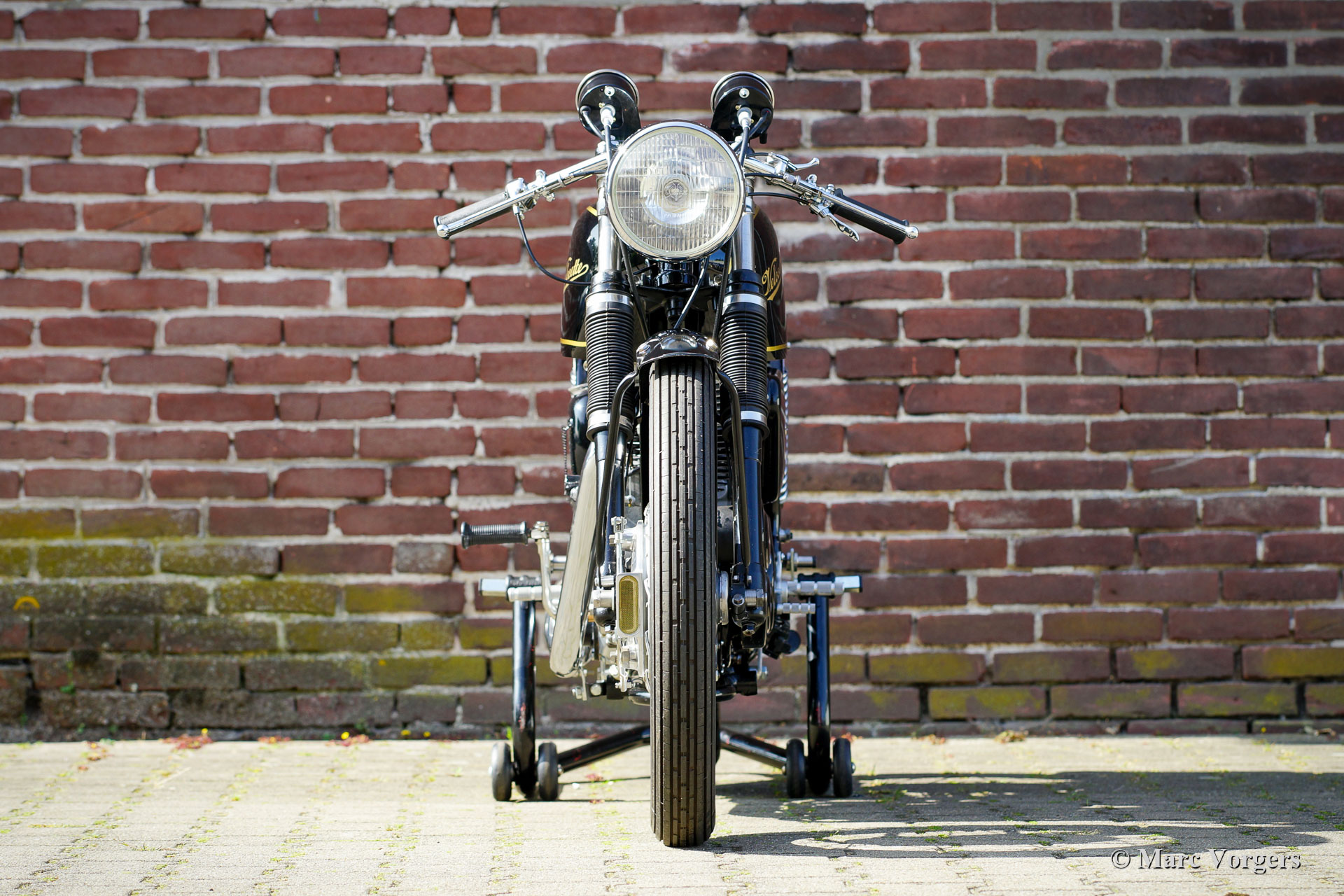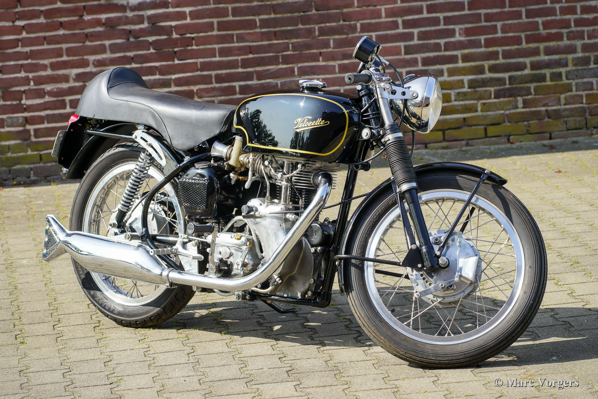 Velocette Venom Thruxton 500cc, year 1963. Colour black with gold. Velocette is one of the legendary British motorcycle marques. Velocette have won many victories in the history of motor racing and the machines were highly successful in the thrilling ‘Manx’ TT races on the Isle of Man. The Venom Thruxton is one of their last designs. The Venom Thruxton features a powerful single cylinder 500 cc four stroke engine with overhead valves. This Velocette Venom motorcycle was fully restored, overhauled and rebuilt to Thruxton specifications and to the highest standards. In the mid-1960s the engine was used by the renowned Dutch motorcycle racer Jan Strijbis who was the last racer to compete in a TT on a Velocette in 1976. The engine was rebuilt with new parts to the Strijbis racing specifications. Fitted are a Thruxton cylinder head with 2-inch inlet valve, Thruxton Racing camshafts, racing clutch with 20 springs, a GP2 Amal racing carburettor. The gearbox is a Thruxton close-ratio unit. The special racing crankshaft, connecting rod and piston were balanced and blueprinted. This engine runs impressively powerful and it is suitable for street and circuit use. The motorcycle shows the fantastic original Velocette Venom and Thruxton details like the special petrol tank, the oil-tank with heat shield, the large front drum brake and the aluminium rims with Stainless-Steel Spokes. This rare Velocette Venom Thruxton looks a picture, and it will be an eye catcher on every historic motorcycle meeting. These Velocette motorcycles are very hard to find, a true collector’s item!