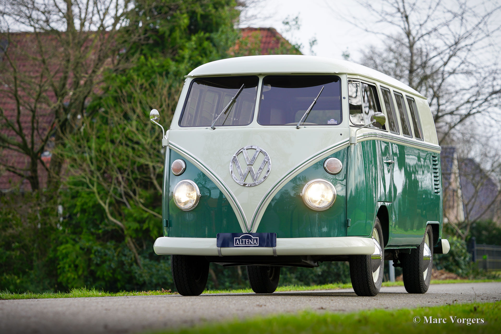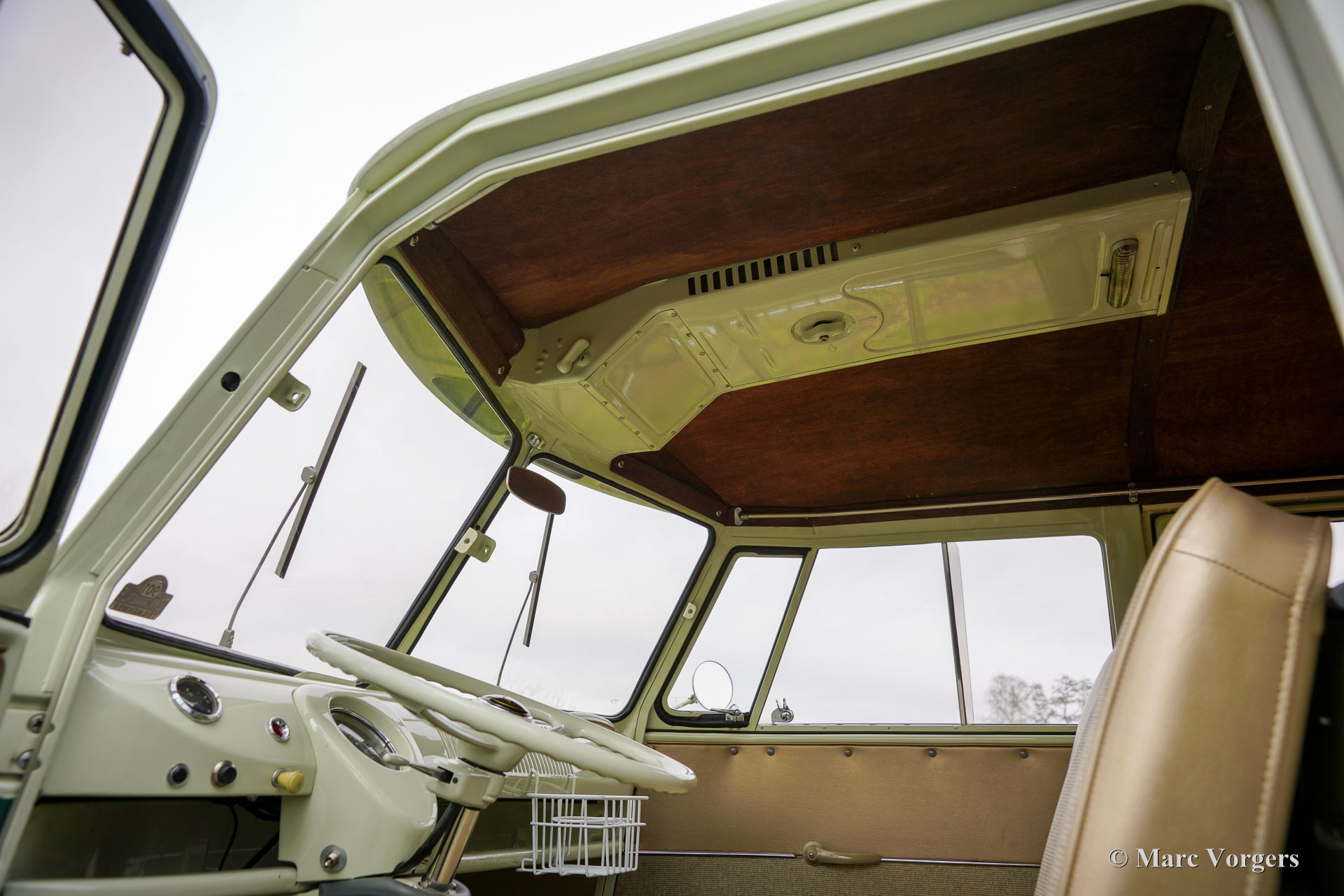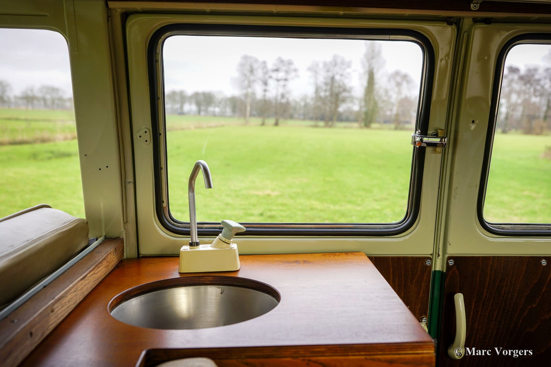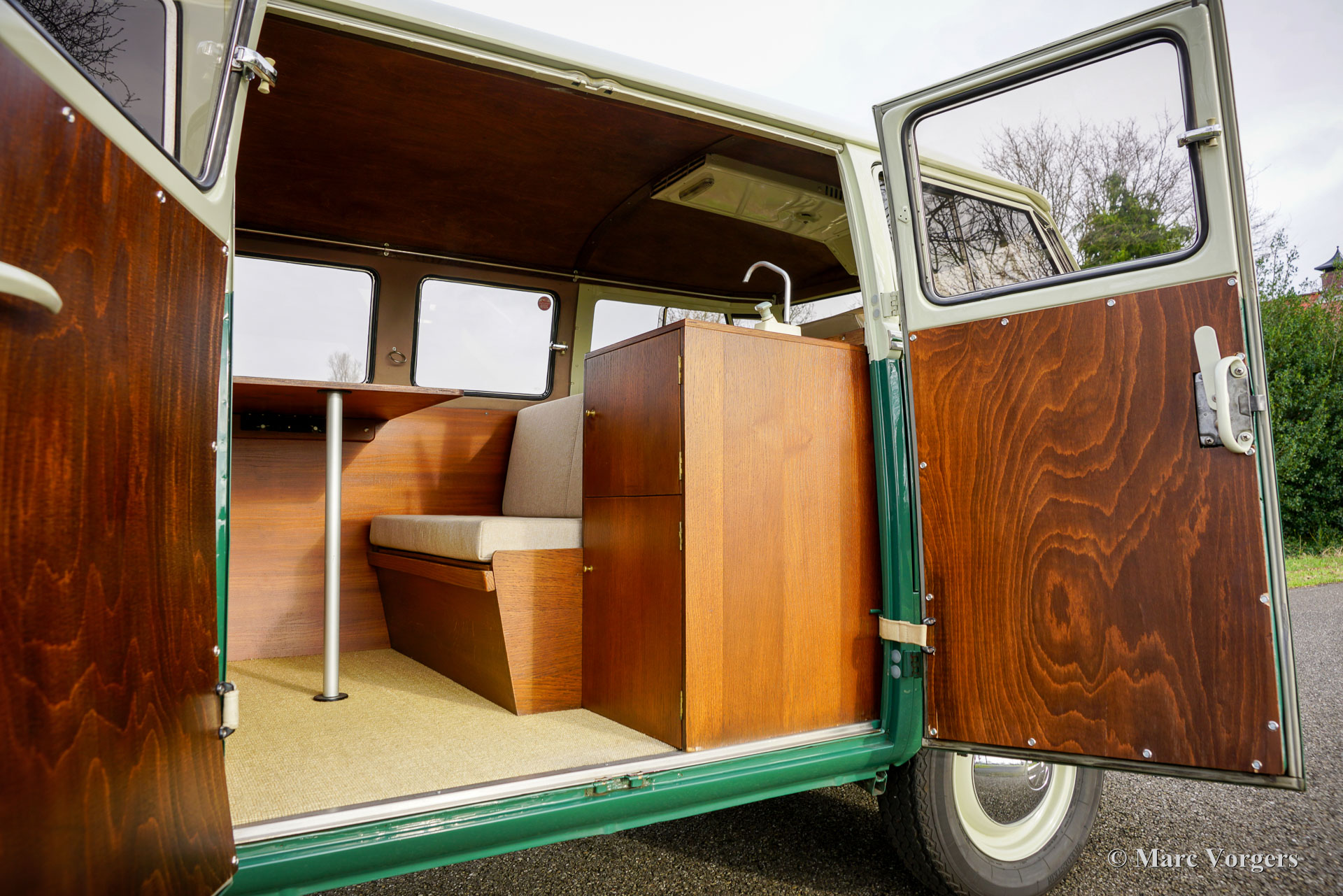 Volkswagen Type 2 T1 ‘Sundial’ Camper, year 1964. Colour: Creme white over green. Cream white wheels, dashboard, and steering wheel. Beige with light beige vinyl interior upholstery. This gorgeous VW Type 2 T1 Transporter was built in the Hannover Volkswagen factory. The T1 panel van was delivered new in the USA where it was converted to a camping vehicle by the firm of Sundial. In the year 2001 the VW Camper was sold to Ireland, in 2013 the car found a new owner in Germany. In Germany the car was extensively restored to very high standards by a specialist firm in the period 2018-2019. Costs nor effort were spared aiming for perfection. The bodywork was wonderfully restored, the interior was completely renewed, and the mechanical components were overhauled. During the restoration the original 30 bhp engine was replaced by a more powerful 80 bhp variant. Of course, technical upgrades were incorporated to cope with the additional power and speed potential. The steering gear was improved, and disc brakes were added at the front wheels (a very expensive conversion) for additional stopping power and safety. This VW Type 2 T1 drives and handles much better than a fully original example, and it offer a lot more driving fun! This Volkswagen Type 2 T1 Camper has the looks, the ‘oomph’ and the necessary safety upgrades. Some of you may be confused by the designation Type 2 T1; the VW ‘Beetle was the first Volkswagen model, the Type 1. The Transporter or Microbus was the second model, the Type 2. The first Transporter model was the T1 produced between 1950 and 1967. This unique vehicle comes with a large history file; a unique opportunity to buy a superbly restored/looking/driving Volkswagen Type 2 T1 Camper!