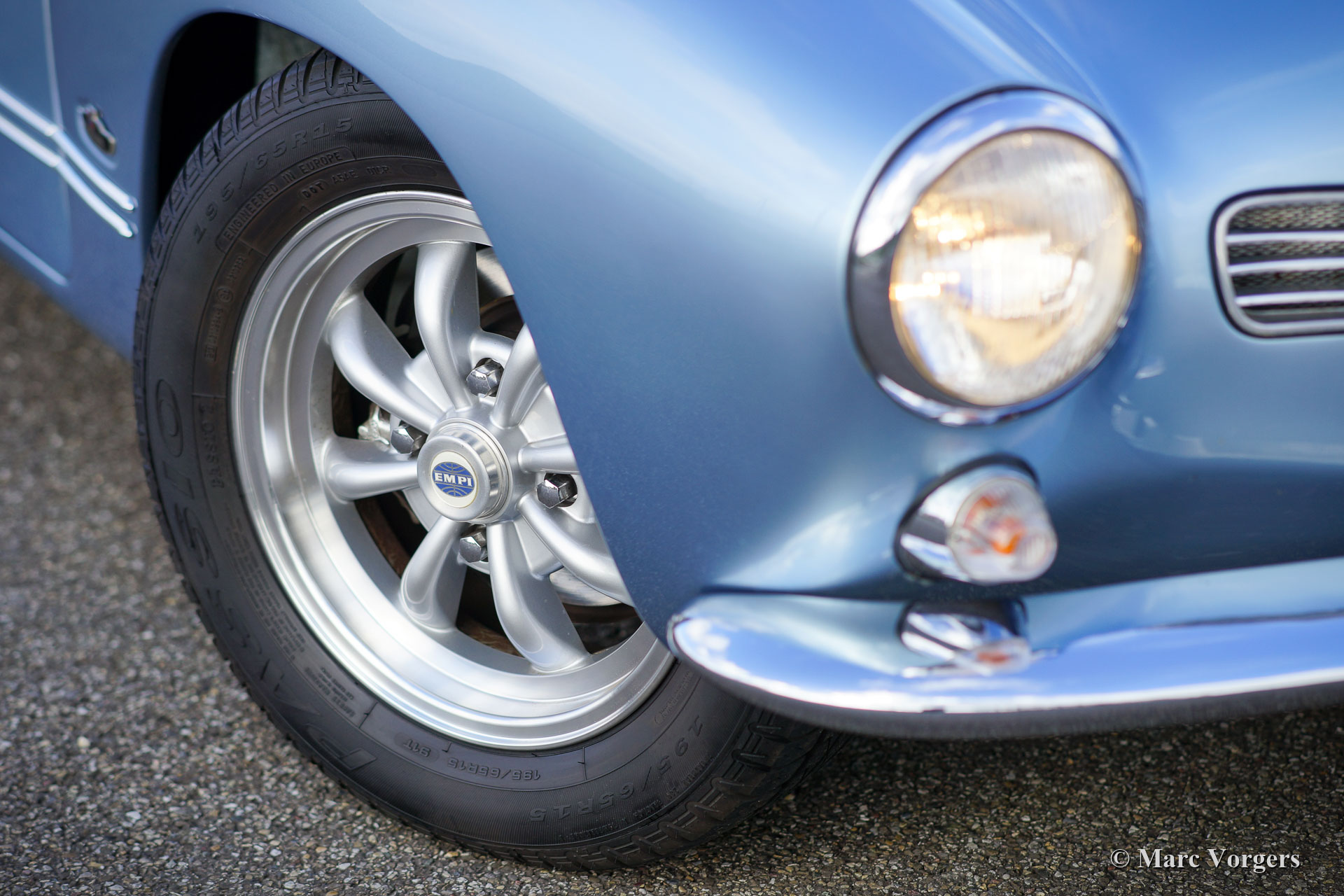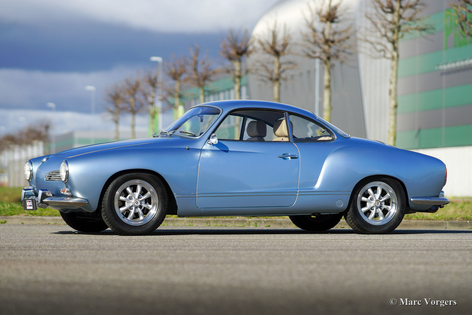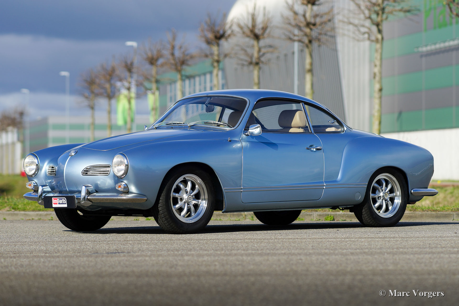 Volkswagen Karmann Ghia Coupé, year 1967. Colour pale blue metallic combined with a light beige leather interior, light beige carpet and dark grey protective mats. This gorgeous Karmann Ghia Coupé was extensively restored, overhauled, and modified, the car can be placed in the current “outlaw” cult of improving the exterior, interior and mechanicals of a classic car to a higher and more modern standard. The bodywork of this VW Karmann Ghia was given much wider fenders which looks truly special. The gorgeous shape and lines of the car are accentuated by the wonderful and perfect light blue metallic paint and the chrome trim. The interior was upgraded with better seats and full leather upholstery. In the super clean engine compartment, you will find a powerful 2.4 litre air-cooled VW engine. Looking closely, you will see many wonderful details! This fine Karmann Ghia was also upgraded with a modern USB / Bluetooth radio, an automatic antenna and a central locking system which can also open the boot. The car is fitted with a classic style sports steering wheel with a wood rim and “Wolfsburg” logo, and beautiful EMPI alloy wheels. This Karmann Ghia is a perfectly built and modified “outlaw” and the car drives superbly! A unique and gorgeous VW Karmann Ghia on which costs nor effort were spared to reach perfection!
