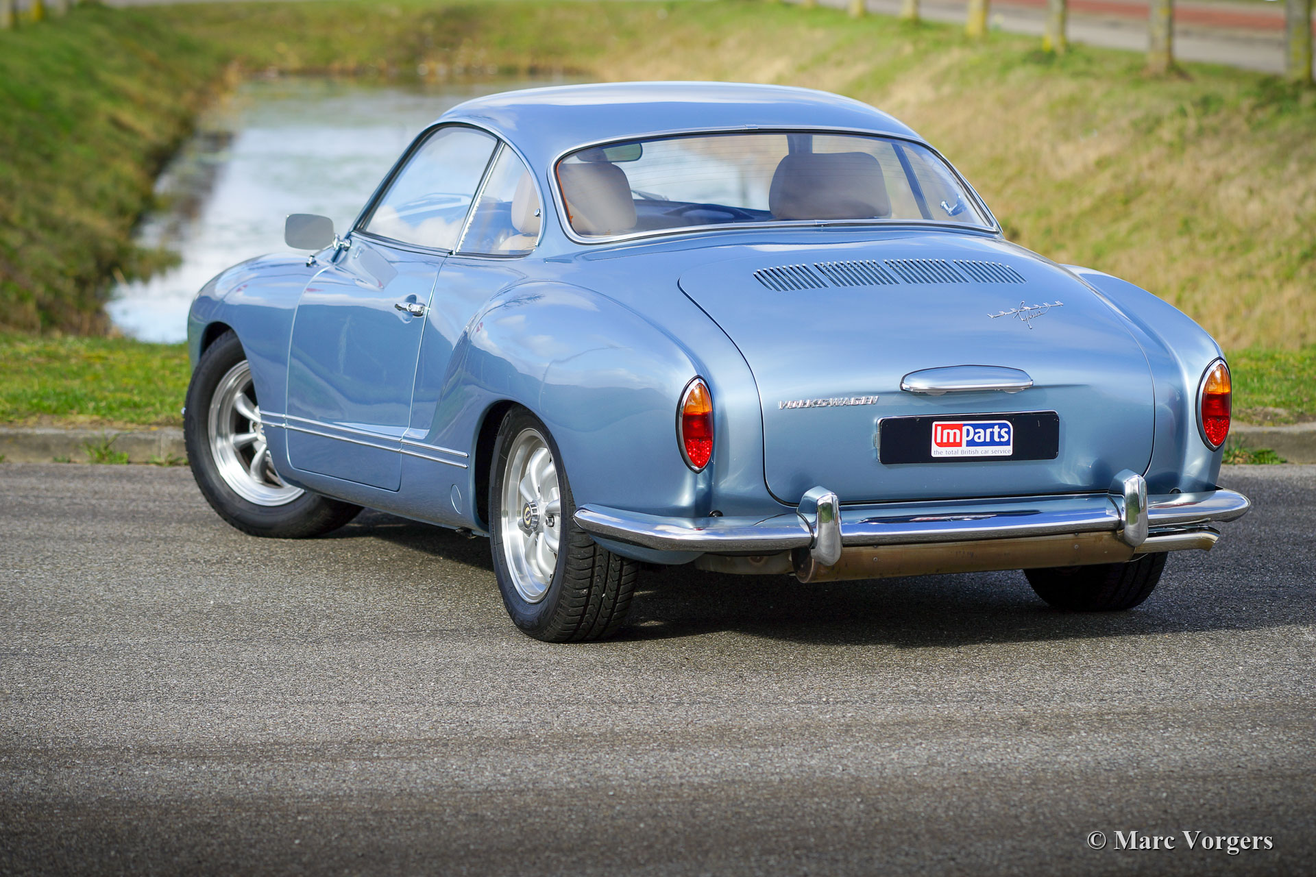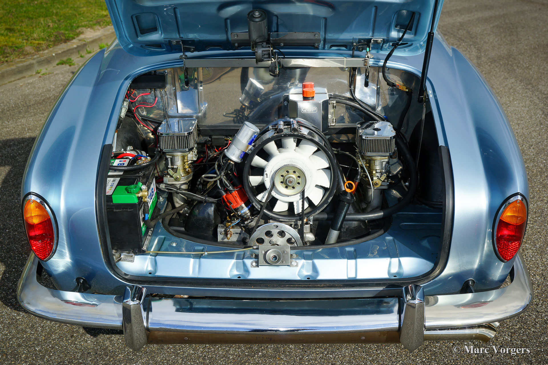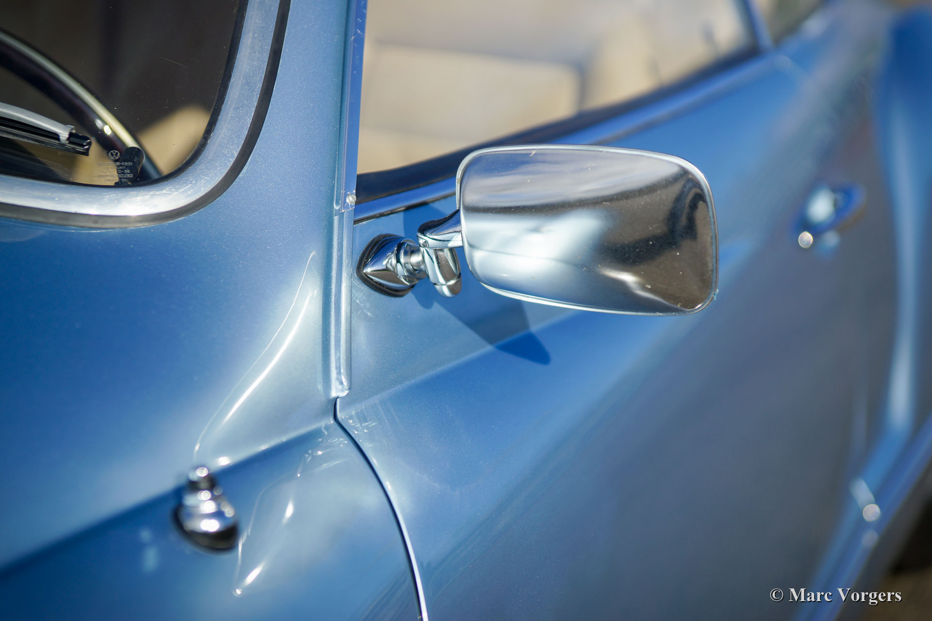 Volkswagen Karmann Ghia Coupé, year 1967. Colour pale blue metallic combined with a light beige leather interior, light beige carpet and dark grey protective mats. This gorgeous Karmann Ghia Coupé was extensively restored, overhauled, and modified, the car can be placed in the current “outlaw” cult of improving the exterior, interior and mechanicals of a classic car to a higher and more modern standard. The bodywork of this VW Karmann Ghia was given much wider fenders which looks truly special. The gorgeous shape and lines of the car are accentuated by the wonderful and perfect light blue metallic paint and the chrome trim. The interior was upgraded with better seats and full leather upholstery. In the super clean engine compartment, you will find a powerful 2.4 litre air-cooled VW engine. Looking closely, you will see many wonderful details! This fine Karmann Ghia was also upgraded with a modern USB / Bluetooth radio, an automatic antenna and a central locking system which can also open the boot. The car is fitted with a classic style sports steering wheel with a wood rim and “Wolfsburg” logo, and beautiful EMPI alloy wheels. This Karmann Ghia is a perfectly built and modified “outlaw” and the car drives superbly! A unique and gorgeous VW Karmann Ghia on which costs nor effort were spared to reach perfection!