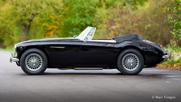 Austin Healey 3000 MK III phase 2, year 1967. This Austin Healey has ‘Matching numbers & colours’, the technical components and the exterior/interior colours are original from the factory: A British Heritage Certificate (September 30, 2008) is present to confirm this. The body is finished in black, combined with chrome wire wheels, a black vinyl convertible top and hood cover. The interior is upholstered with red leather, red vinyl door panels, a red vinyl dashboard, black carpet and black rubber mats. On September 10, 2025, this beautiful Austin Healey was imported to the Netherlands, fully checked and brought up to date. This 'Big Healey' is in a very good and beautiful condition and the car drives and sounds perfect! The car is ready to be enjoyed to the fullest!