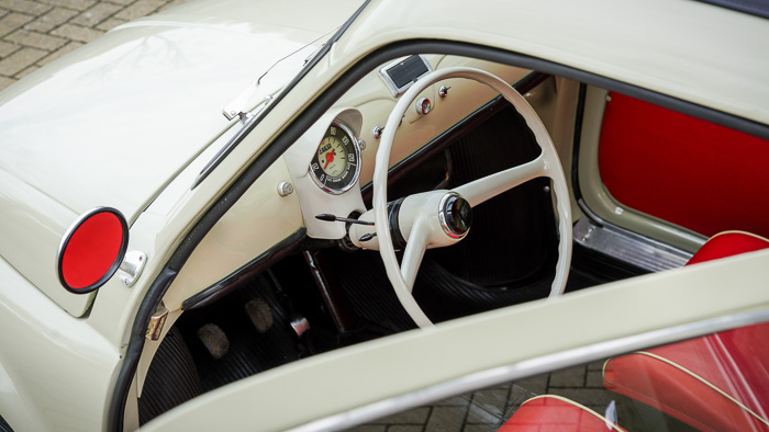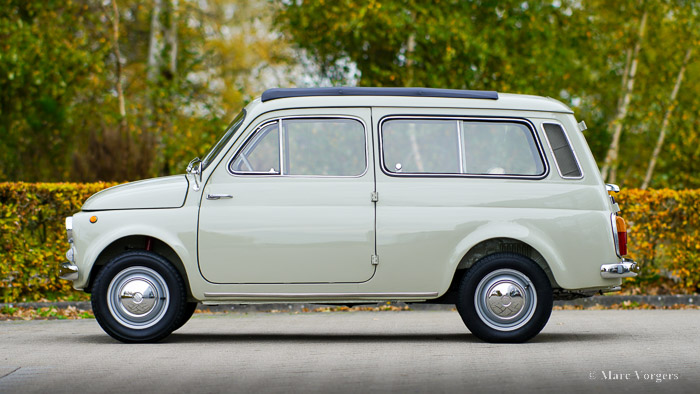 Fiat 120 Nuova 500 Giardiniera, year 1965. Body colour warm grey (beige) combined with a red/cream faux leather (vinyl) interior trimmed with black rubber carpet. This beautiful Fiat 120 Nuova 500 Giardiniera was sold new in Southern Italy, where it stayed until recently. After an extensive service in Italy, including a brake service, the car was sold to the Netherlands. This Fiat Nuova 500 Giardiniera is in an excellent condition! The odometer reads 82,796 kilometers. The body looks brand new and has been beautifully restored/repainted in the past; the interior is in a beautiful and excellent condition. The engine compartment looks as if the car left the factory two years ago. This beautiful Fiat 500 Giardiniera shows all original details and the car drives and handles very well!