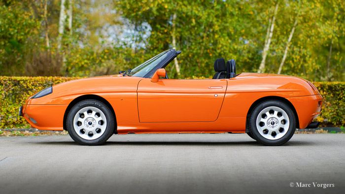 Fiat Barchetta "Black Edition," year 2000. Body colour orange (Arancio Victoria 570) combined with a black/anthracite cloth/leather interior and black carpet with orange trim. Black vinyl soft-top and a body-coloured hard-top. This beautiful Fiat Barchetta "Black Edition" was sold new in the Netherlands by Autohuis Ede van Wirdum. From day one, the car has been cherished by three successive owners and has 87,574 kilometers on the clock. This "Black Edition" car is equipped with a special options package consisting of contrasting (black) interior trim on the doors and floor mats, black roll bars, a black front logo, alloy wheels, etc. This beautiful example has been professionally repainted in the past; the car looks and feels truly like new! The maintenance history is fully known and documented. The maintenance log was punctually completed and stamped up to the last service at 87,062 kilometers. More information on the website.
