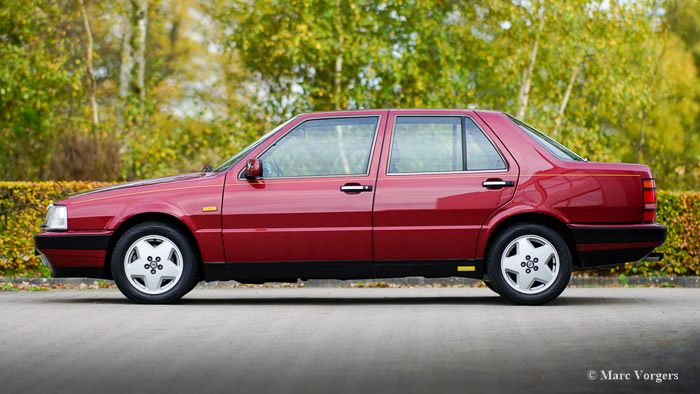 Lancia Thema (Ferrari) 8.32, year 1988. Exterior in red metallic (Rosso Winner 179/F) combined with a black leather interior by Poltrona Frau and grey carpet. The Lancia Thema is a beautiful four-door sports sedan, equipped with a 215 bhp Ferrari 3-liter V8 engine with 32 valves (8.32) and a luxurious full leather interior by Poltrona Frau. From 1986 until 1992 only 3,971 units were built, making the Lancia Thema 8.32 a rare collector's car. This beautiful example was sold new in Germany and has been kept in a collection. The odometer reading is currently 67,087 km. The last owner kept a logbook in which the kilometers driven are recorded. This magnificent Lancia Thema 8.32 is in an excellent and super original condition, with only the smallest traces of use; a collector's dream!