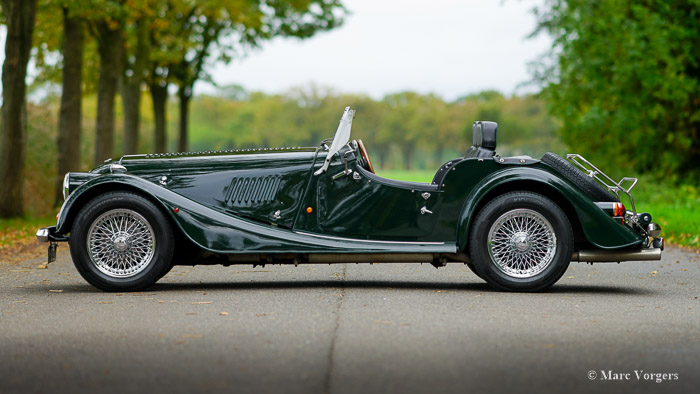 Morgan 4/4, 1998. Body painted British Racing Green, combined with a black vinyl soft top and tonneau cover. Black leather interior trimmed with green piping and black carpet. This beautiful Morgan 4/4 was sold new in the Netherlands and has 81,000 kilometers on the clock since day one. The 1800cc Ford Zetec 16V engine delivers 121 hp and 162 Nm of torque, giving the 860-kilogram Morgan 4/4 exceptional performance! This example is in excellent condition and has a complete service history dating back to new. The car is equipped with wide chrome wire wheels, a chrome luggage rack, an umbrella holder above the rear bumper, two chrome door mirrors, and a sports steering wheel with a wood rim. This Morgan 4/4 is a fantastic driver's car for anyone who truly appreciates the art of driving. More information on the website.