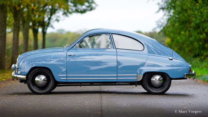 Saab 93B Granturismo 750, 1959. Blue exterior combined with a blue/green vinyl/cloth interior finished with silver piping. This very special Saab Granturismo 750 comes from the rare second "B" series, of which only four are known to exist! The Saab was sold new in the US, where it was registered in 1959. In 2018, the Saab was shipped to the Netherlands, where it was extensively and perfectly restored to its original factory specifications. No expense or effort was spared to achieve perfection. The bodywork was stripped down to the bare metal and restored, the interior was reupholstered with the correct materials, and the mechanical components were overhauled by professional specialists. This rare example is in superb, top-notch condition and will appeal to discerning collectors.